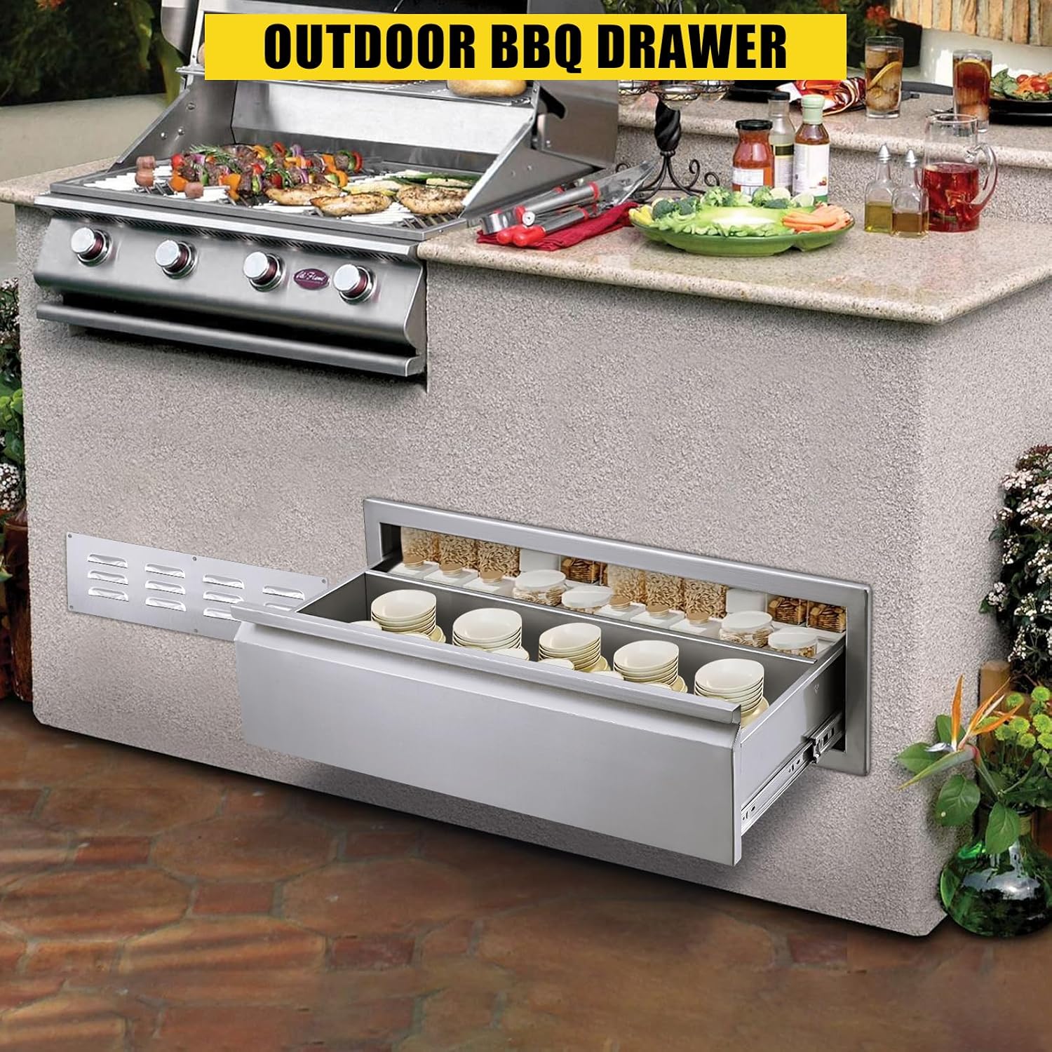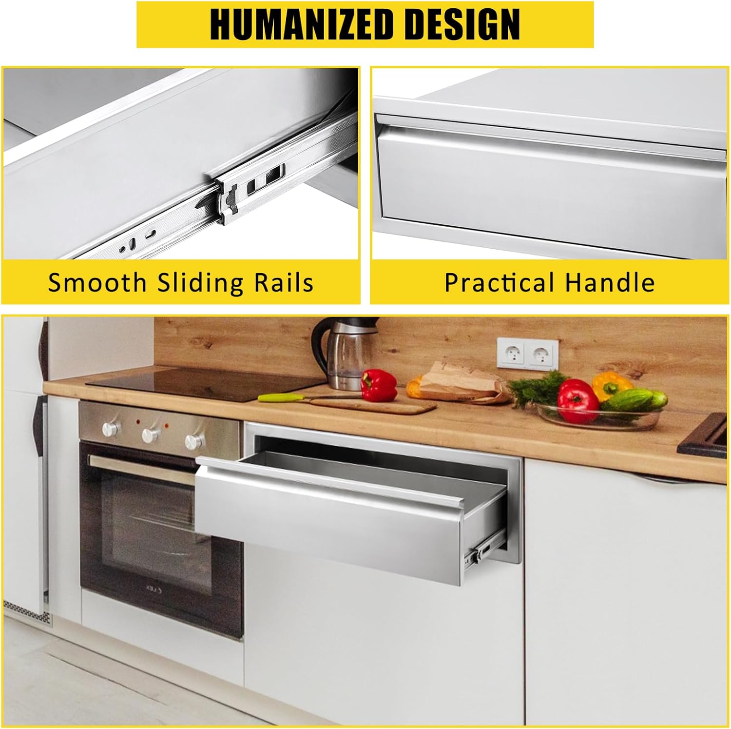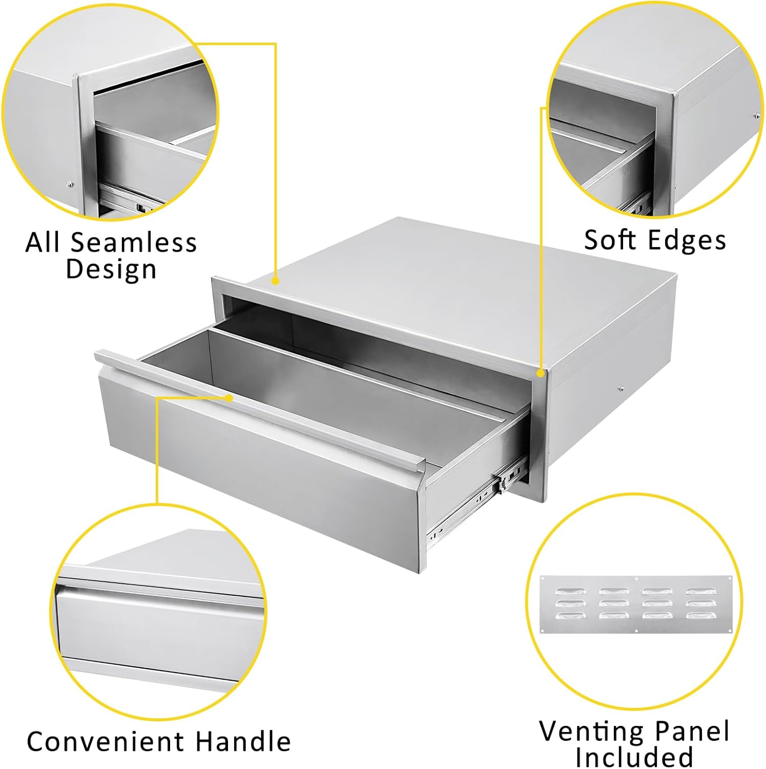 - – Weatherproof Design: Featuring a rainproof, windproof, and debris-proof design, The stainless steel BBQ drawers keep your items safe and clean. The seamless corners and soft edges enhance safety and prevent accidental injuries.