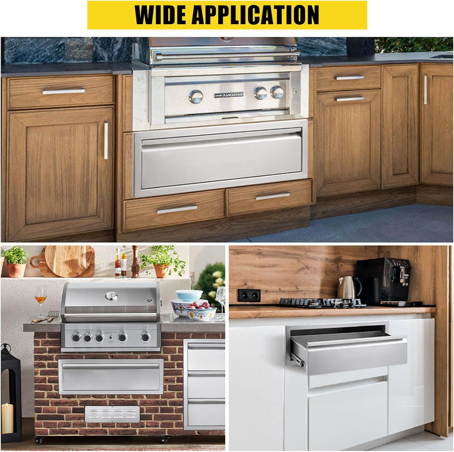 - – Wide Application: The brushed finish technology adds a touch of elegance to your outdoor kitchen island or patio grill station. They have ample space to store various kitchen utensils such as dishes, forks, and spoons. Application widely used in the indoor outdoor kitchen, such as tableware, into the cabinet, lockers.