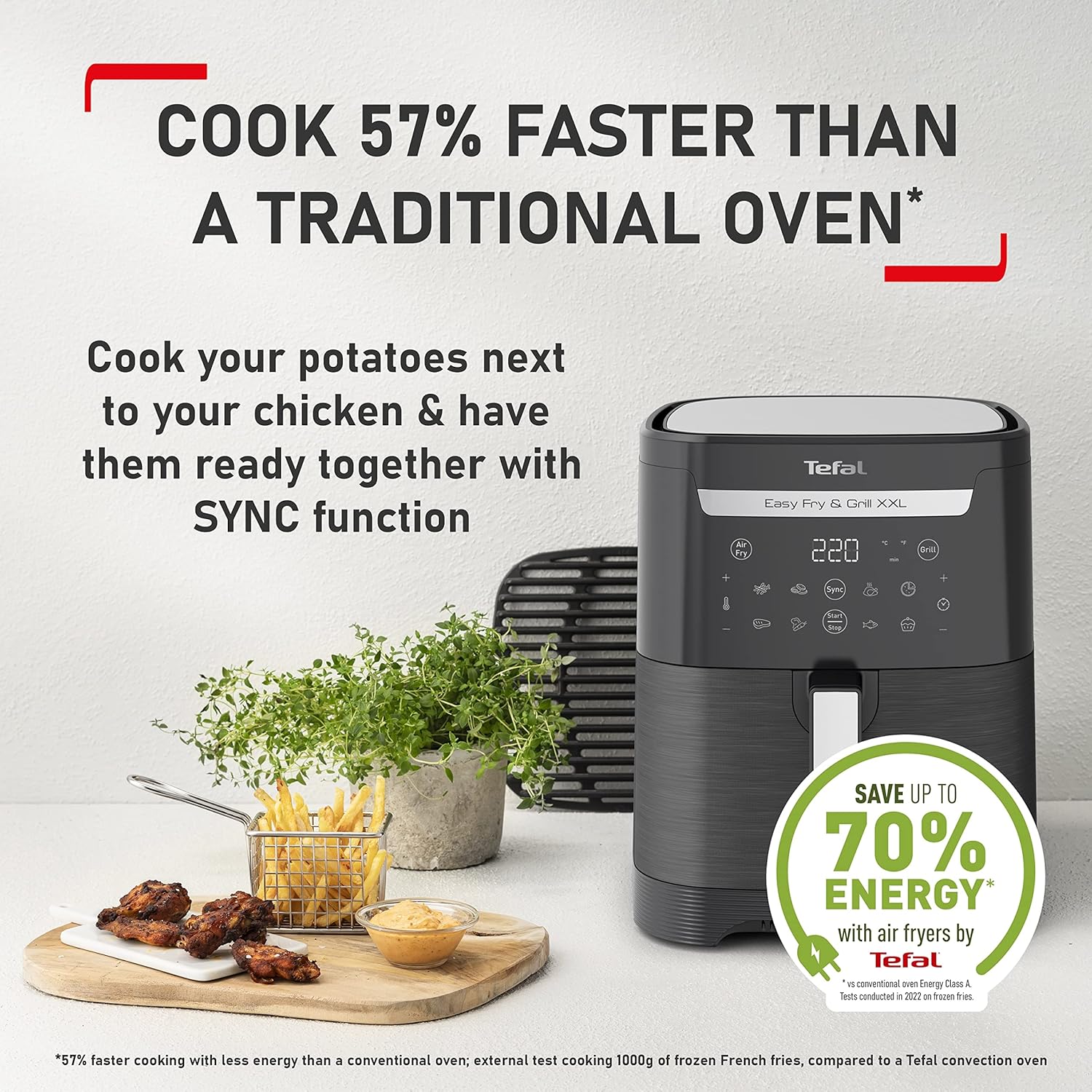 SWITCH IT UP: Easy Fry XXL 2-in-1 is a single and dual zone air fryer in one! Add the drawer divider to go from one XXL zone to two smaller zones to cook a meal in one go. Cook potatoes next to chicken and have them ready together thanks to SYNC mode