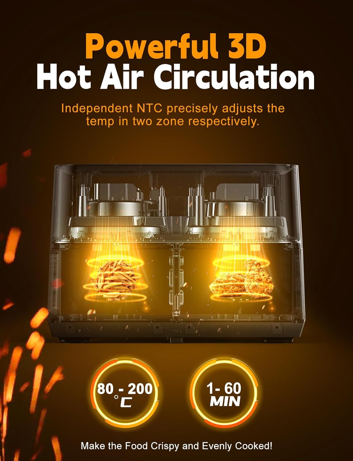 🍕 PRECISE TEMPERATURE CONTROL FOR CRISPY AND JUICY TASTES: With a temperature range of 50 to 200°C and a time setting of 1 to 60 minutes, this air fryer has a built-in smart chip and temperature sensor that adjusts the temperature of each frying basket in precise 1°C increments, ensuring that you’ll be able to cook everything from succulent wings and crispy pizzas to steaks, cakes, or a whole roast chicken! Food!