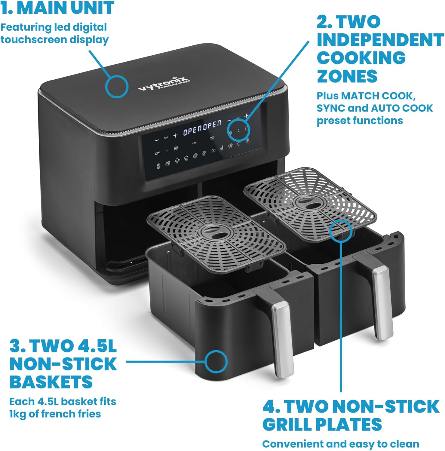 NO NONSENSE AIR FRYING: From chips and chops to burgers and bakes – you’ll be surprised at just how many delicious dishes our faff-free air fryer can handle with ease. Plus the 9L total capacity from the 2 x 4.5L baskets, there’s room for a portion for everyone.