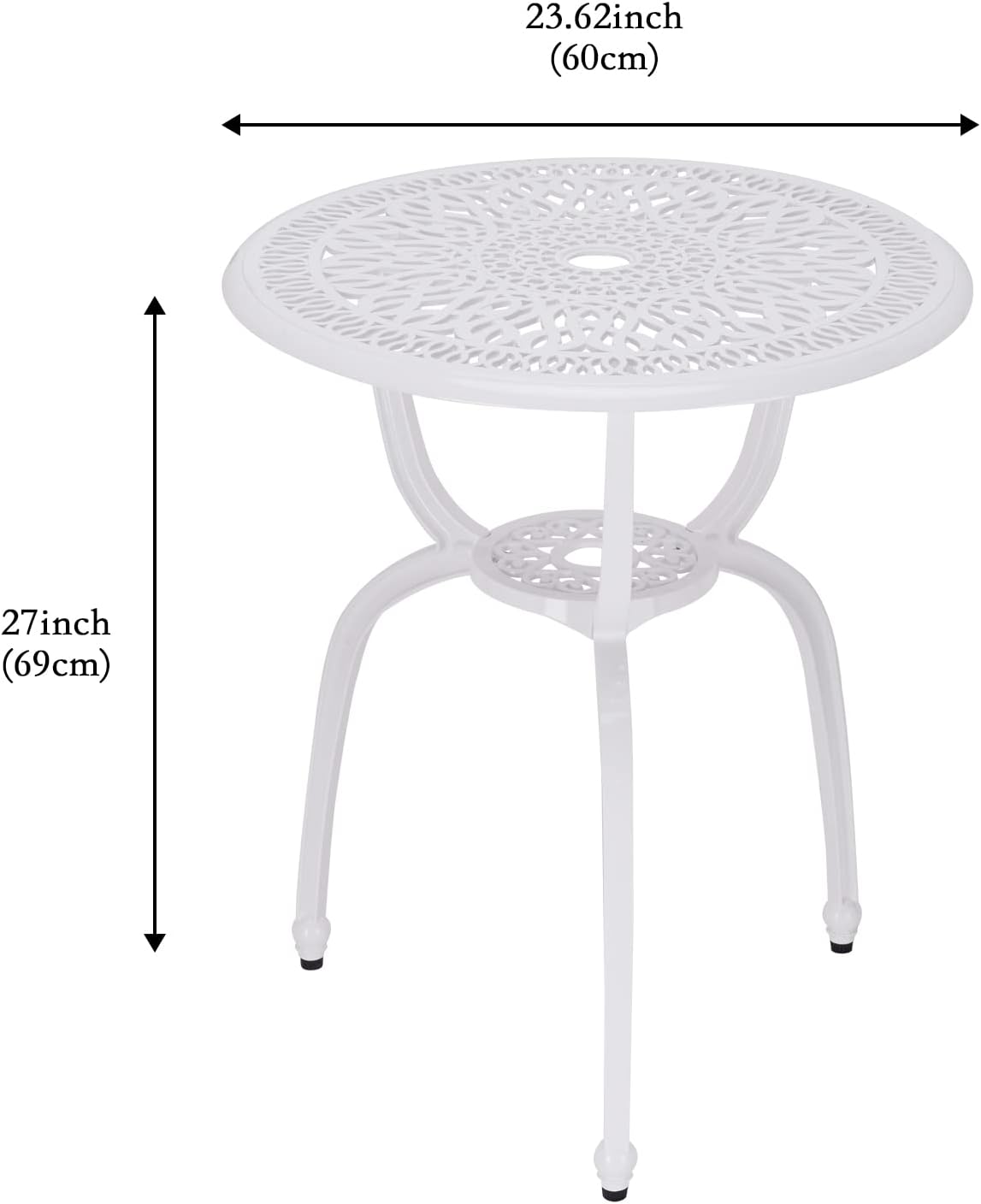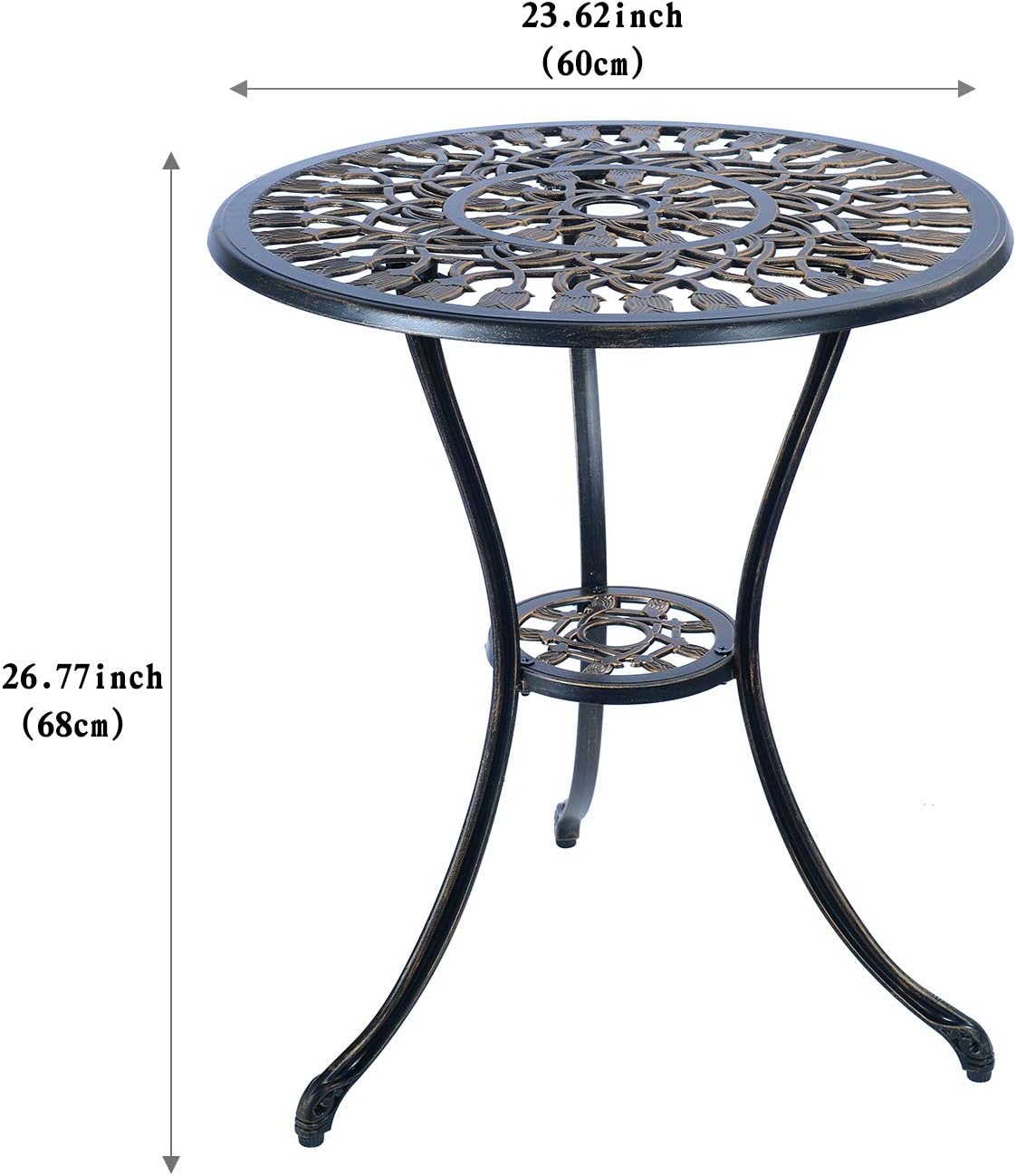 【BISTRO SET】: Contains a table, two chairs, table size: 23.6″ diameter x 26.7″ H; chair size: 17.32″ L x 17.32″ W x 33.07″ H, Chair weight capacity: 250 pounds.