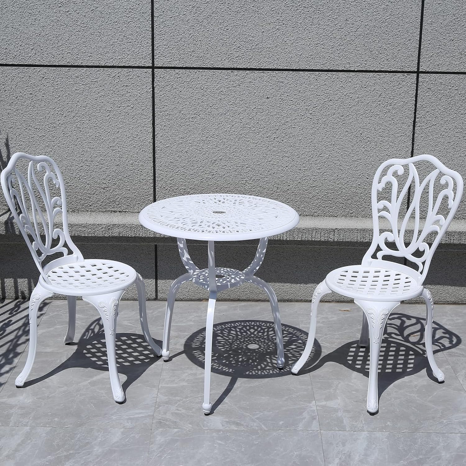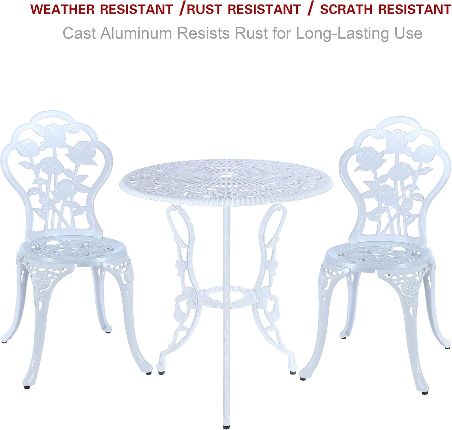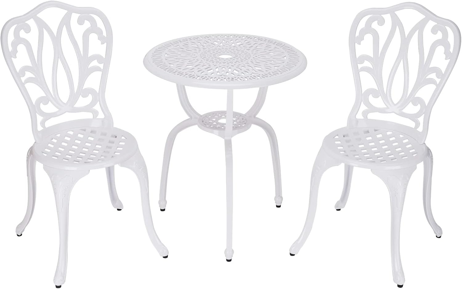 This white bistro set (table with two chairs) is adorable. I am very glad that I purchased it. It makes the back patio look more inviting. The set is lightweight, but the legs for the chairs and table are sturdy. Most important…the price is right for this bistro set.
