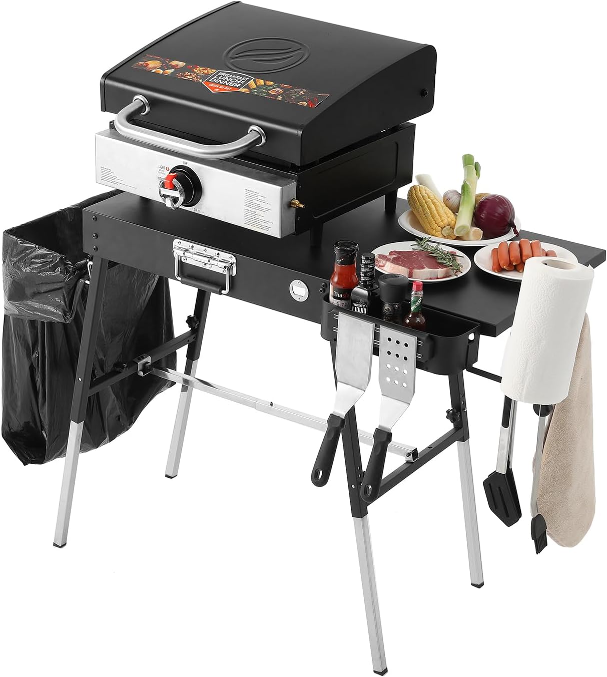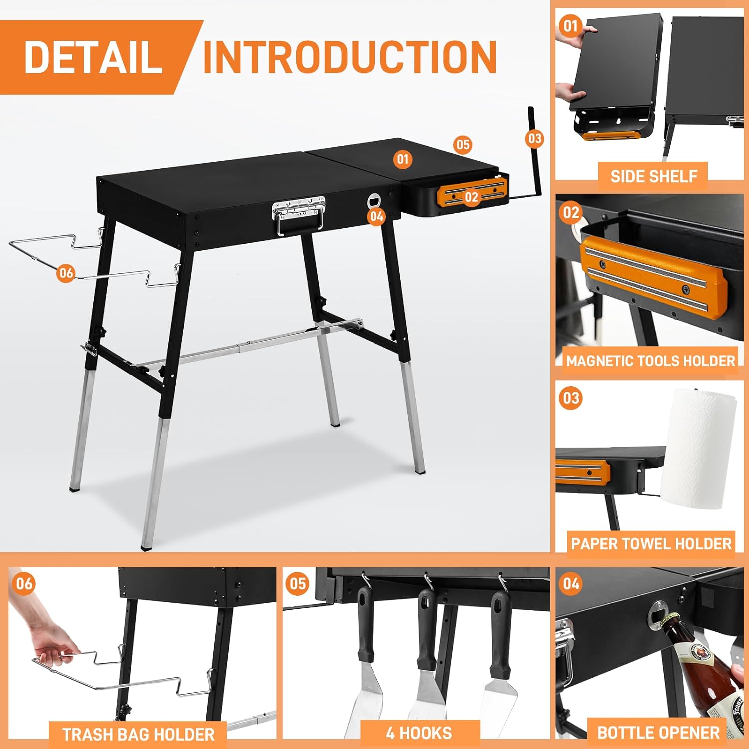 Full-Featured – Nice grill prep table and ooni pizza oven accessories, also can be used as a meal prep table, The tabletop has enough space for flat griddle and food, also comes with a trash holder, paper towel holder, grill caddy, side table, magnetic tool holder, bottle opener etc. You will keep marveling at each feature you came across, place a new home for your grill!