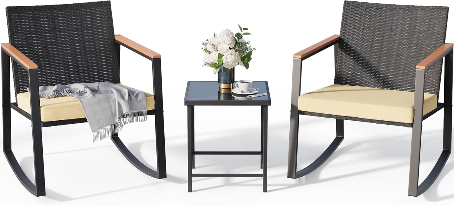 Safe and Comfortable Design: Enjoy relaxing outdoors in our patio rocking chair. Integrated legs and armrests provide stability, with wooden strips on the armrests to keep you cool. Rounded supports prevent tipping—ideal for your outdoor space