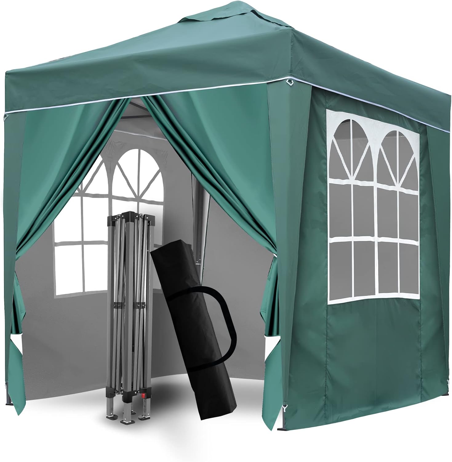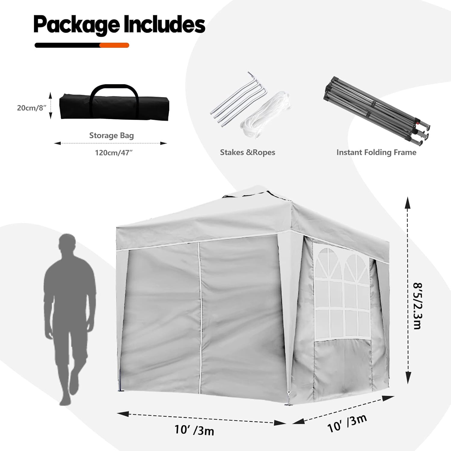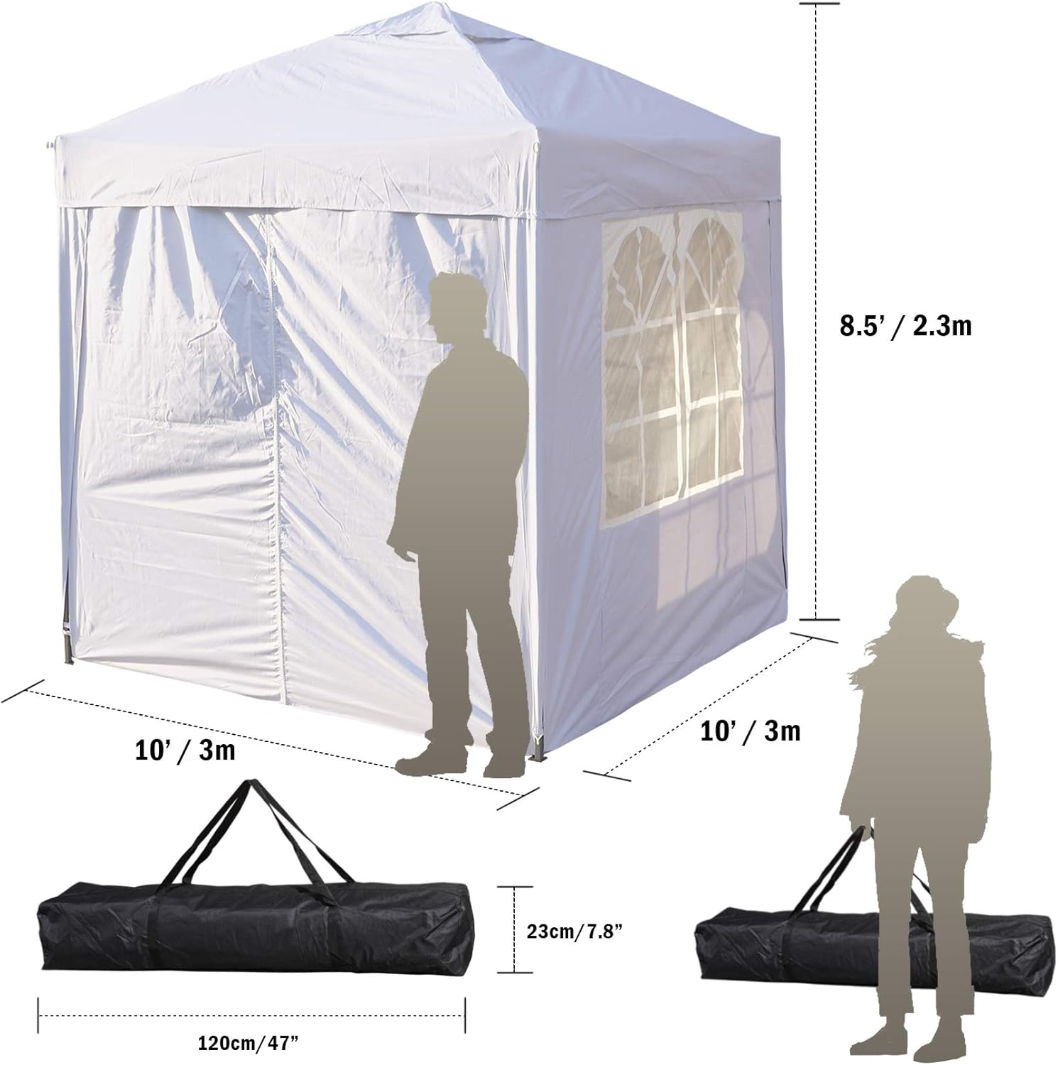SOLID STRUCTURE: the frame is made of heavy-duty painted steel which is rust-resistant and lightweight, the roof and the removable side panels are made of polyethylene tarp, which is tear-proof, waterproof and anti-UV. Besides, this canopy tents can be used on hard surfaces such as decks, driveways, lawn etc;