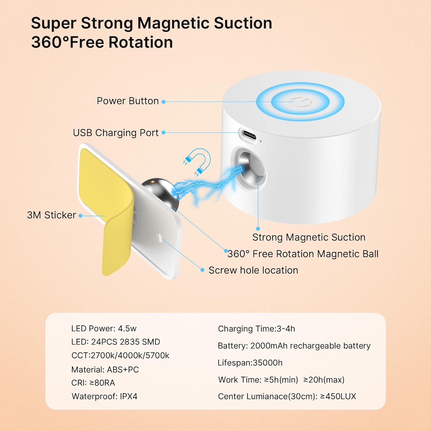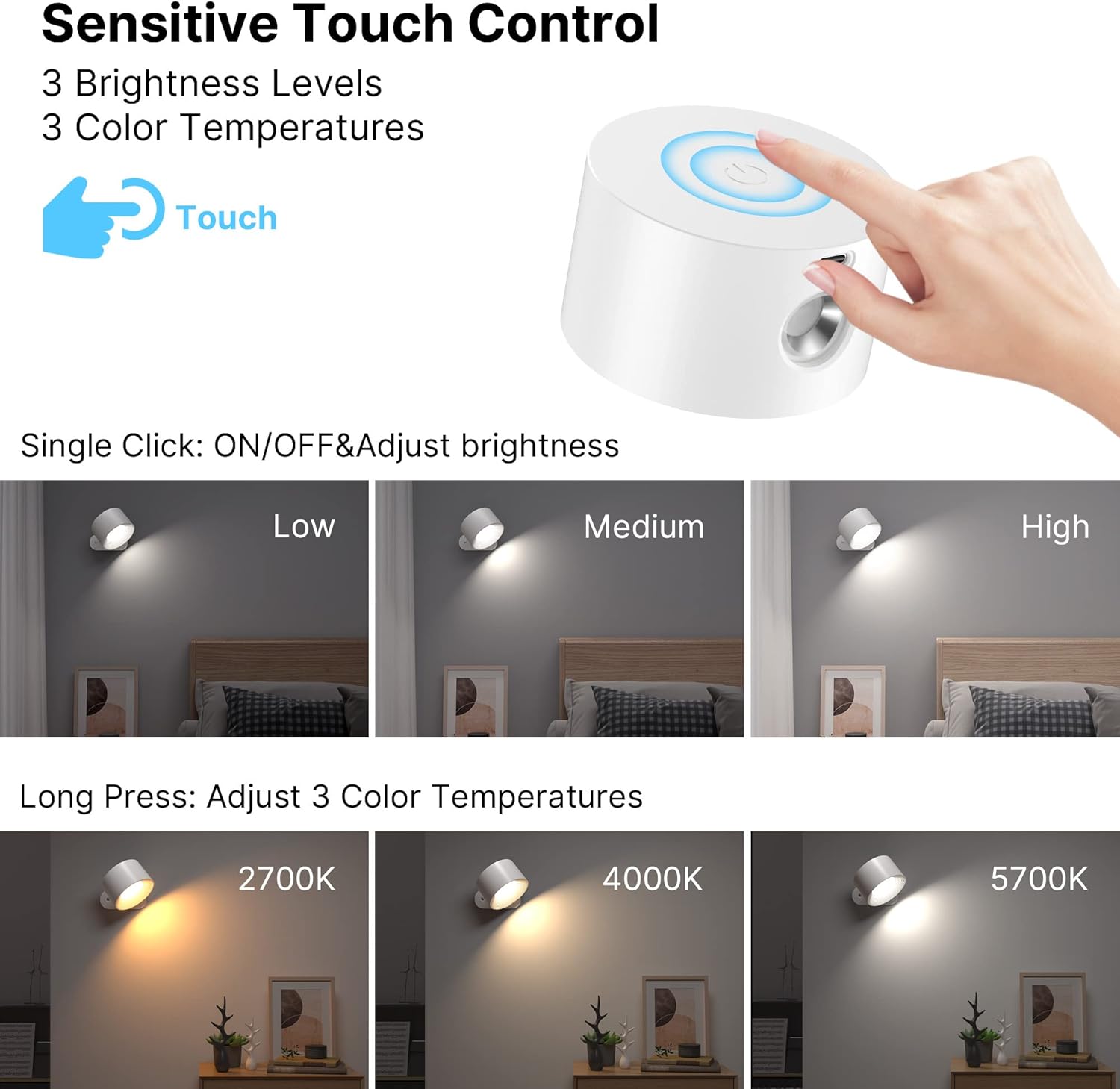 360° Rotation and Touch Control Design: The reading light can be freely rotated up to 360 degrees, providing your favorite lighting in all directions. The magnetic ball is strong enough to keep the wall light in the same position without slipping off. Designed with a sensitive touch control to change 3 color modes and 3 brightness levels.