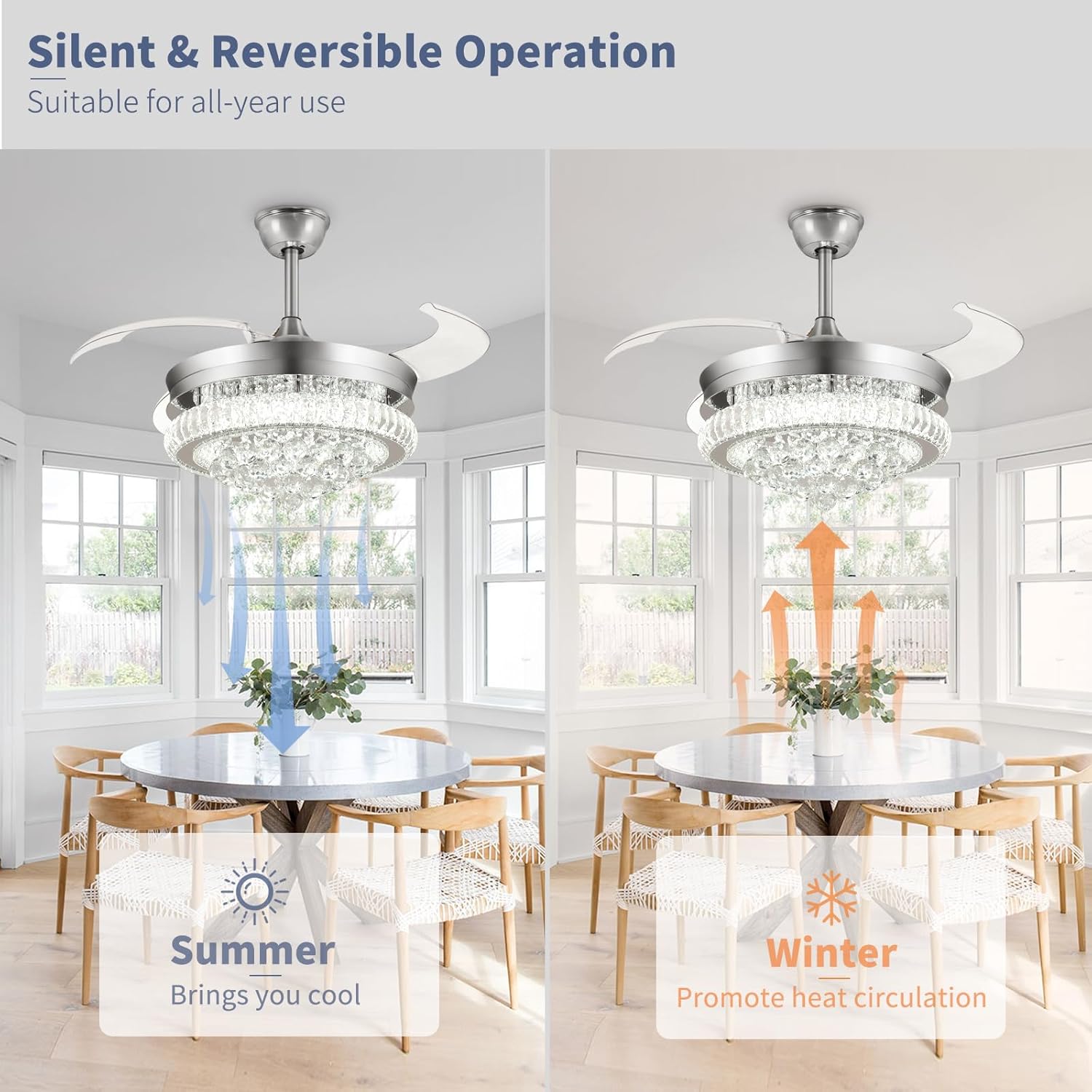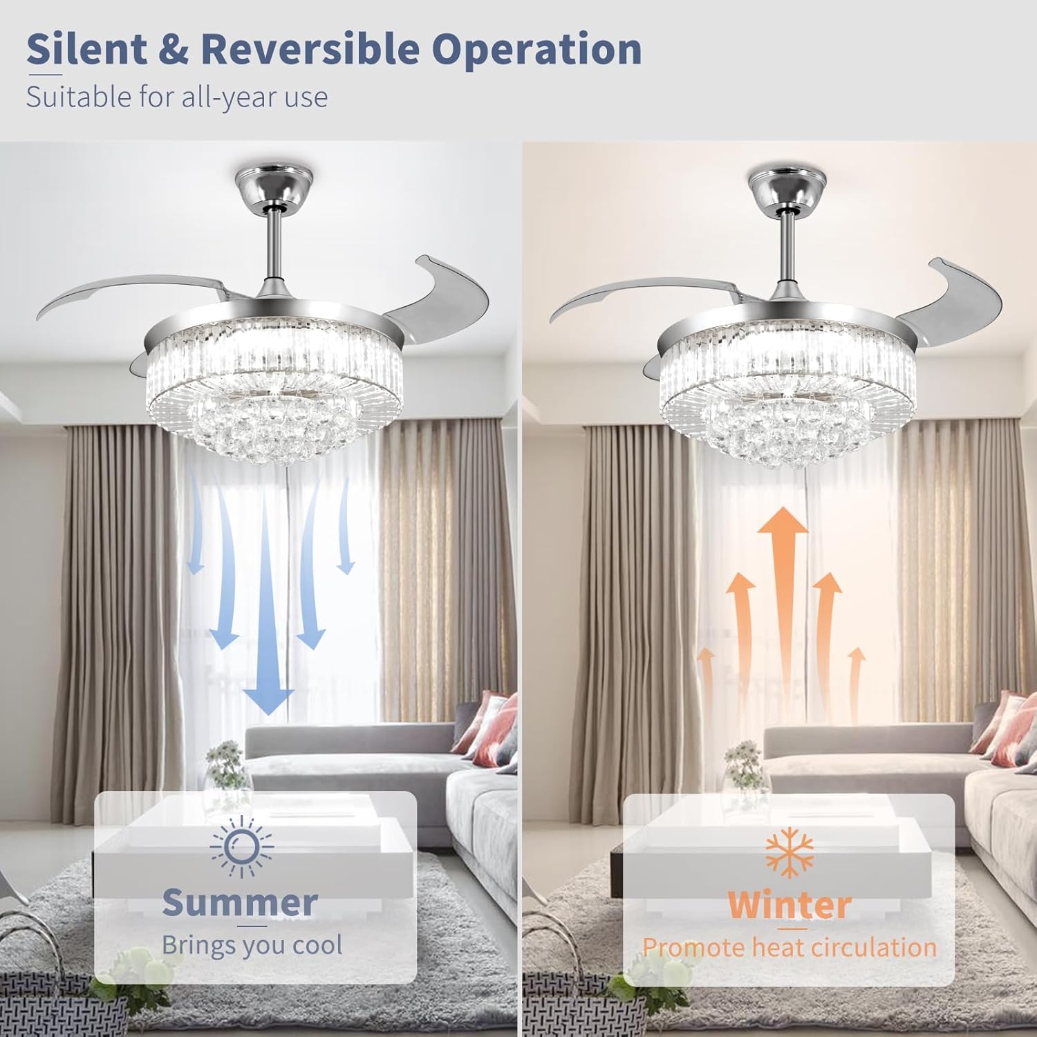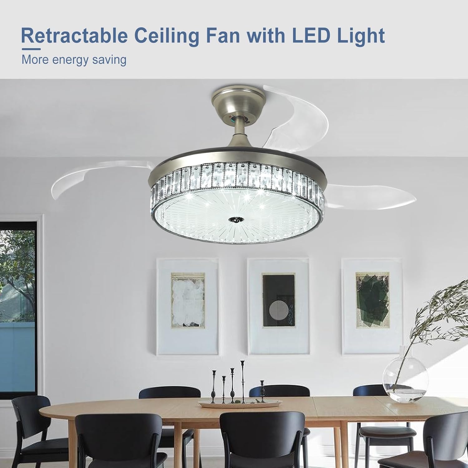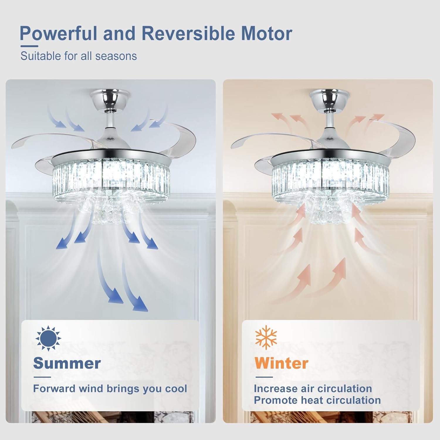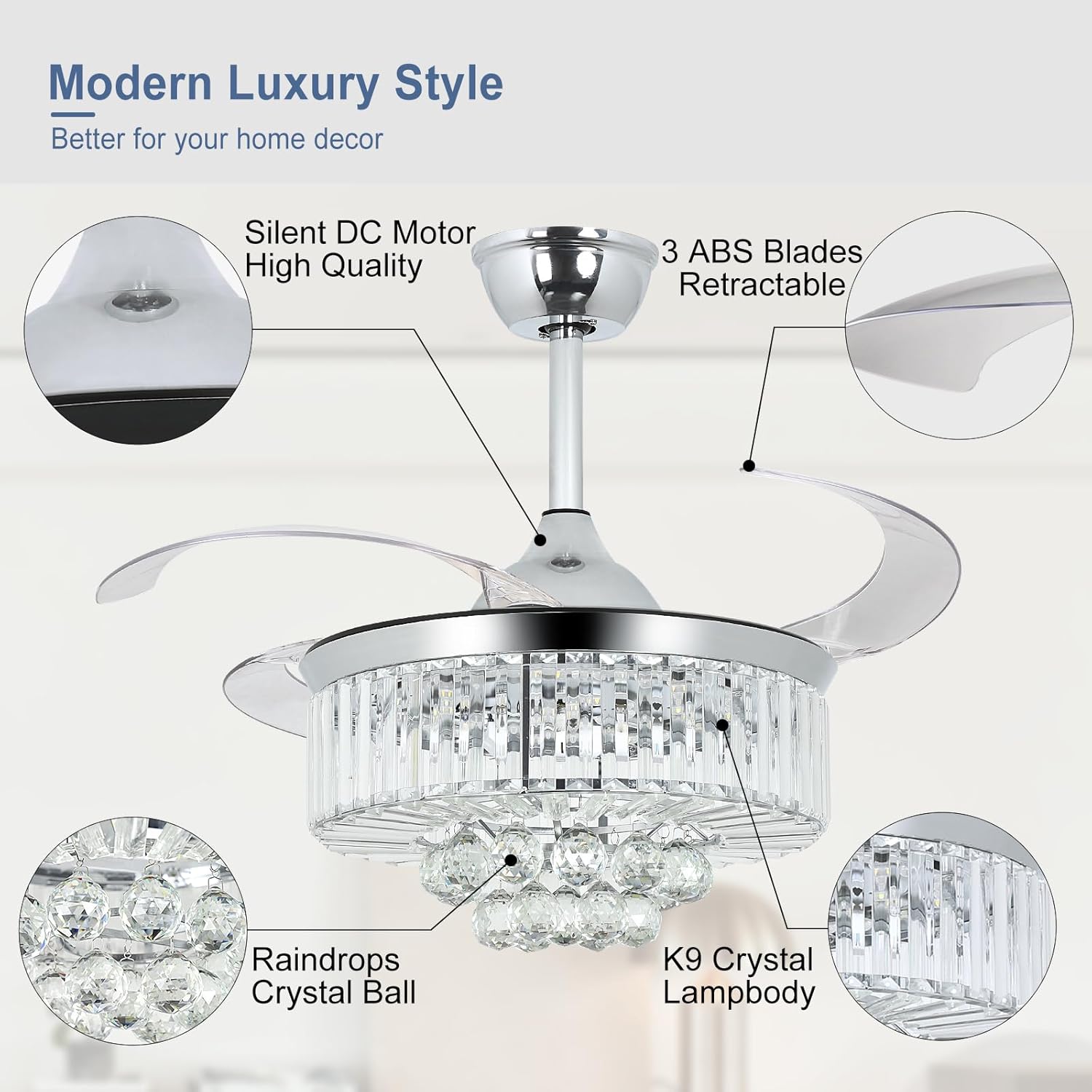 RETRACTABLE FAN BLADES: The retractable fan blades, made of high-temperature resistant and lightweight ABS material, are the perfect solution for maintaining the elegant shape of the crystal fandalier when not in use. The large volume of air driven by the fan blade is perfect for summer and also facilitates indoor hot air circulation in winter without direct blowing to you.