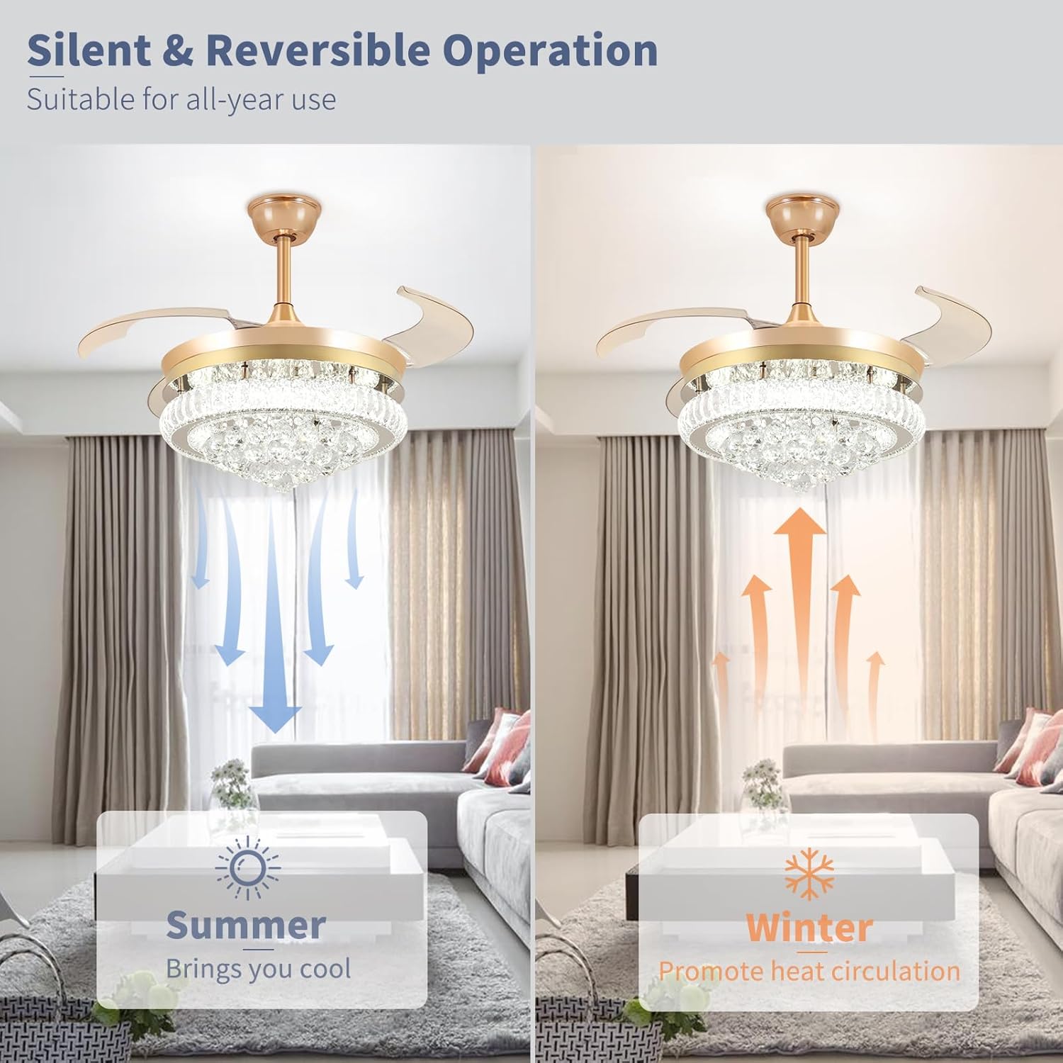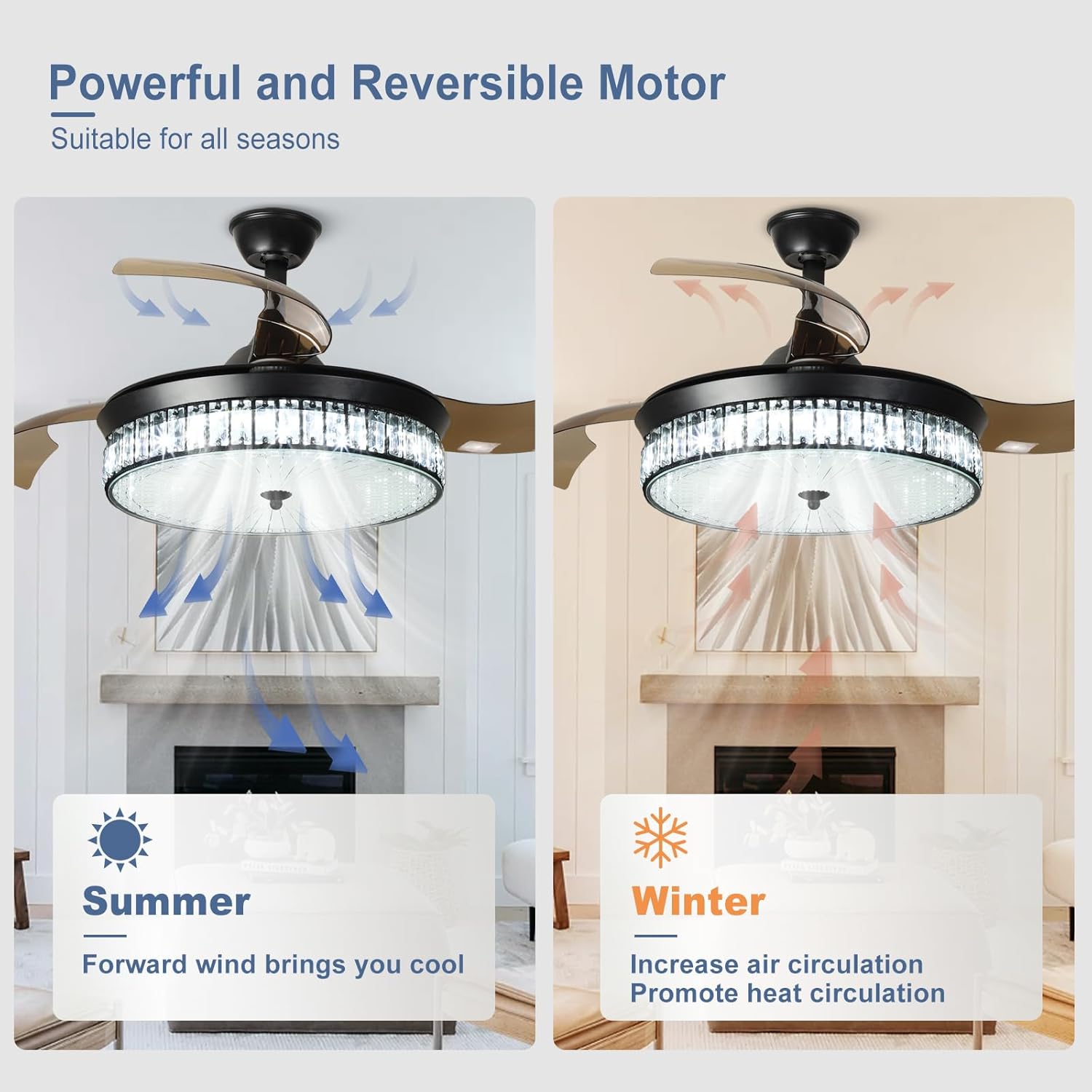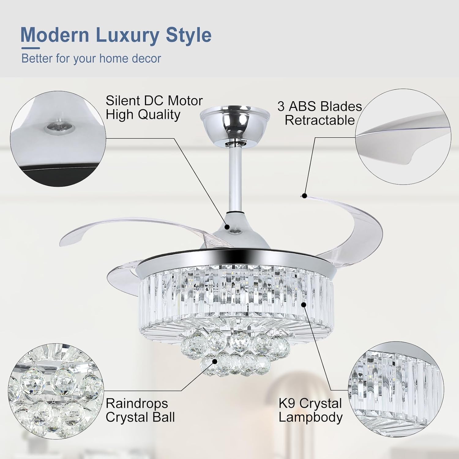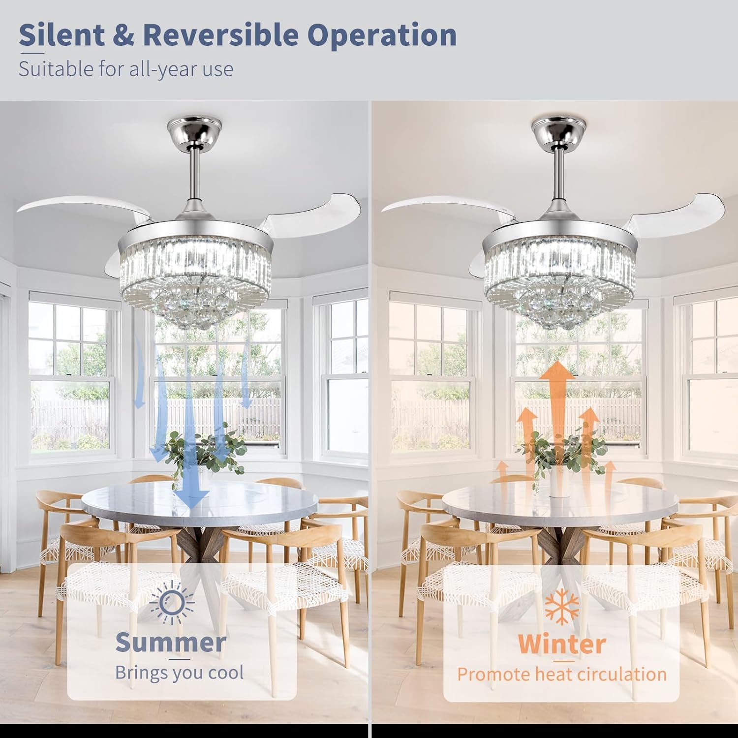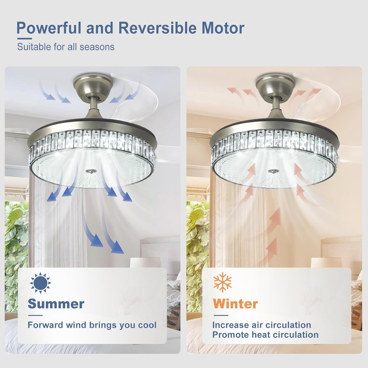 RETRACTABLE FAN BLADES: The retractable fan blades, made of high-temperature resistant and lightweight ABS material, are the perfect solution for maintaining the elegant shape of the crystal fandalier when not in use. The large volume of air driven by the fan blade is perfect for summer and also facilitates indoor hot air circulation in winter without direct blowing to you.