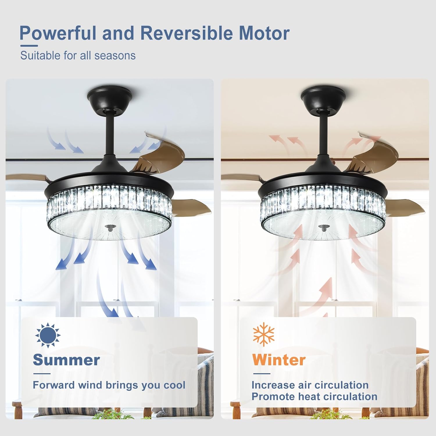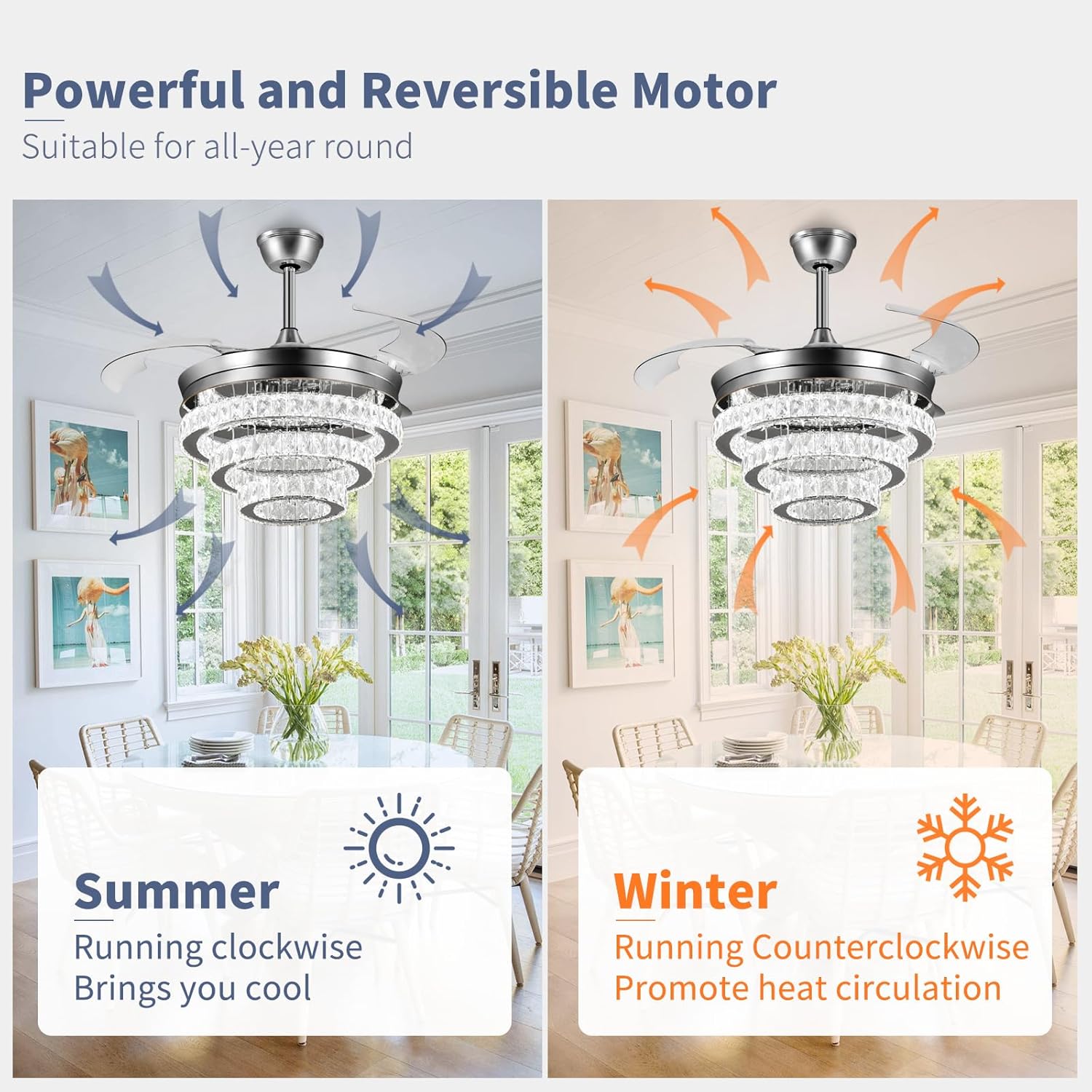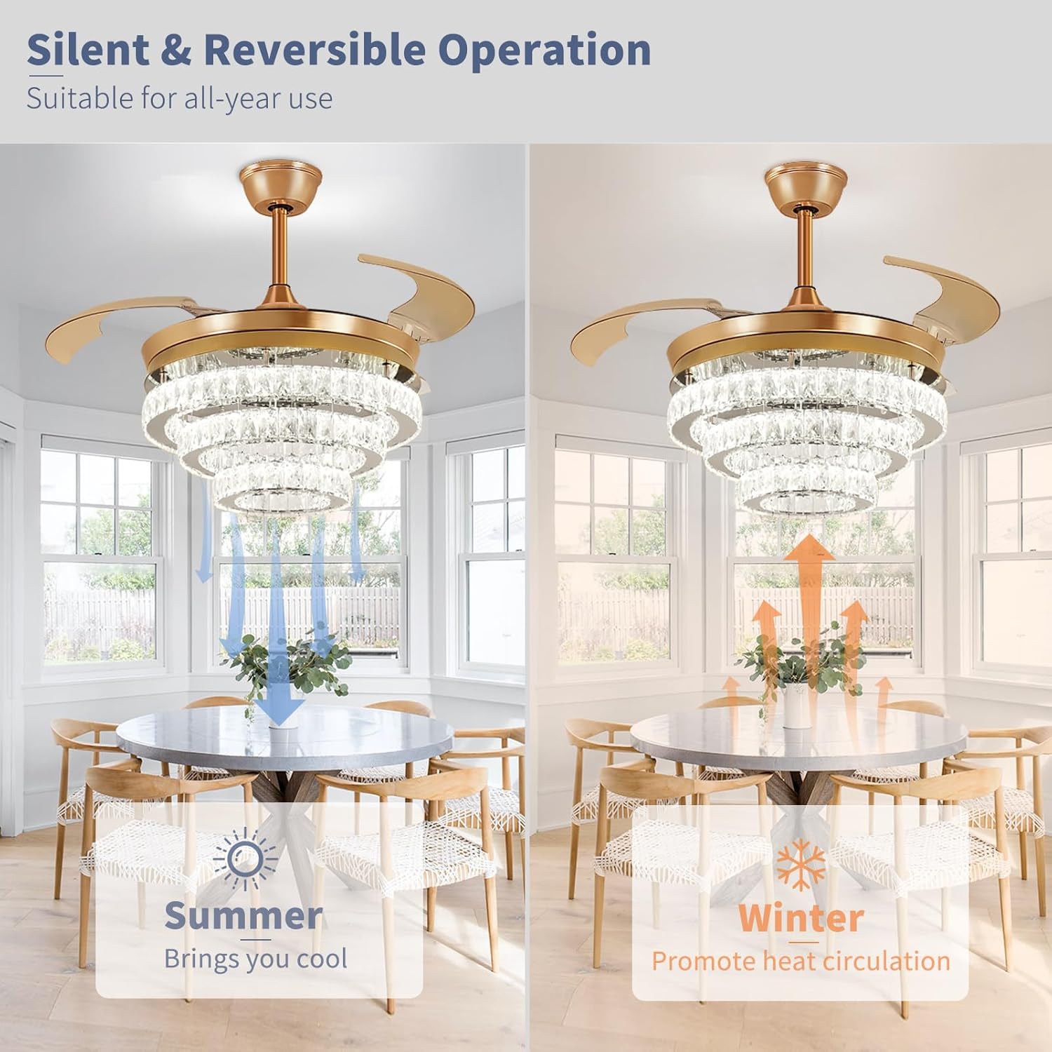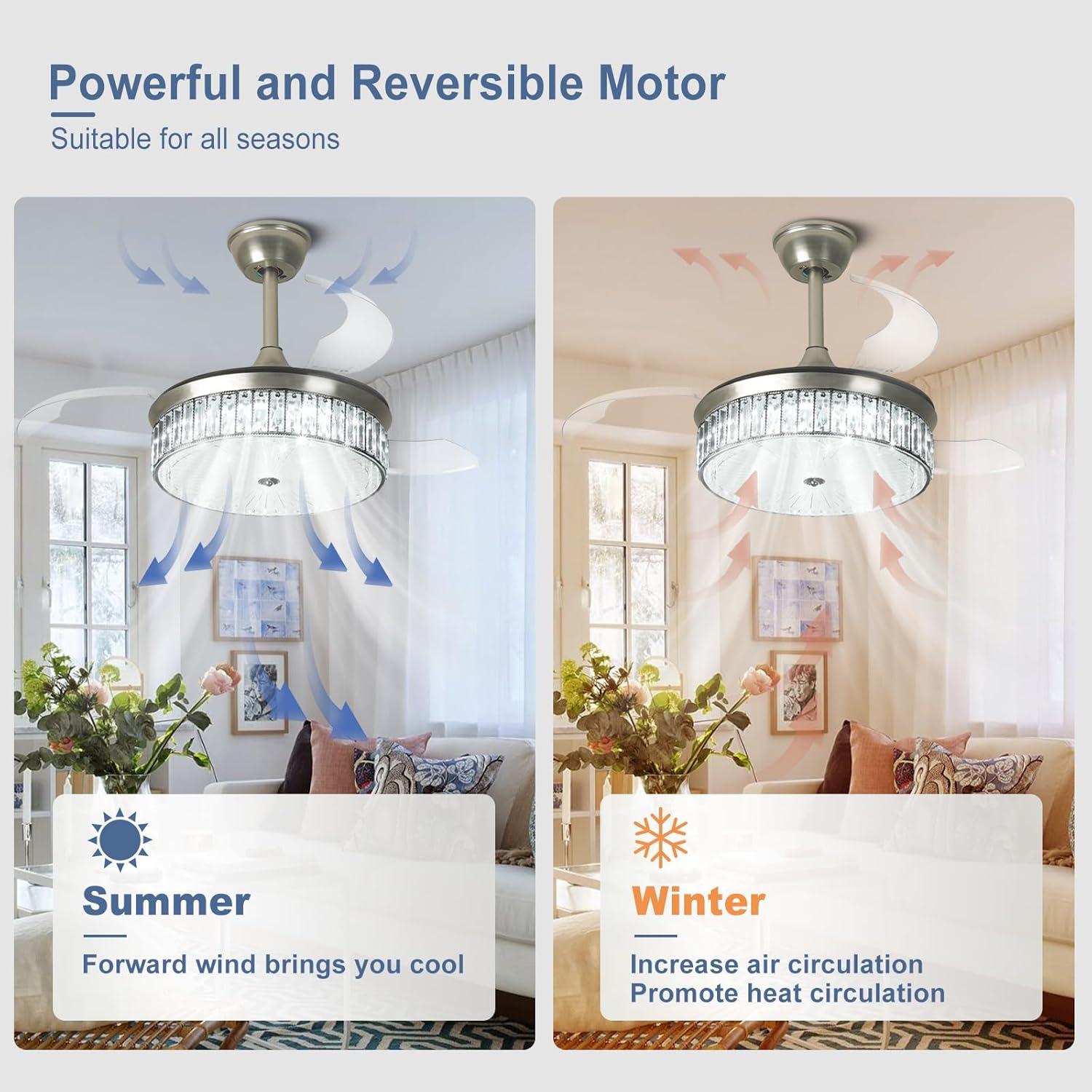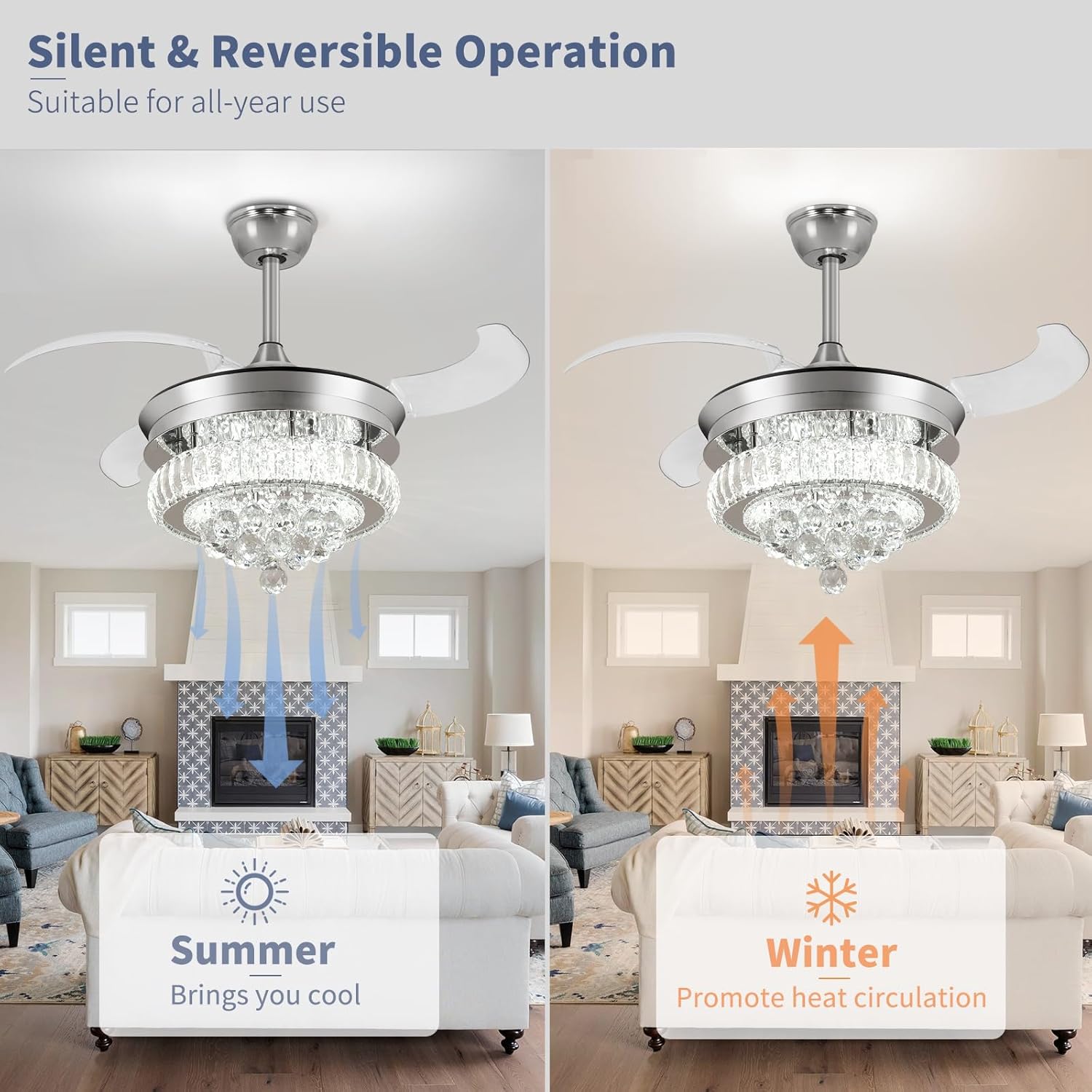 RETRACTABLE FAN BLADES: The retractable fan blades, made of high-temperature resistant and lightweight ABS material, are the perfect solution for maintaining the elegant shape of the crystal fandalier when not in use. The large volume of air driven by the fan blade is perfect for summer and also facilitates indoor hot air circulation in winter without direct blowing to you.