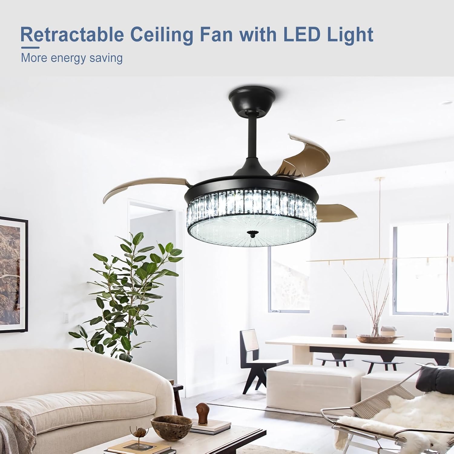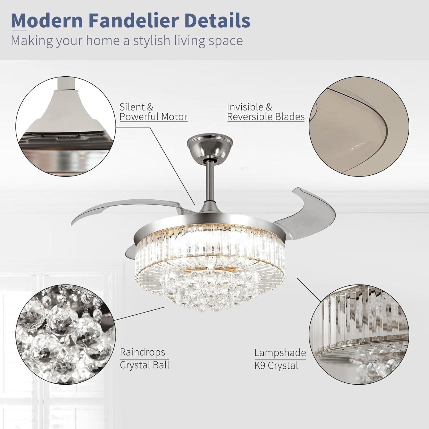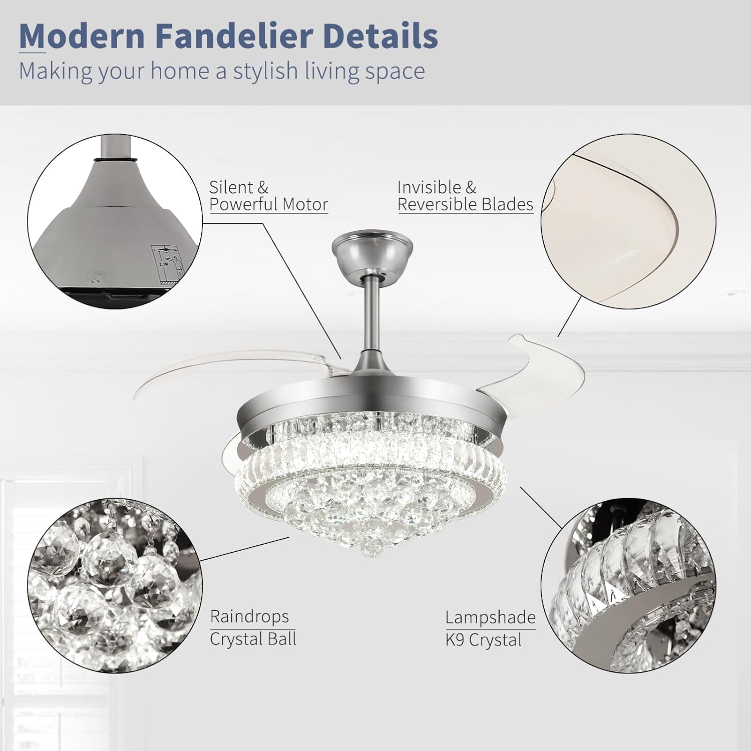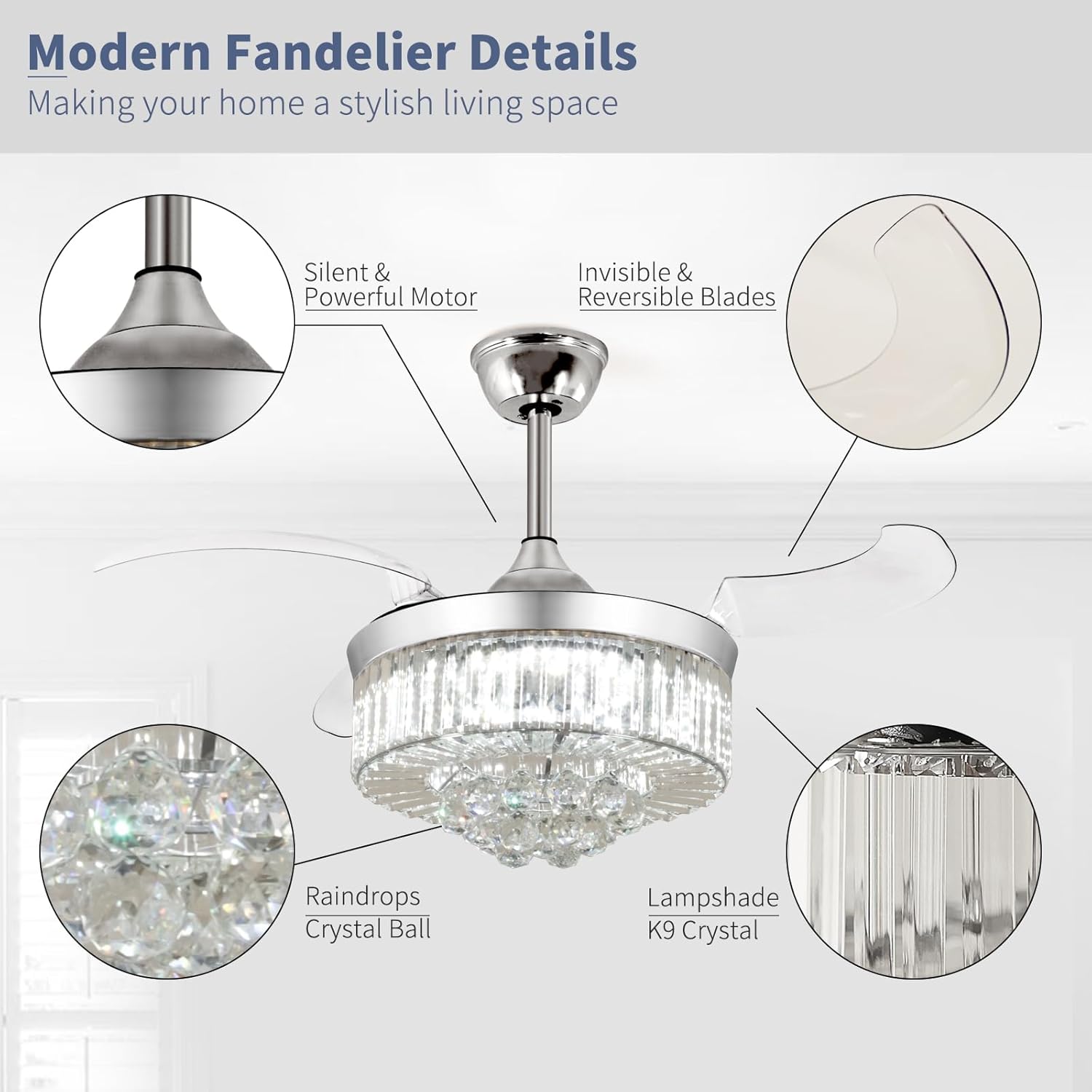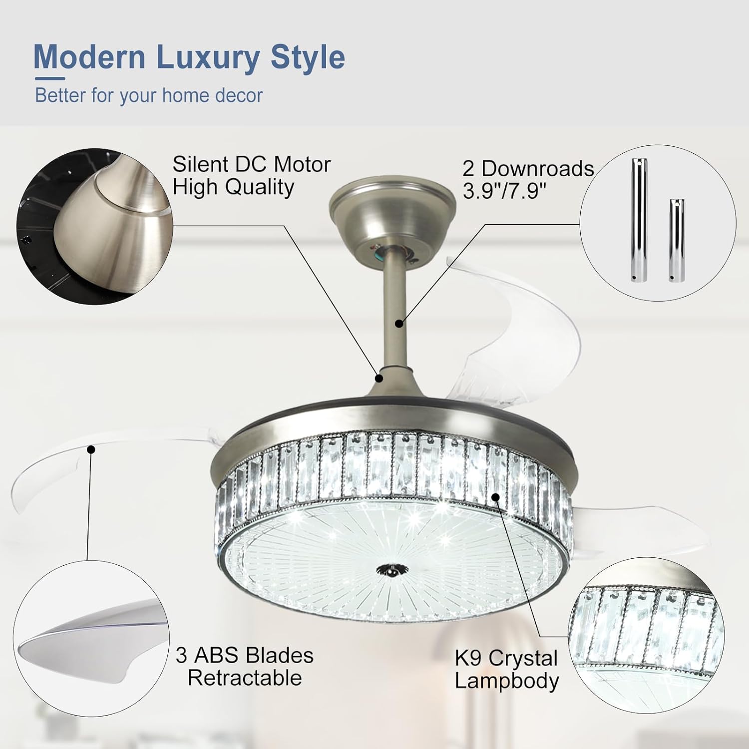 RETRACTABLE FAN BLADES: The retractable fan blades, made of high-temperature resistant and lightweight ABS material, are the perfect solution for maintaining the elegant shape of the crystal fandalier when not in use. The large volume of air driven by the fan blade is perfect for summer and also facilitates indoor hot air circulation in winter without direct blowing to you.