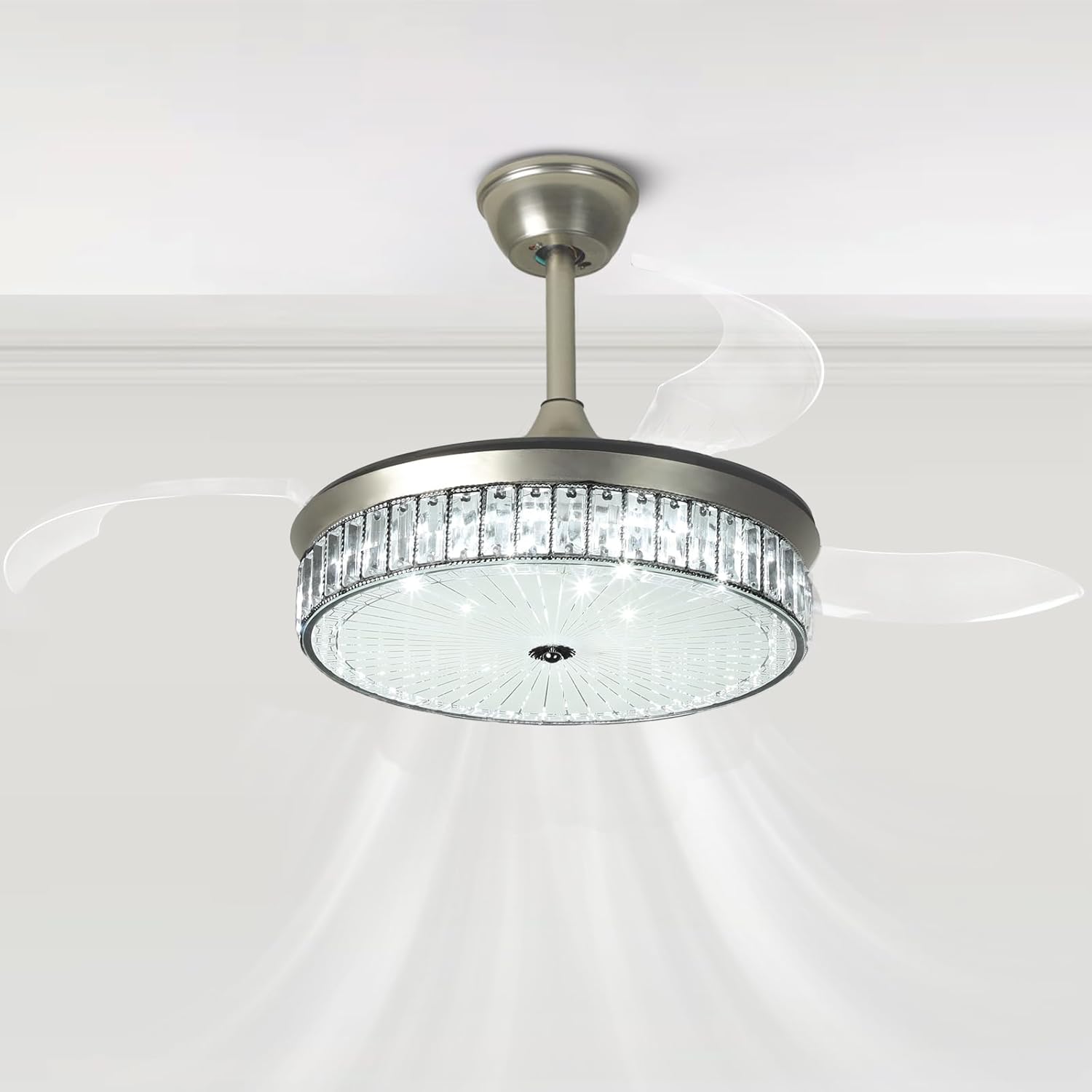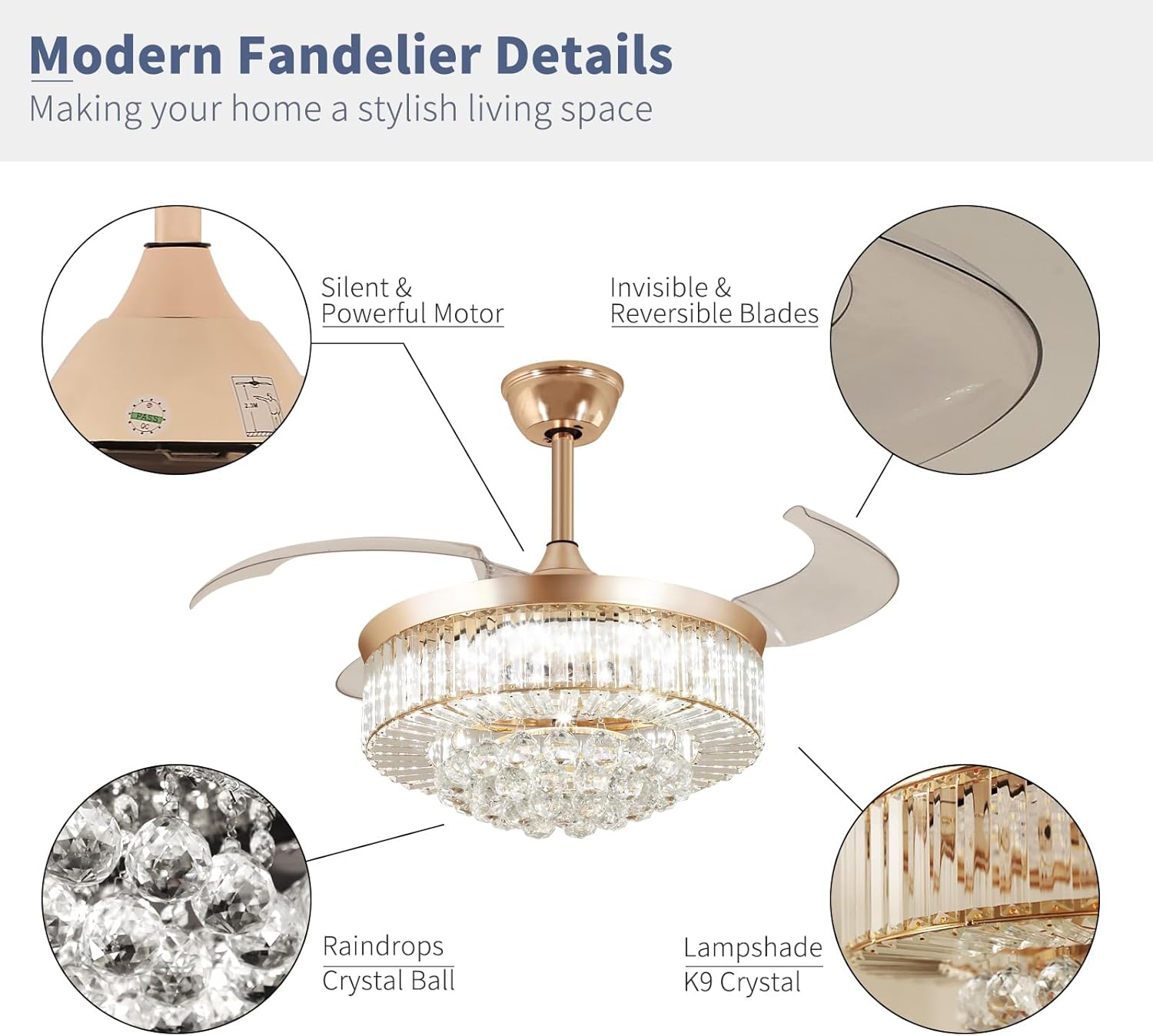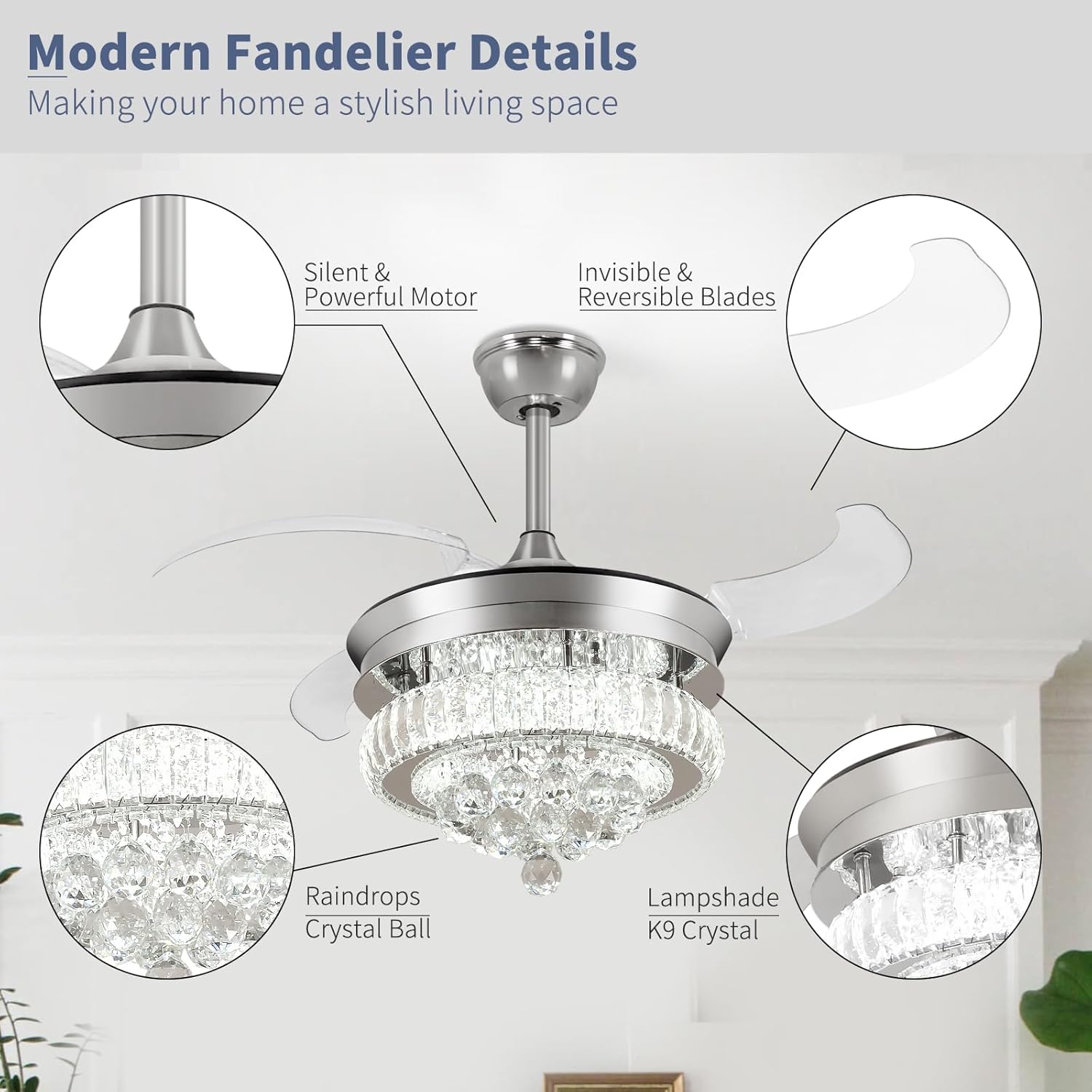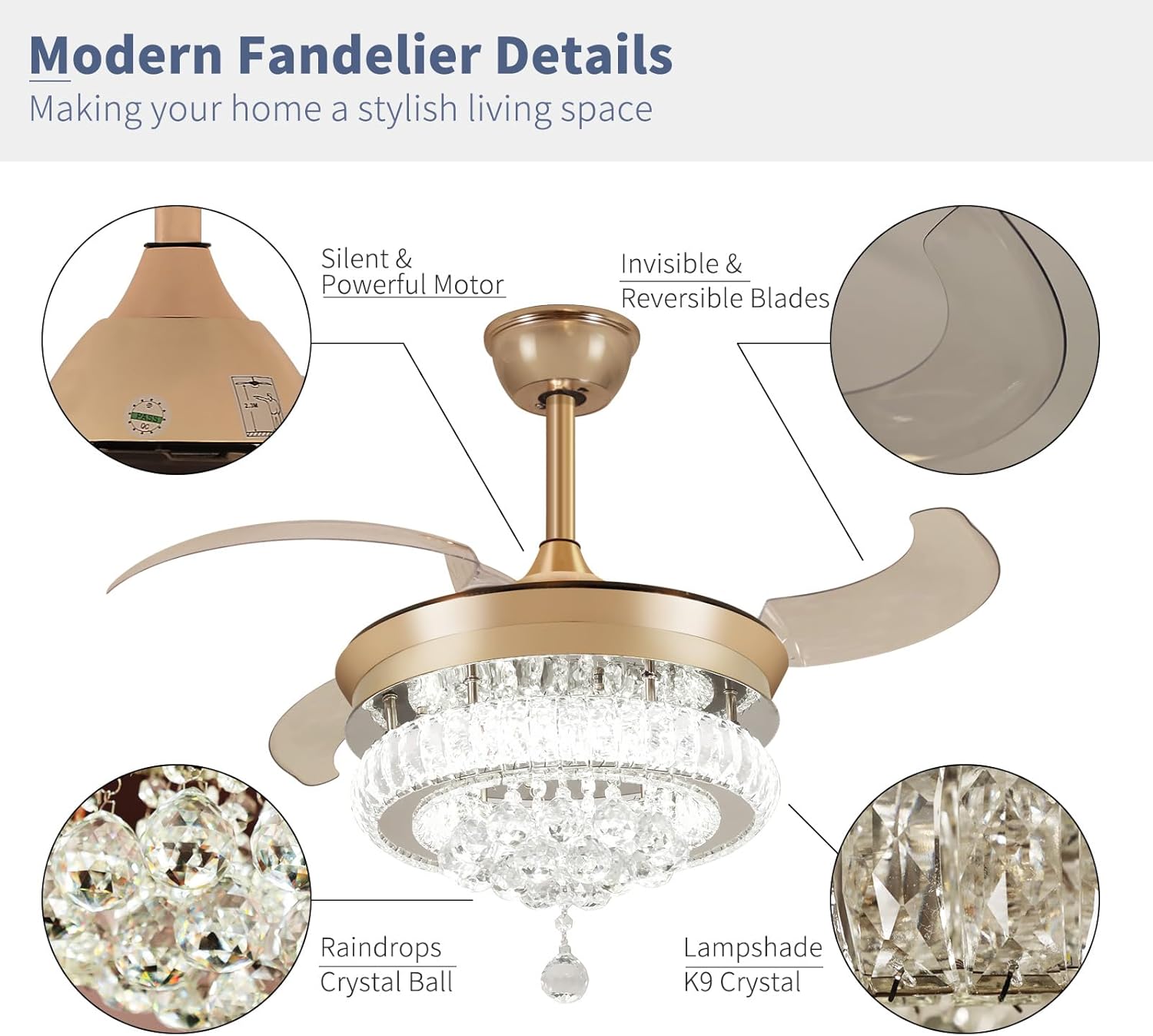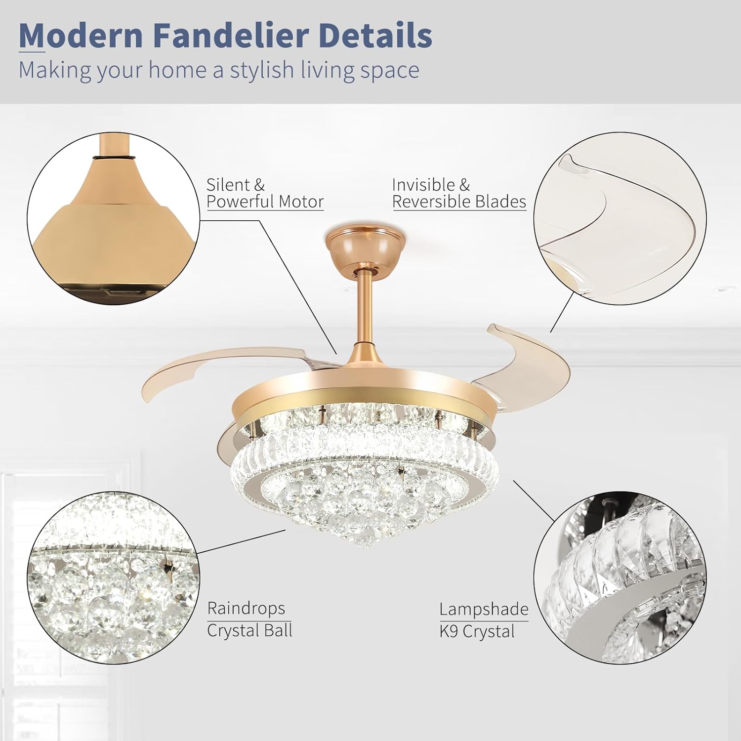 RETRACTABLE FAN BLADES: The retractable fan blades, made of high-temperature resistant and lightweight ABS material, are the perfect solution for maintaining the elegant shape of the crystal fandalier when not in use. The large volume of air driven by the fan blade is perfect for summer and also facilitates indoor hot air circulation in winter without direct blowing to you.