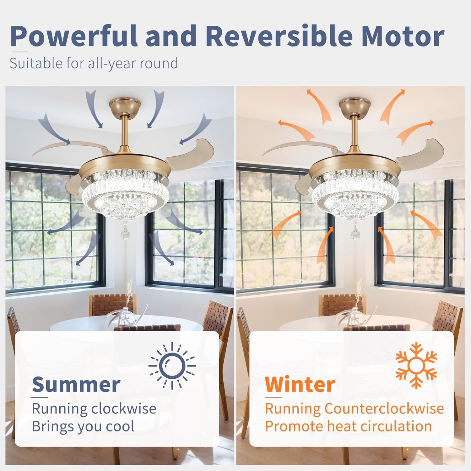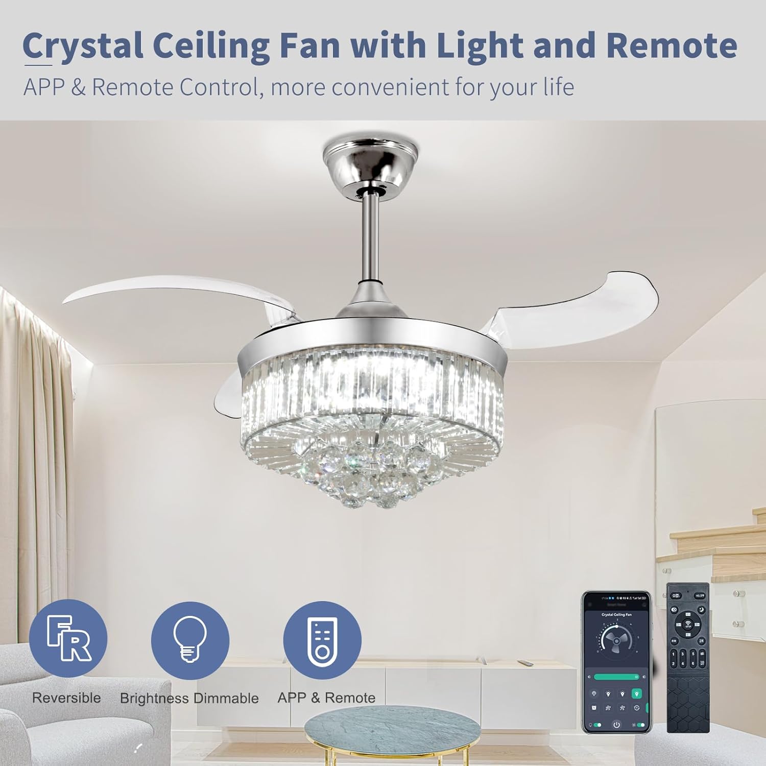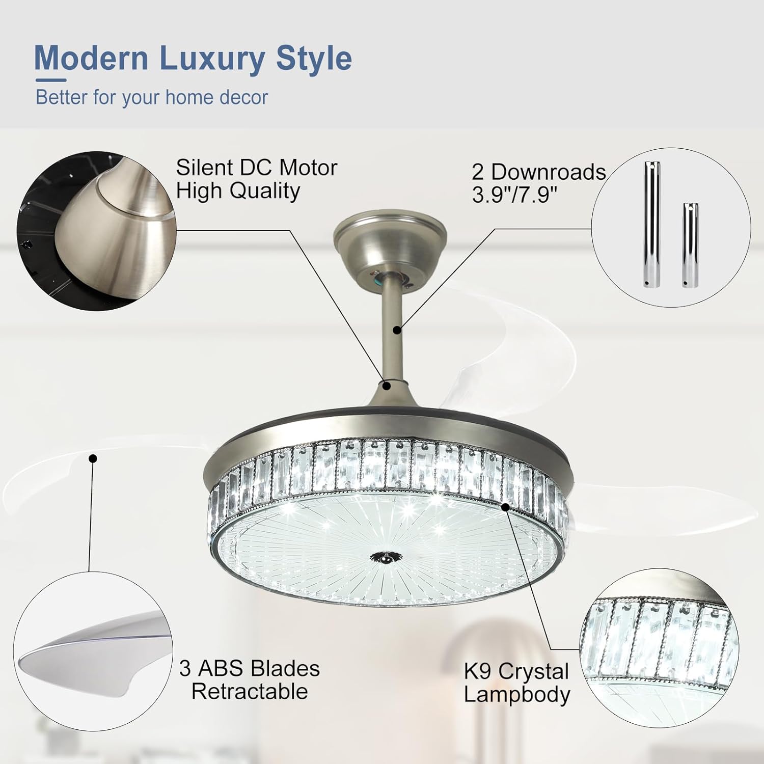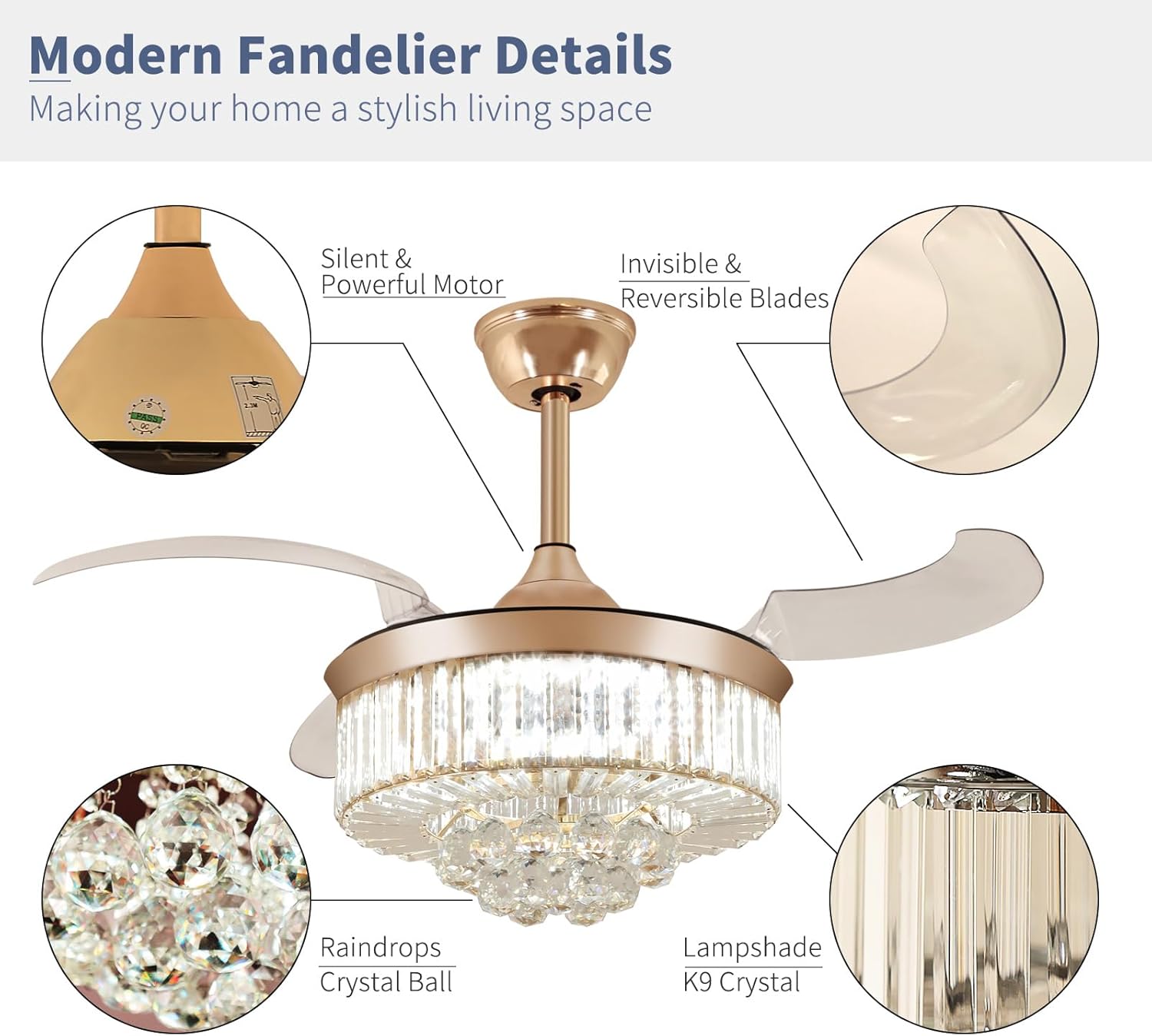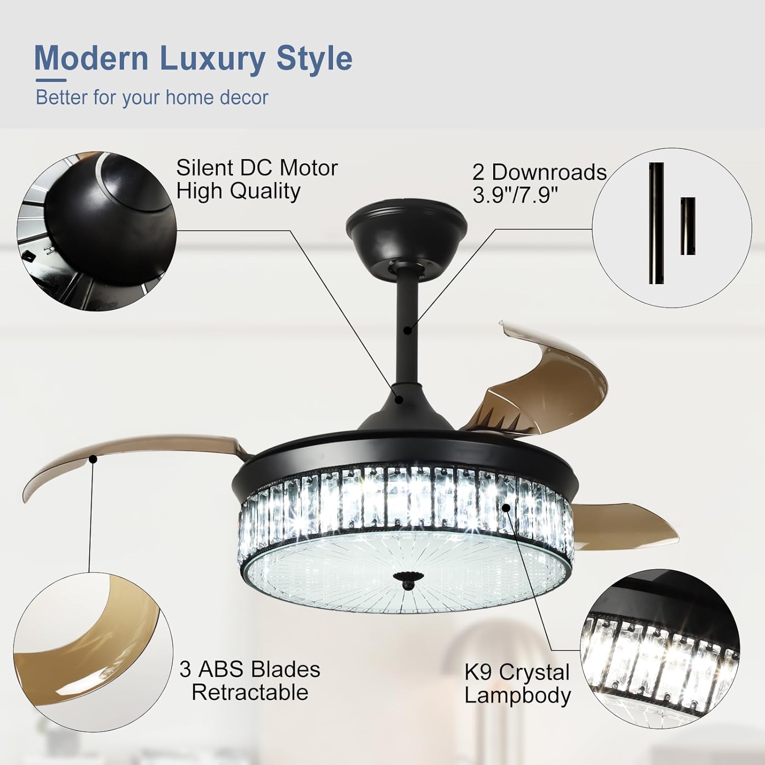 RETRACTABLE FAN BLADES: The retractable fan blades, made of high-temperature resistant and lightweight ABS material, are the perfect solution for maintaining the elegant shape of the crystal fandalier when not in use. The large volume of air driven by the fan blade is perfect for summer and also facilitates indoor hot air circulation in winter without direct blowing to you.