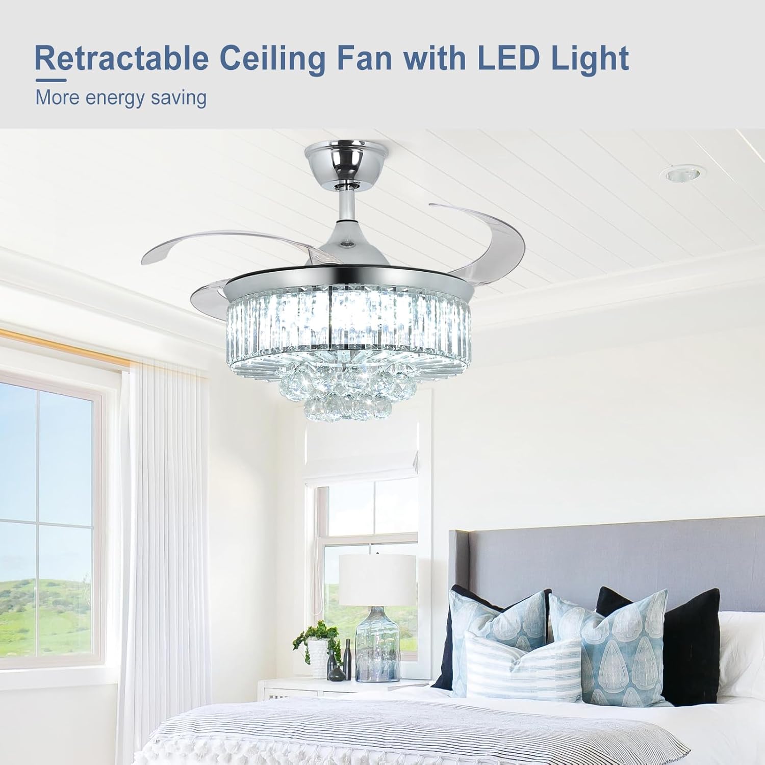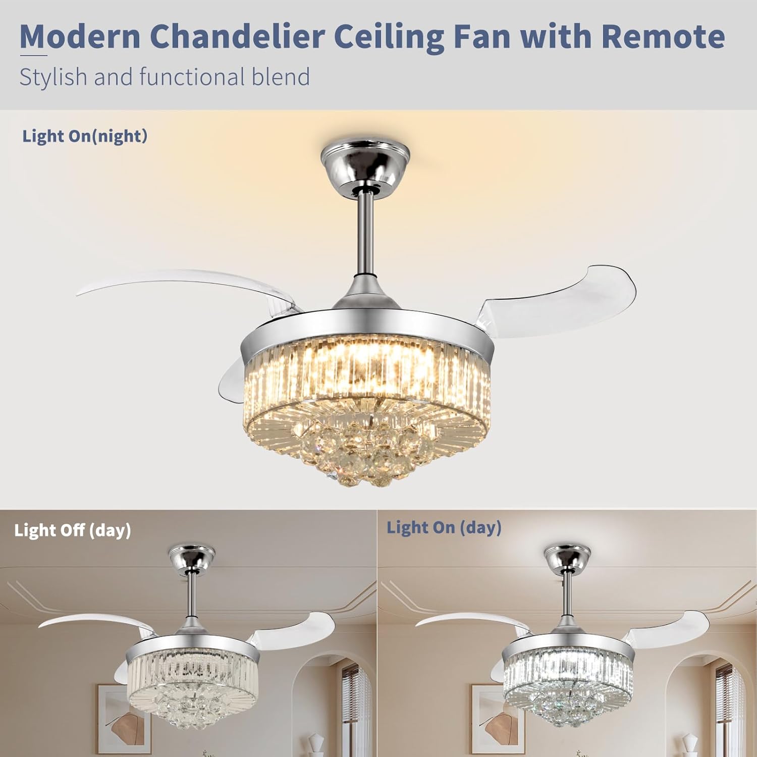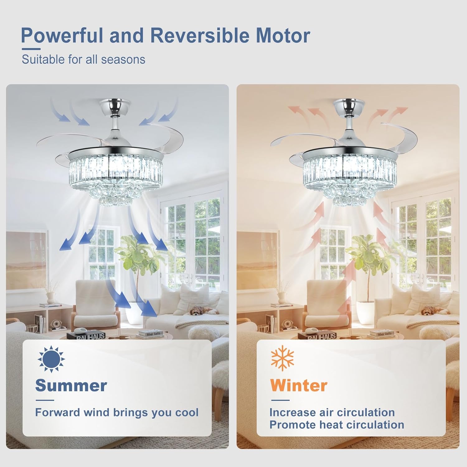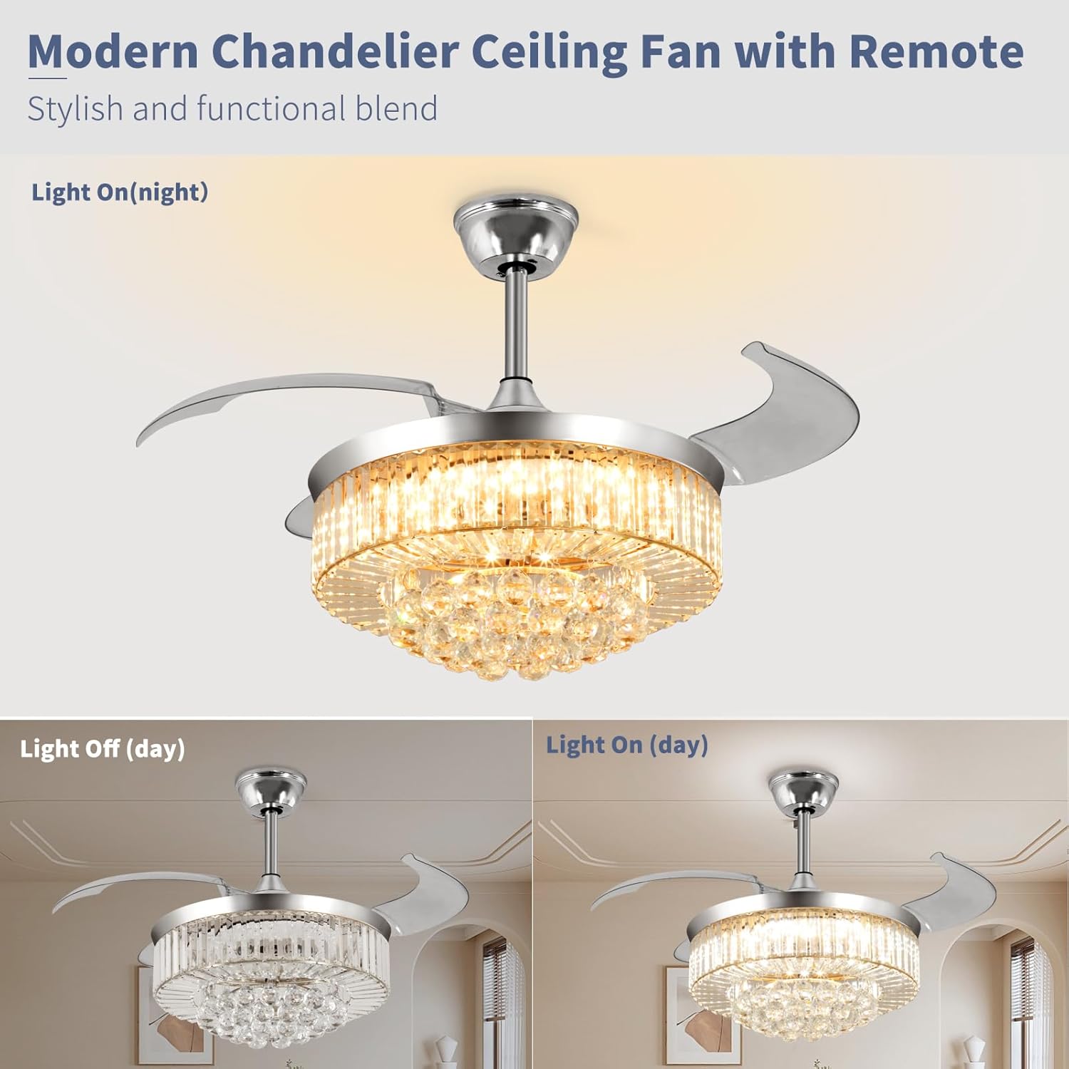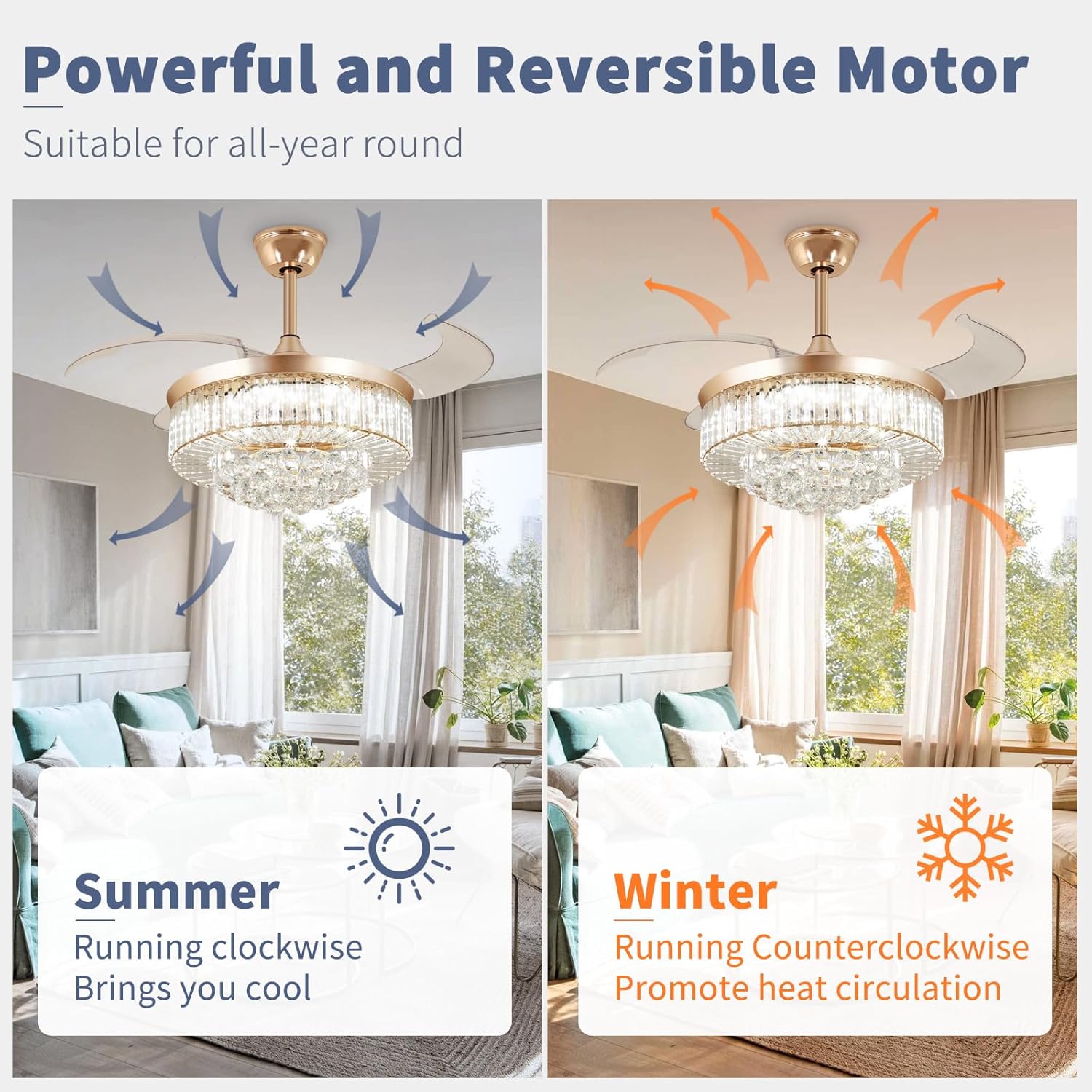 RETRACTABLE FAN BLADES: The retractable fan blades, made of high-temperature resistant and lightweight ABS material, are the perfect solution for maintaining the elegant shape of the crystal fandalier when not in use. The large volume of air driven by the fan blade is perfect for summer and also facilitates indoor hot air circulation in winter without direct blowing to you.