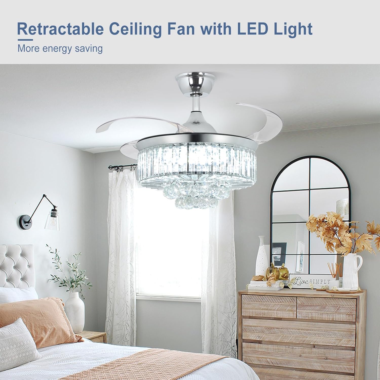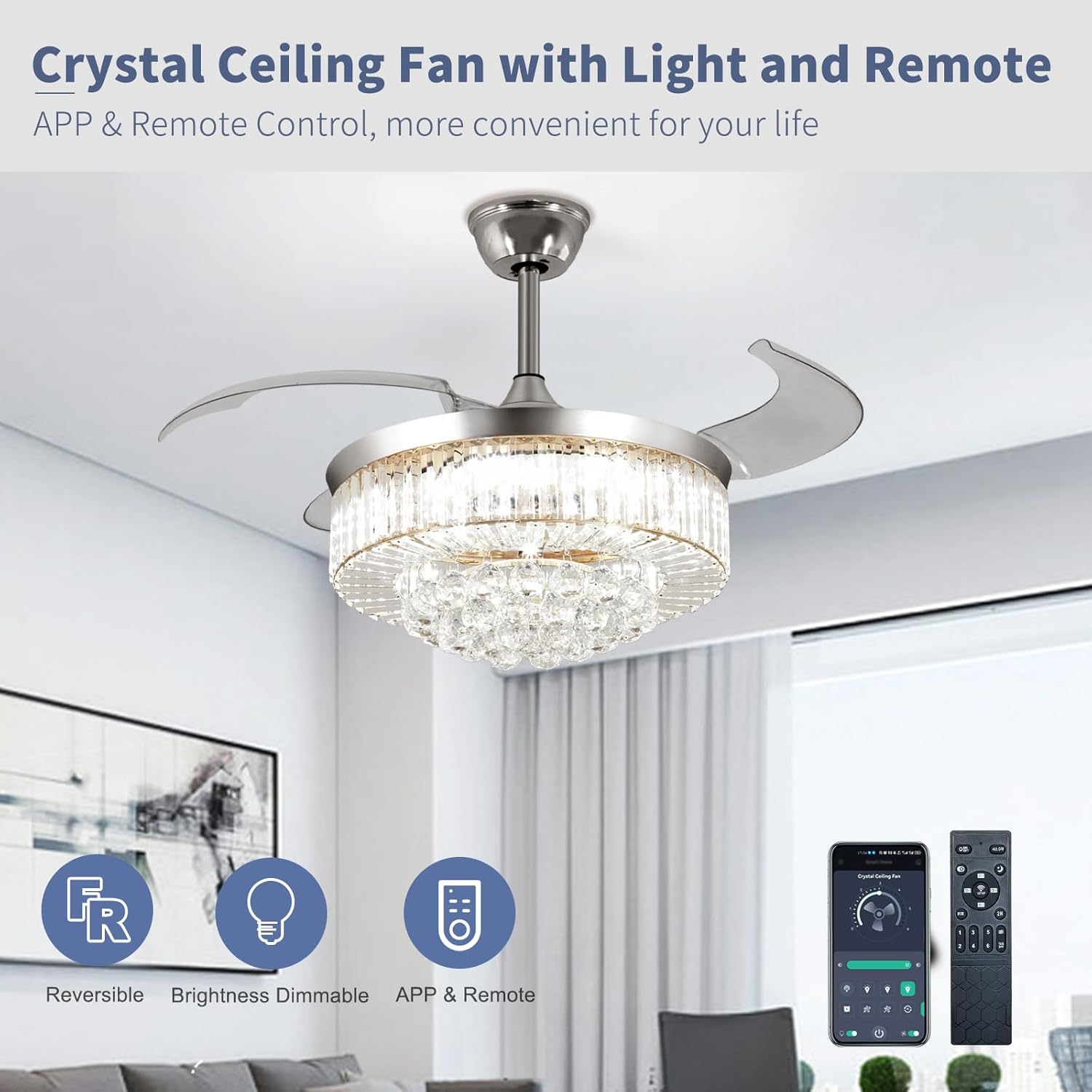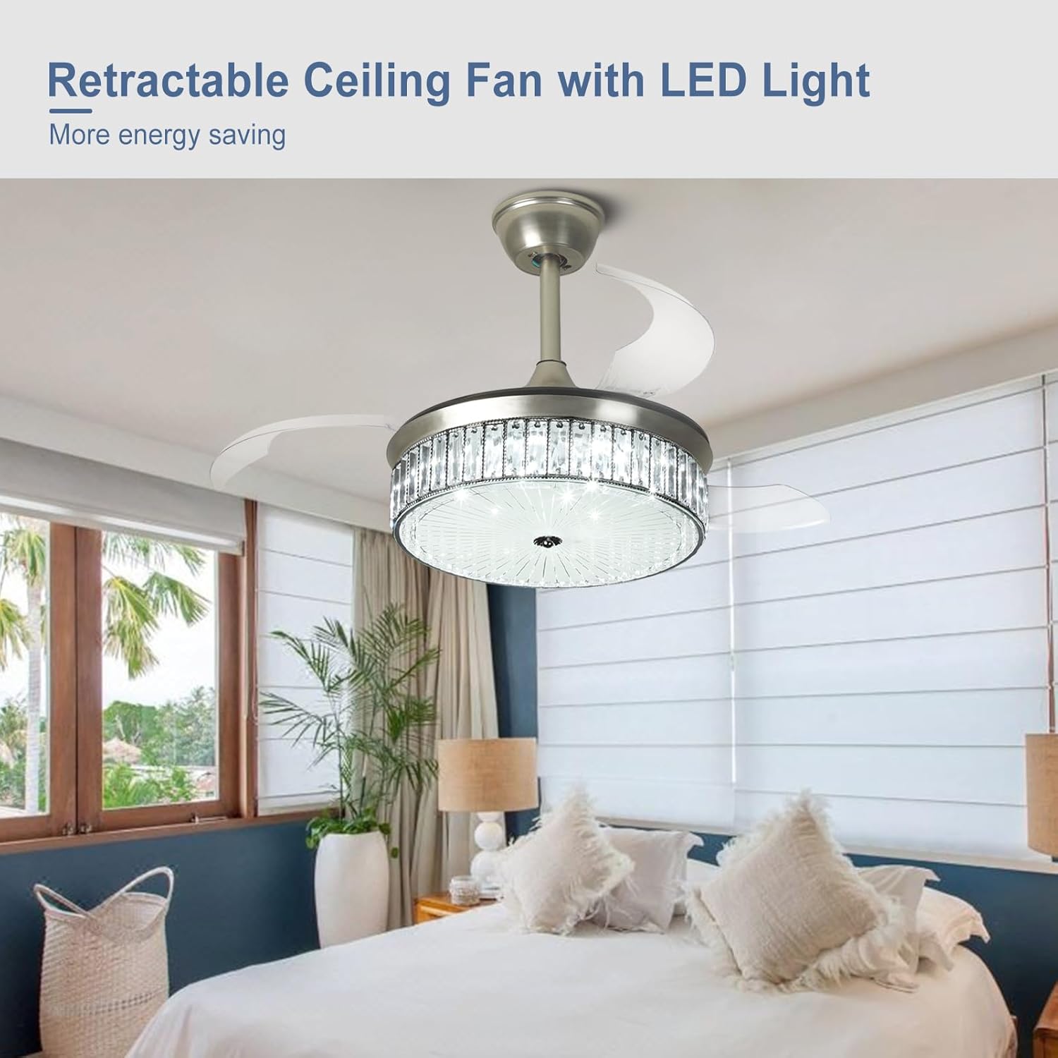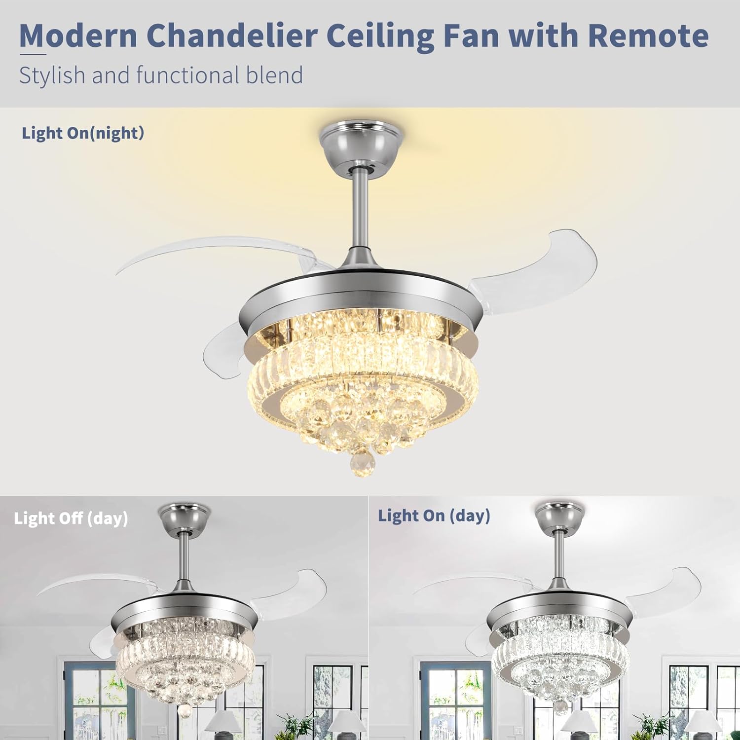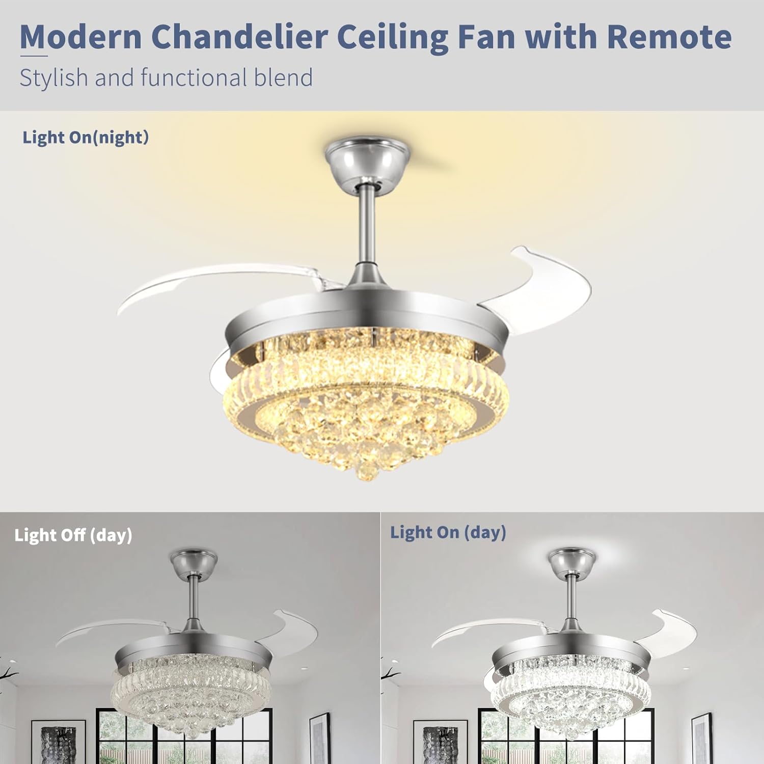 RETRACTABLE FAN BLADES: The retractable fan blades, made of high-temperature resistant and lightweight ABS material, are the perfect solution for maintaining the elegant shape of the crystal fandalier when not in use. The large volume of air driven by the fan blade is perfect for summer and also facilitates indoor hot air circulation in winter without direct blowing to you.