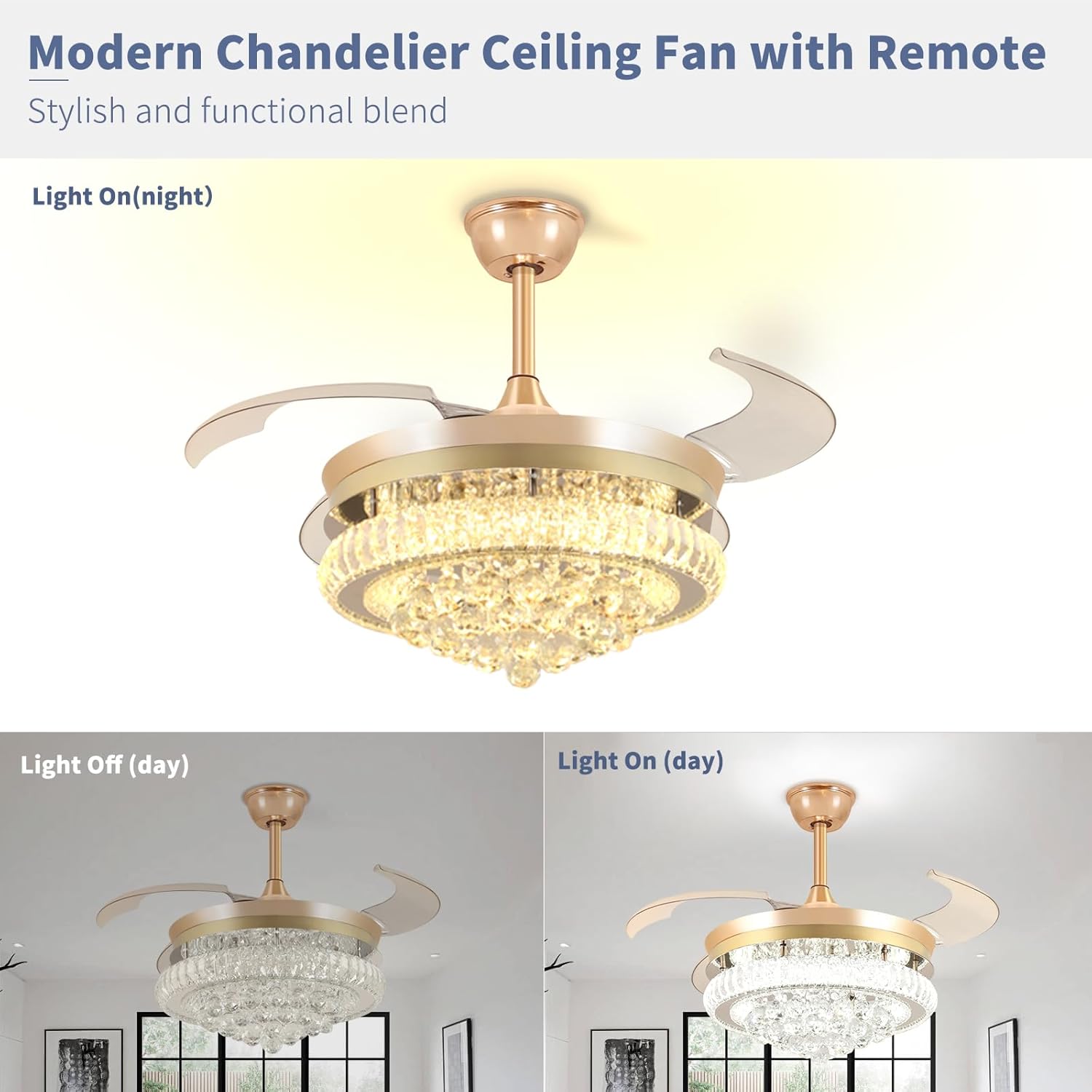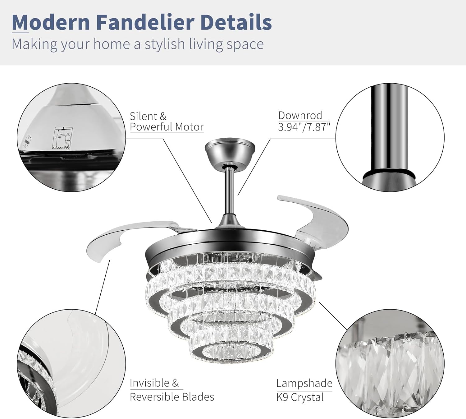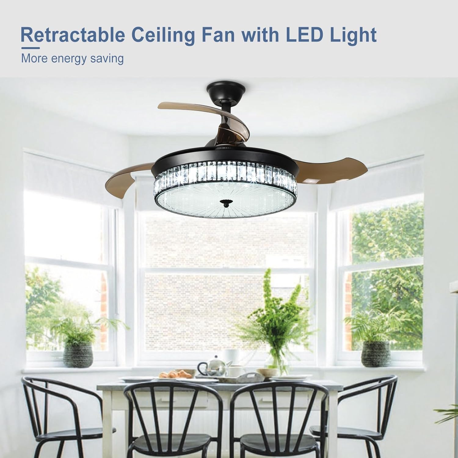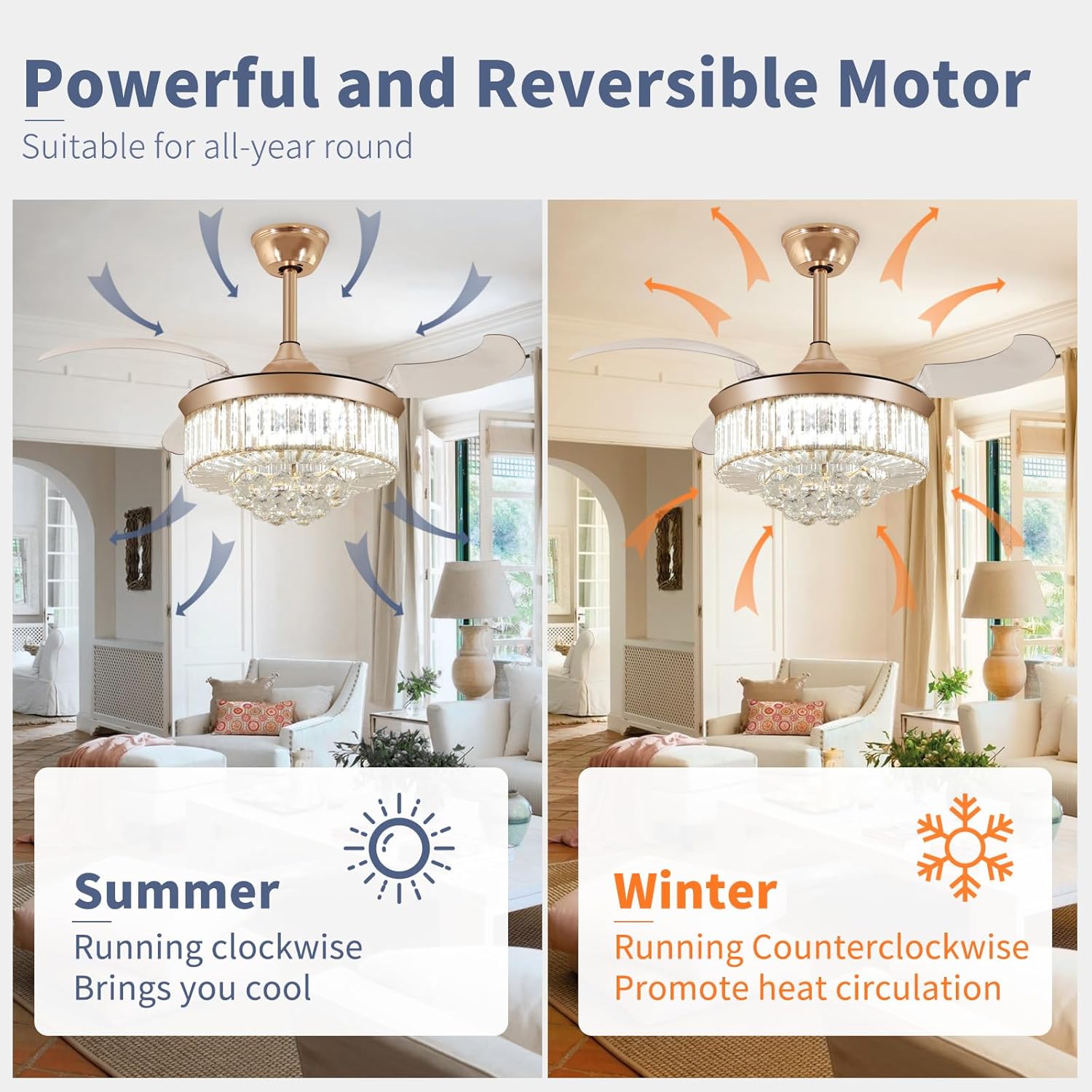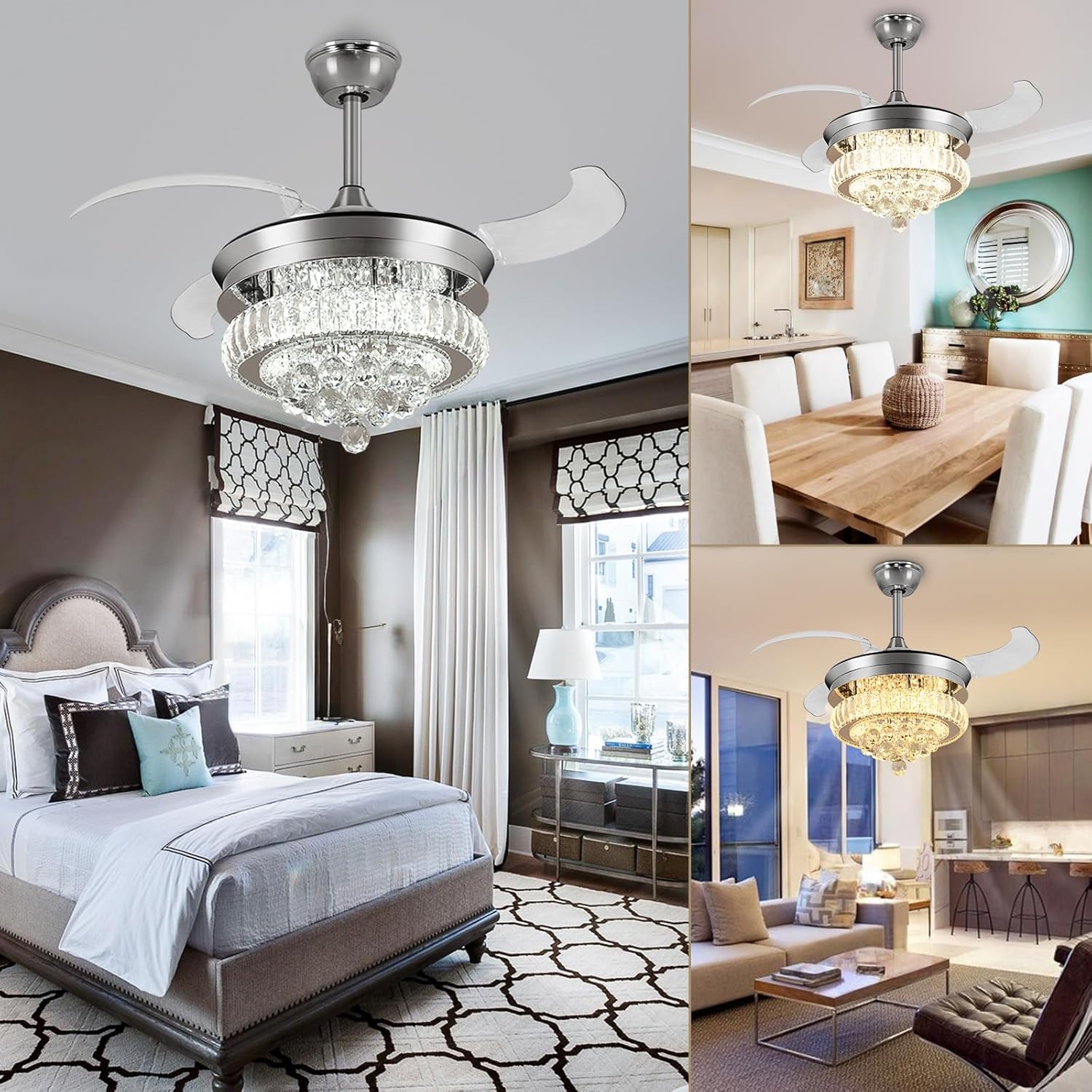 RETRACTABLE FAN BLADES: The retractable fan blades, made of high-temperature resistant and lightweight ABS material, are the perfect solution for maintaining the elegant shape of the crystal fandalier when not in use. The large volume of air driven by the fan blade is perfect for summer and also facilitates indoor hot air circulation in winter without direct blowing to you.