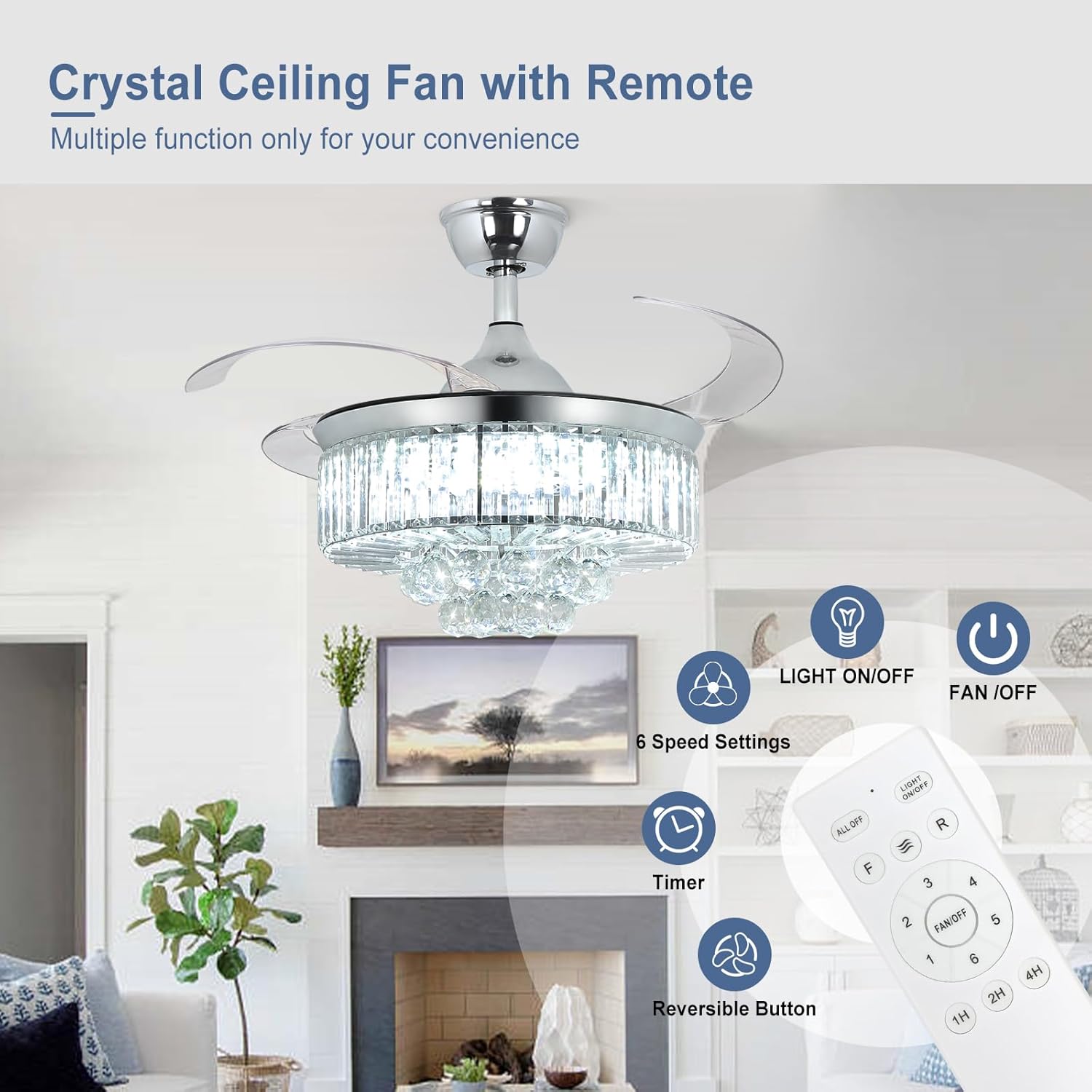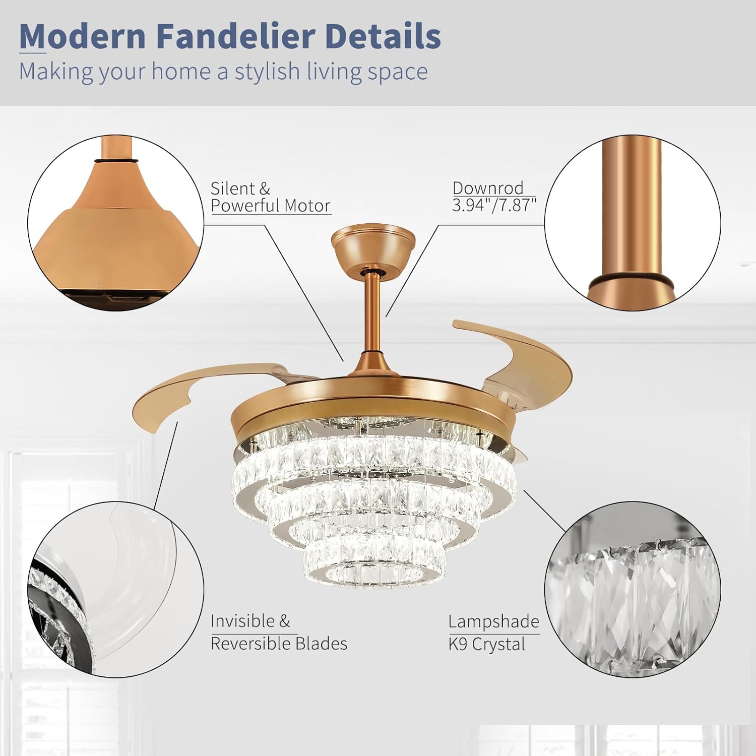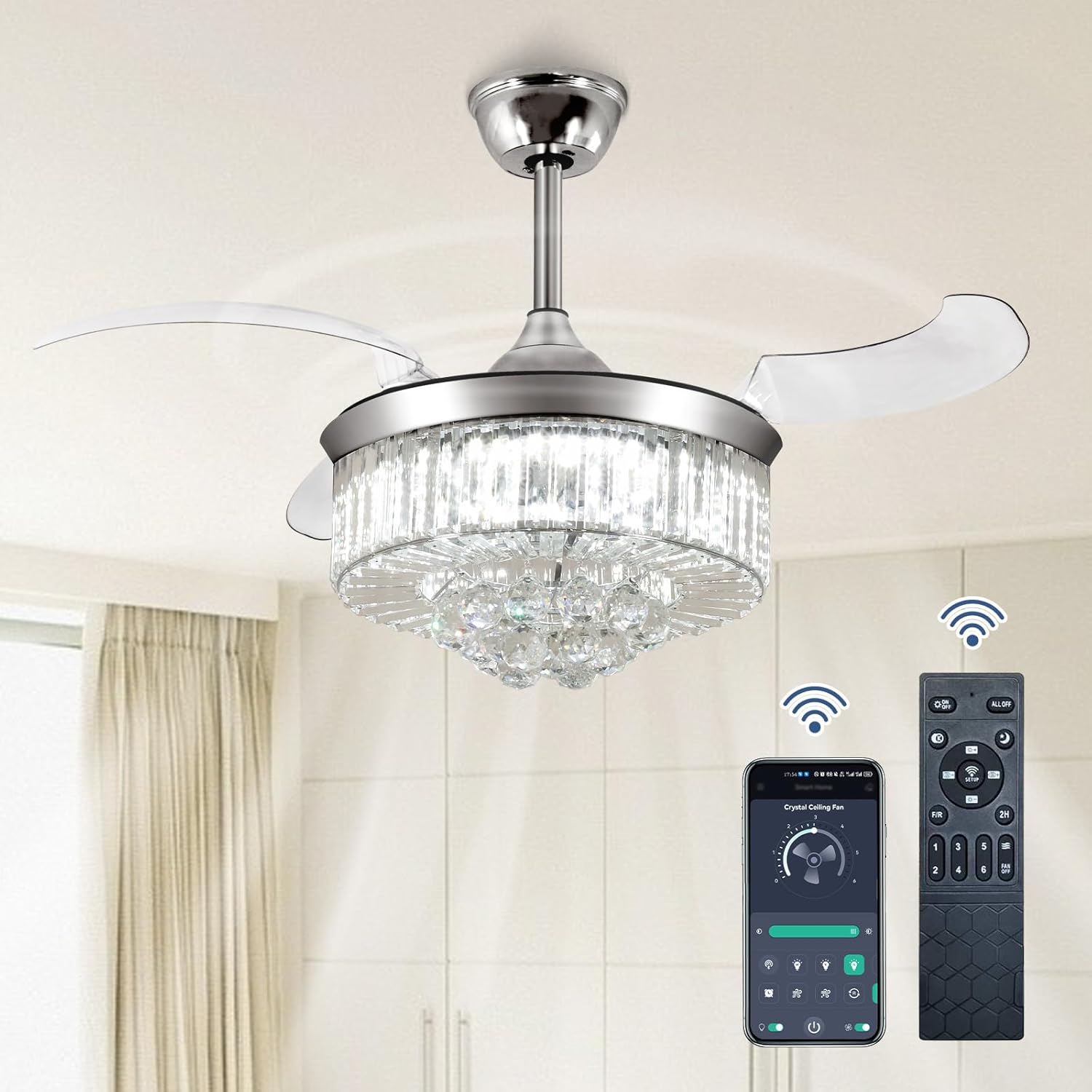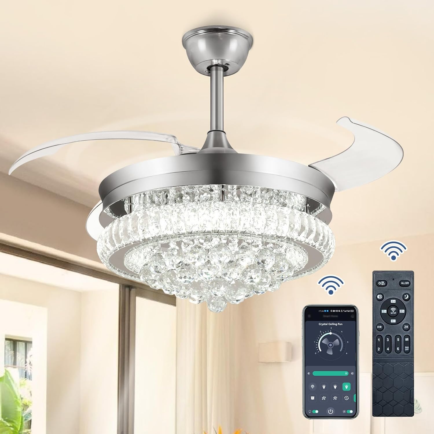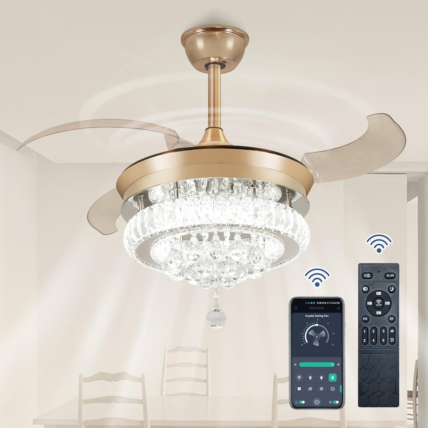 RETRACTABLE FAN BLADES: The retractable fan blades, made of high-temperature resistant and lightweight ABS material, are the perfect solution for maintaining the elegant shape of the crystal fandalier when not in use. The large volume of air driven by the fan blade is perfect for summer and also facilitates indoor hot air circulation in winter without direct blowing to you.