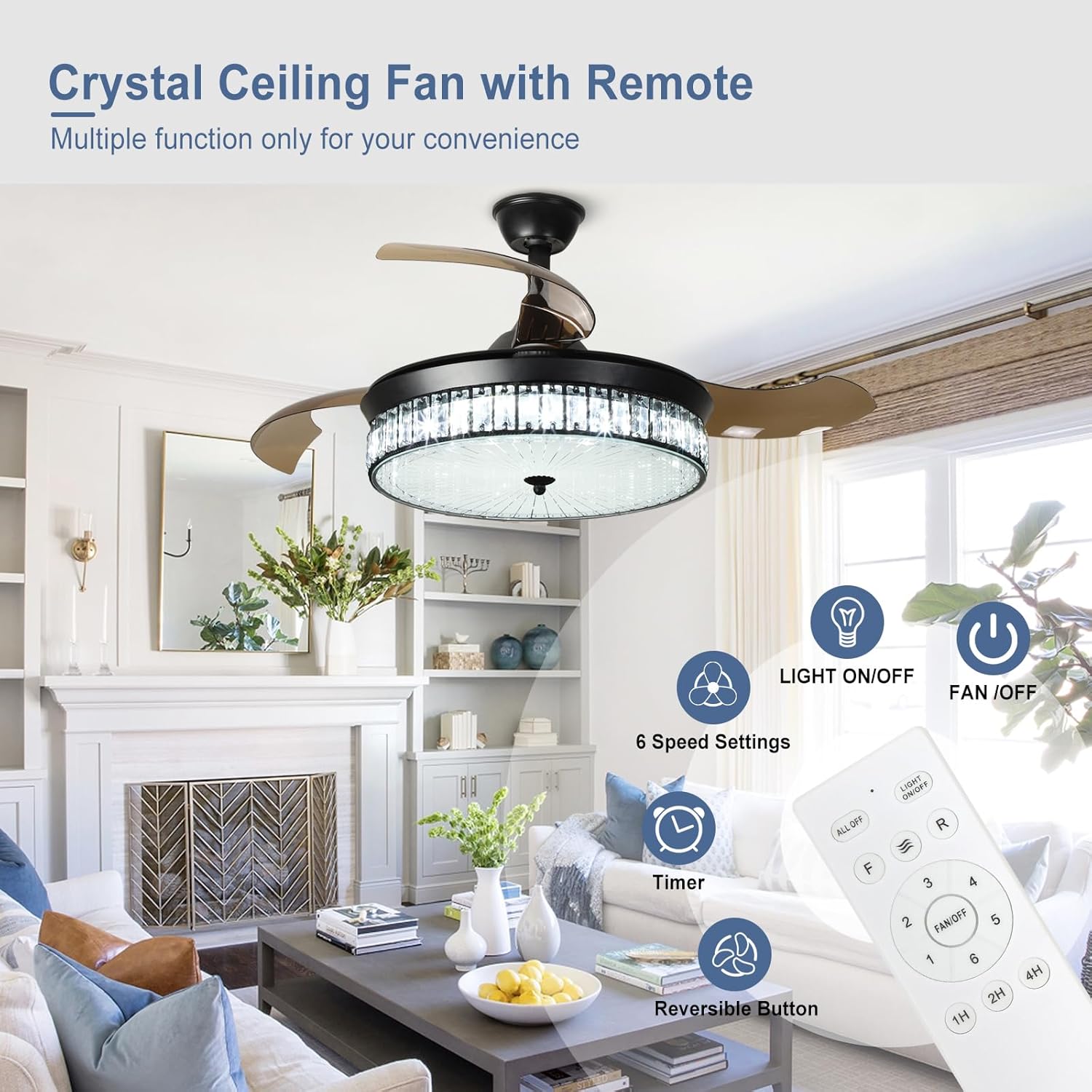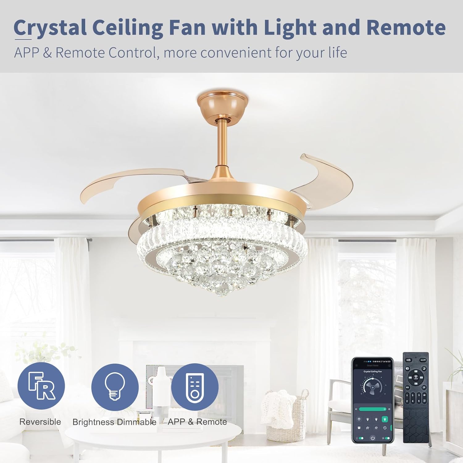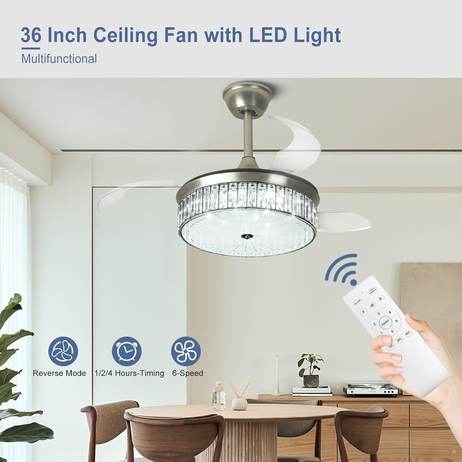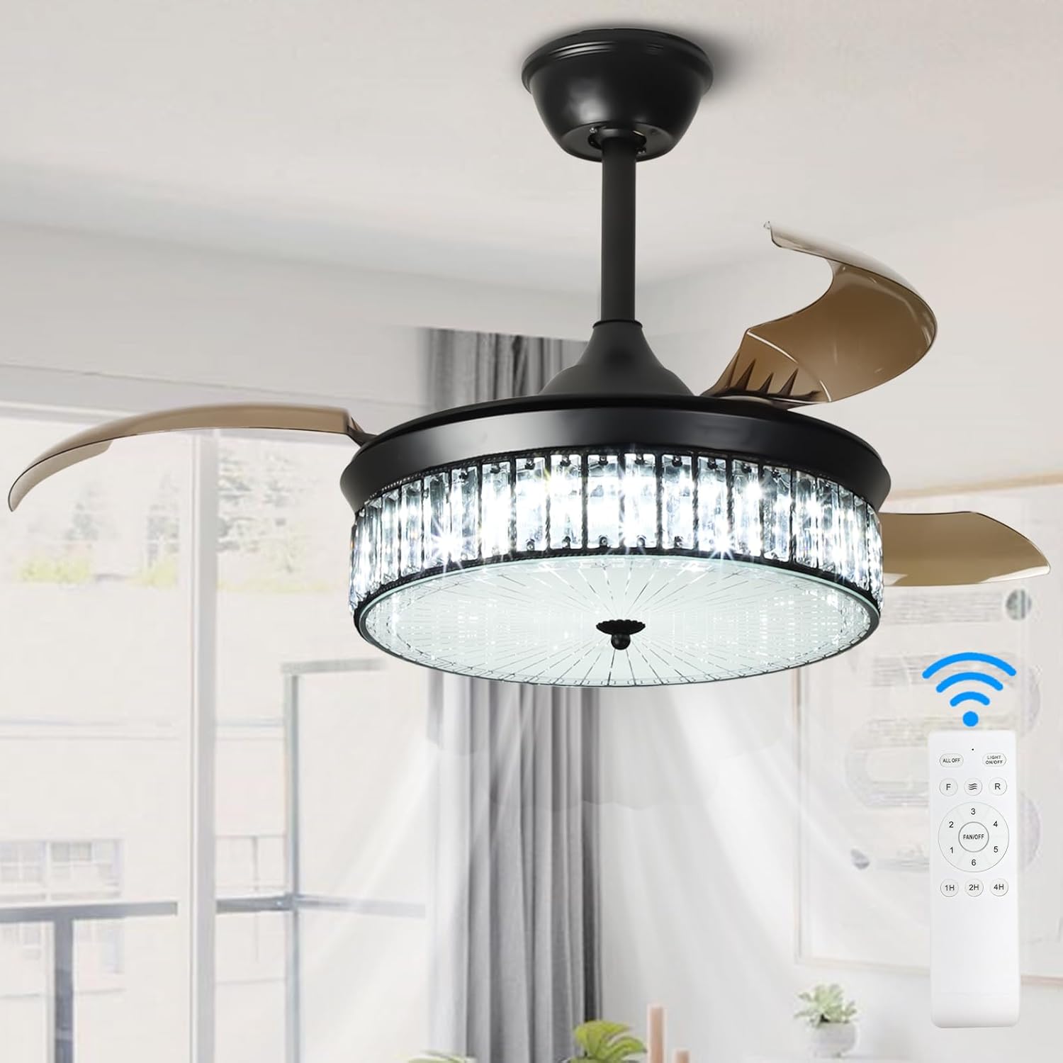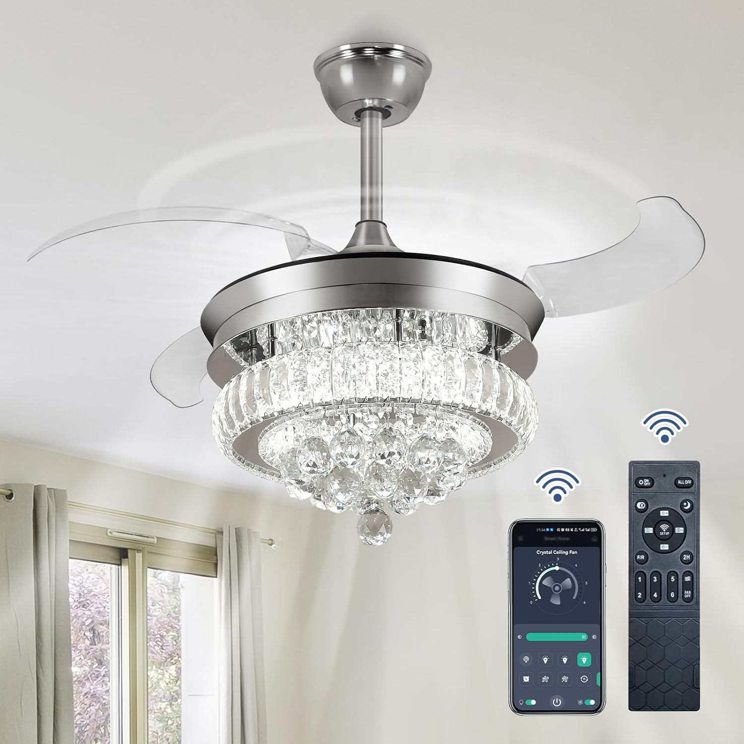 RETRACTABLE FAN BLADES: The retractable fan blades, made of high-temperature resistant and lightweight ABS material, are the perfect solution for maintaining the elegant shape of the crystal fandalier when not in use. The large volume of air driven by the fan blade is perfect for summer and also facilitates indoor hot air circulation in winter without direct blowing to you.