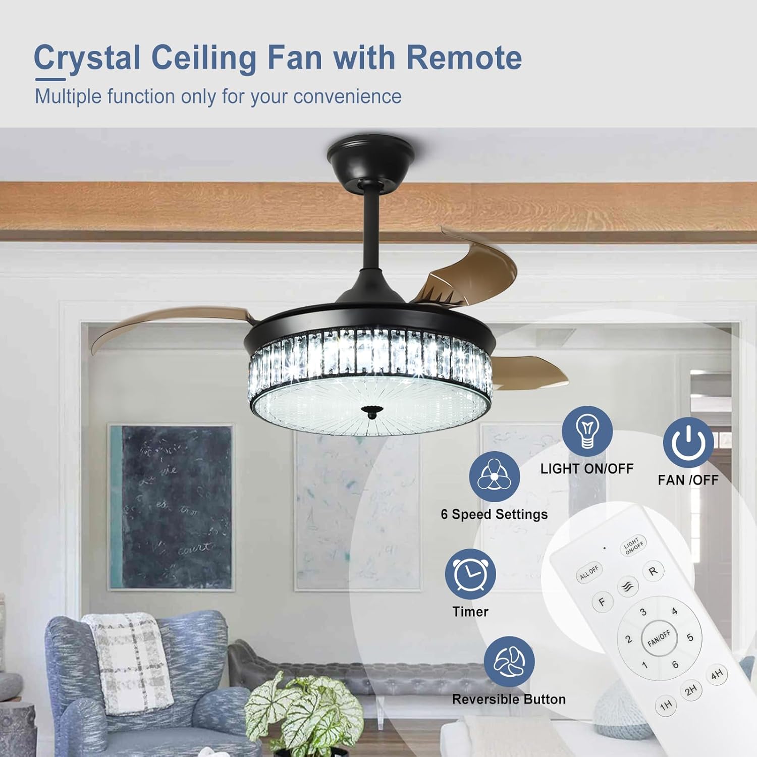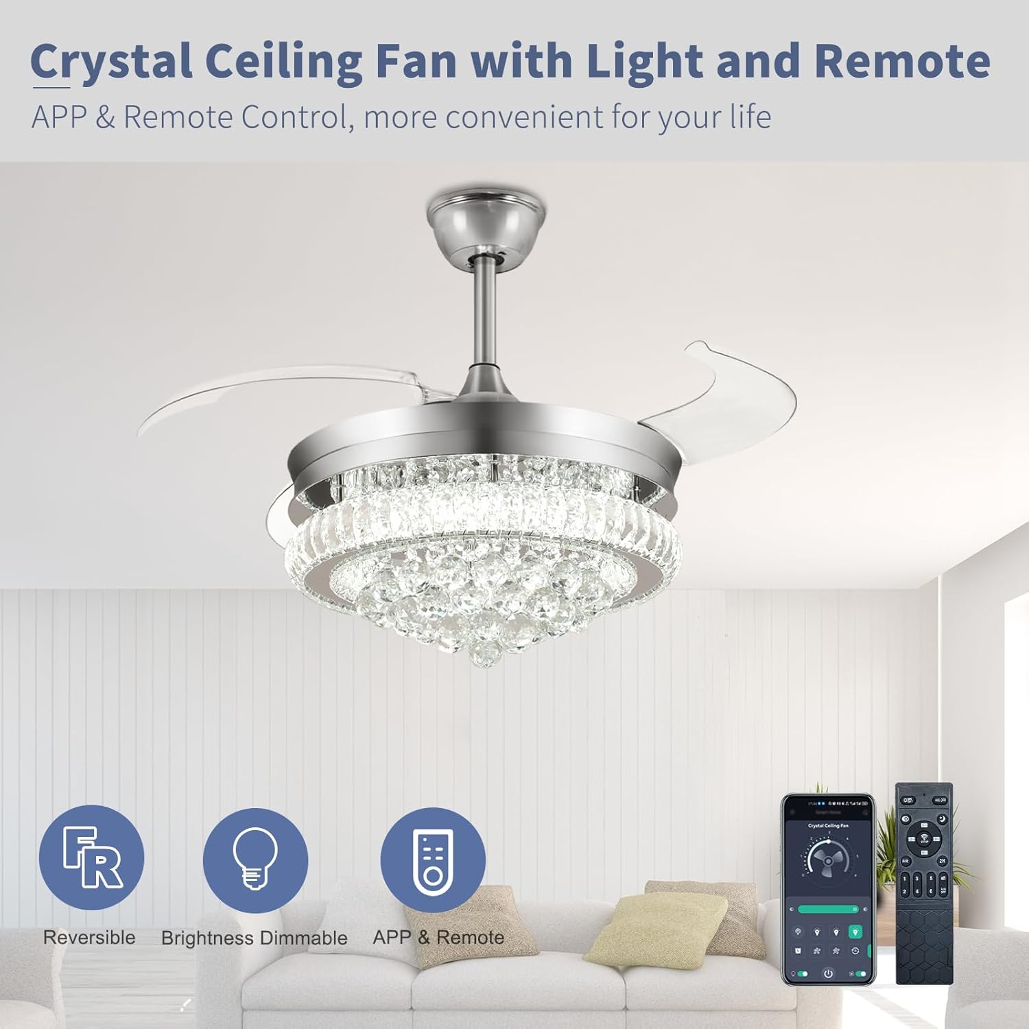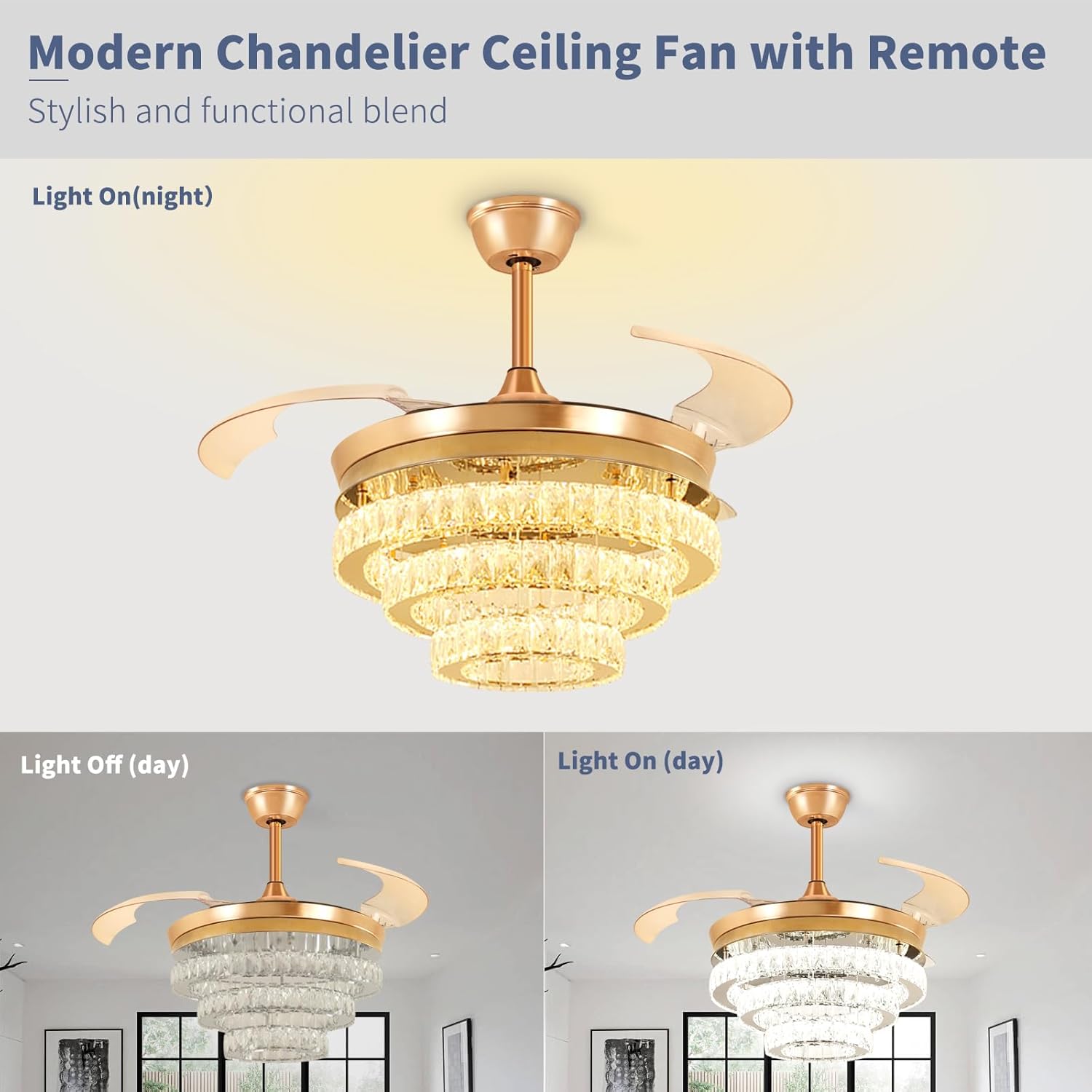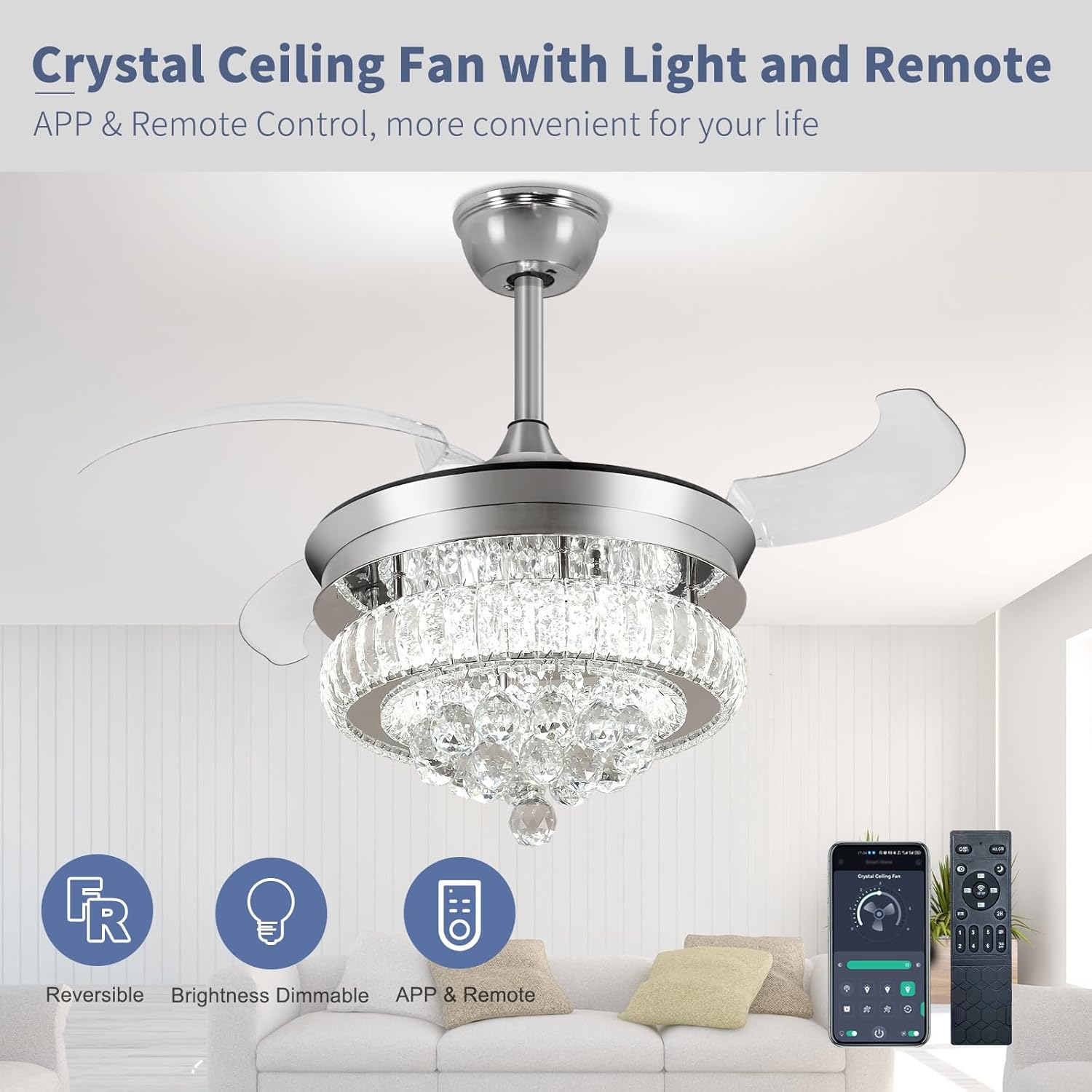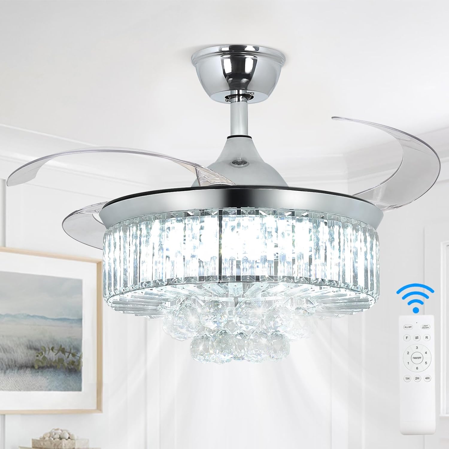 RETRACTABLE FAN BLADES: The retractable fan blades, made of high-temperature resistant and lightweight ABS material, are the perfect solution for maintaining the elegant shape of the crystal fandalier when not in use. The large volume of air driven by the fan blade is perfect for summer and also facilitates indoor hot air circulation in winter without direct blowing to you.