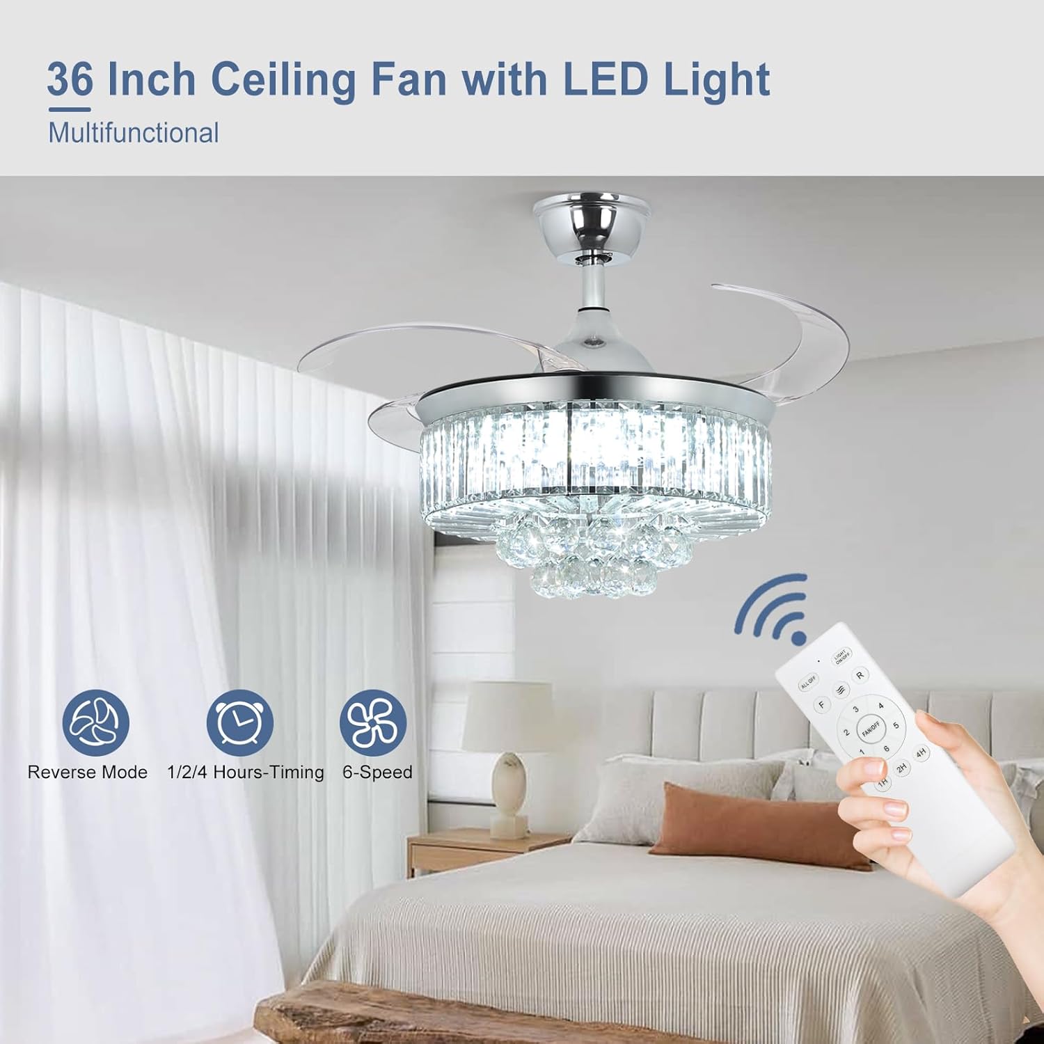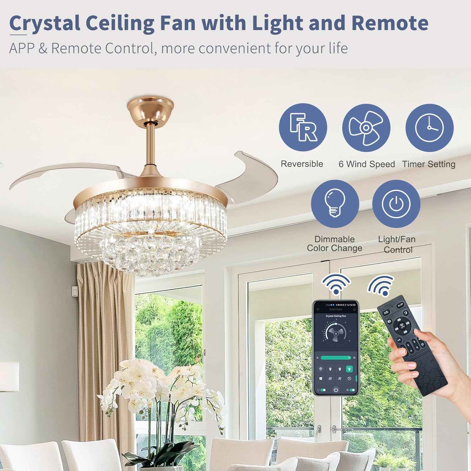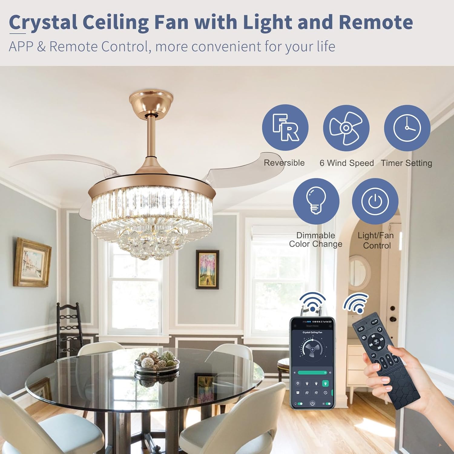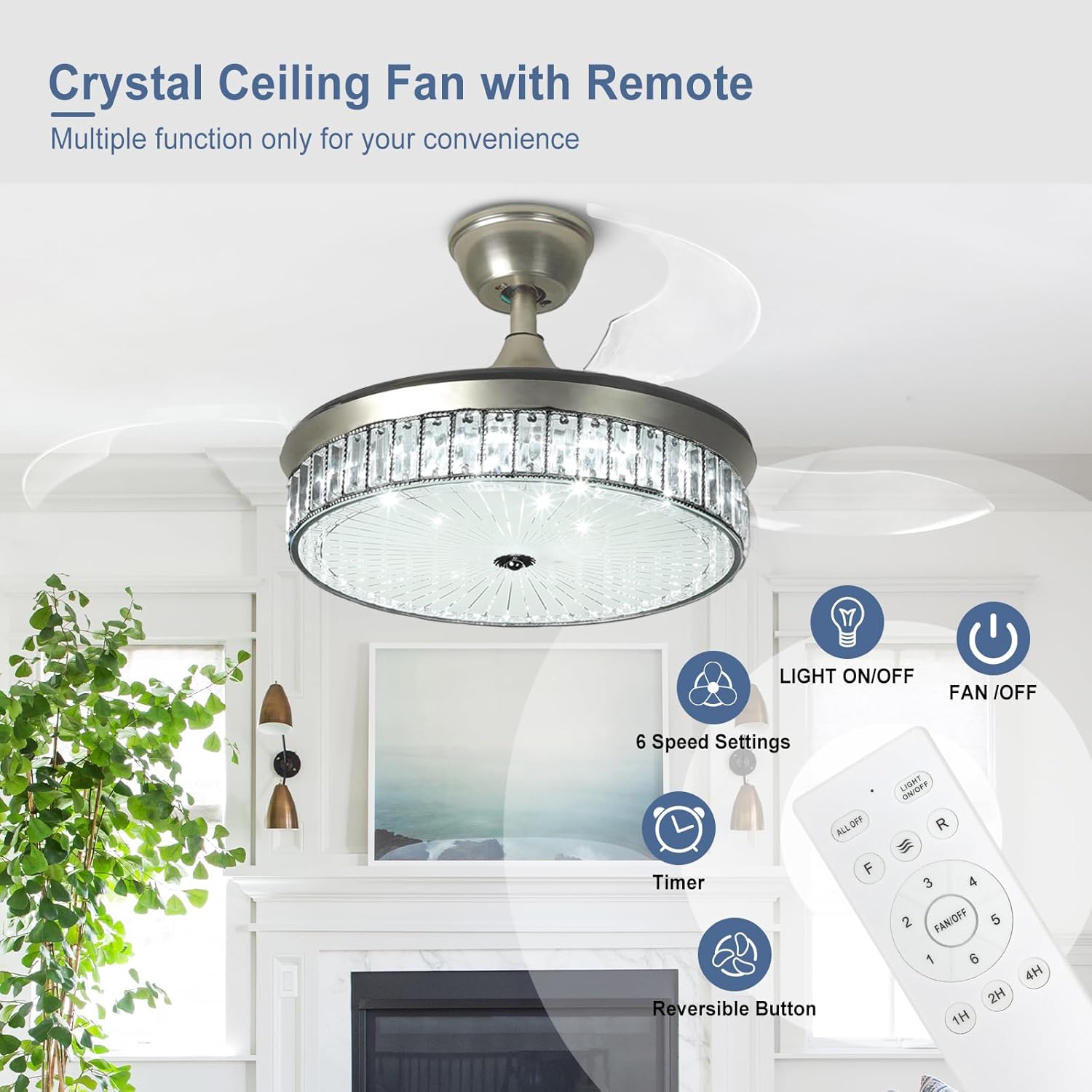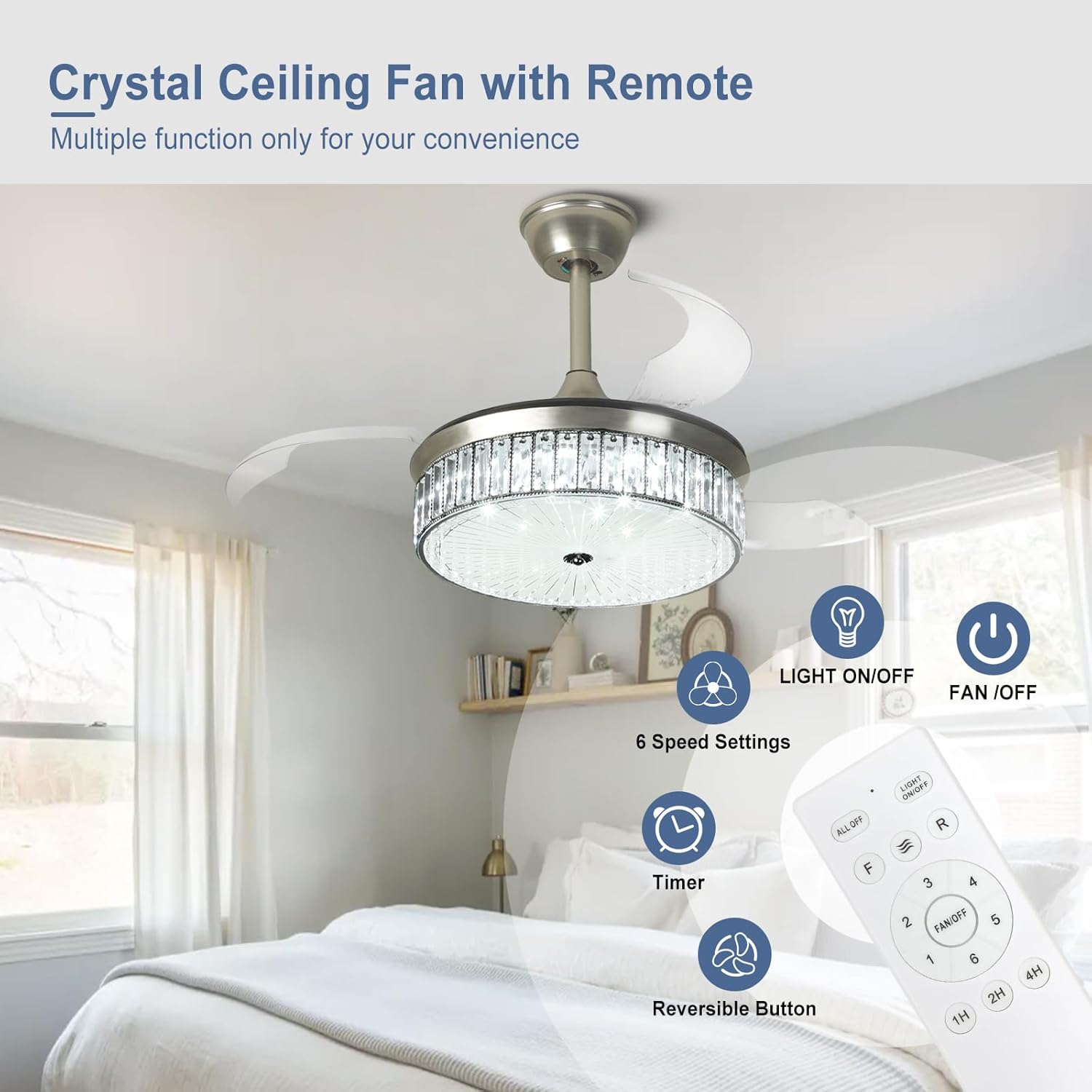 RETRACTABLE FAN BLADES: The retractable fan blades, made of high-temperature resistant and lightweight ABS material, are the perfect solution for maintaining the elegant shape of the crystal fandalier when not in use. The large volume of air driven by the fan blade is perfect for summer and also facilitates indoor hot air circulation in winter without direct blowing to you.