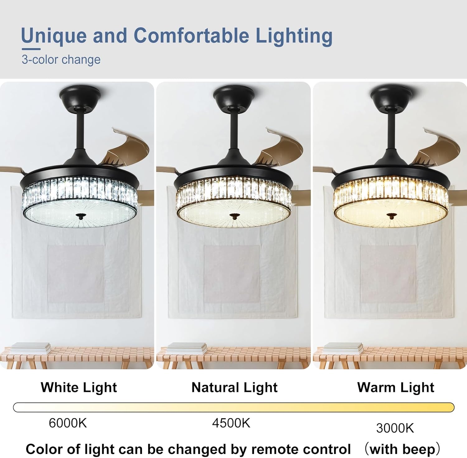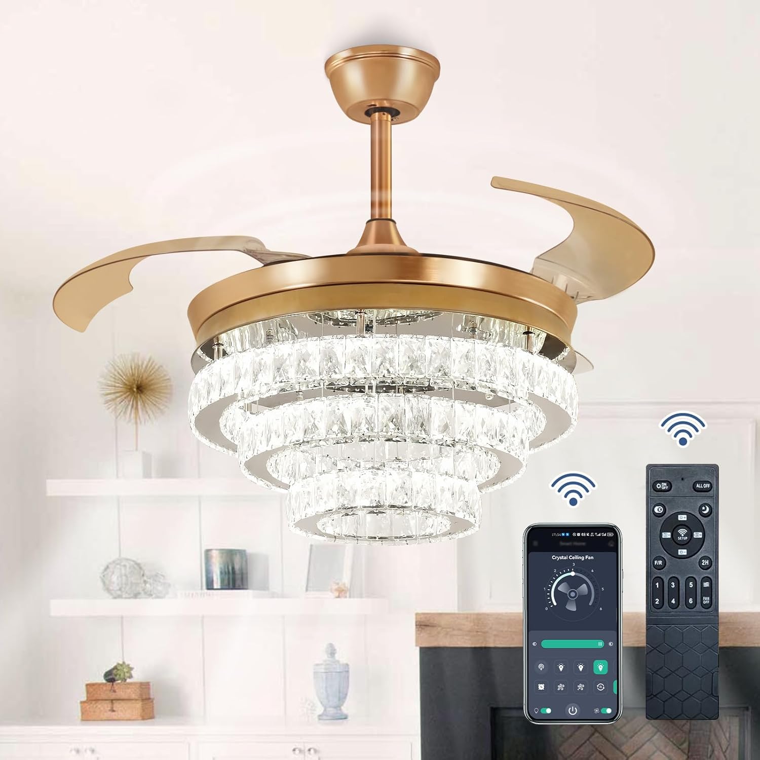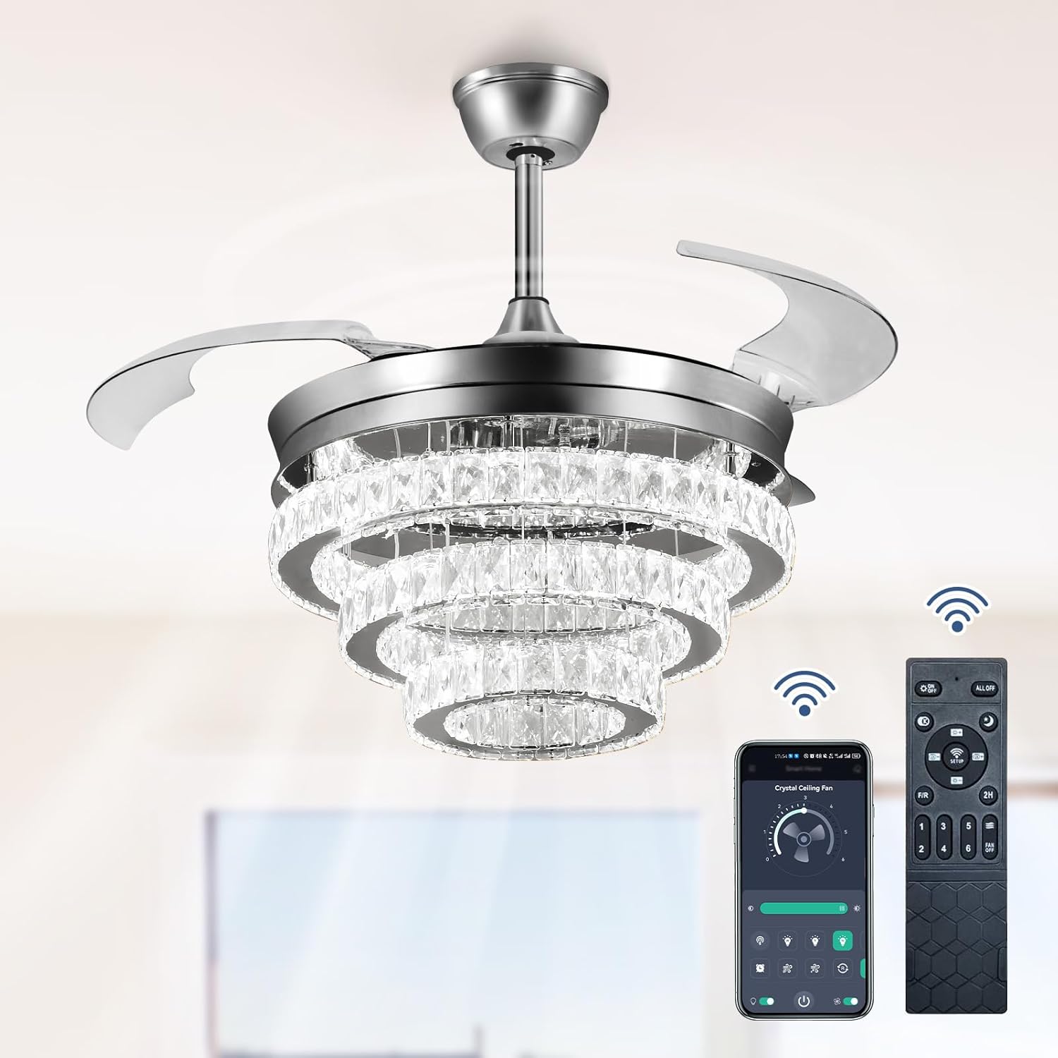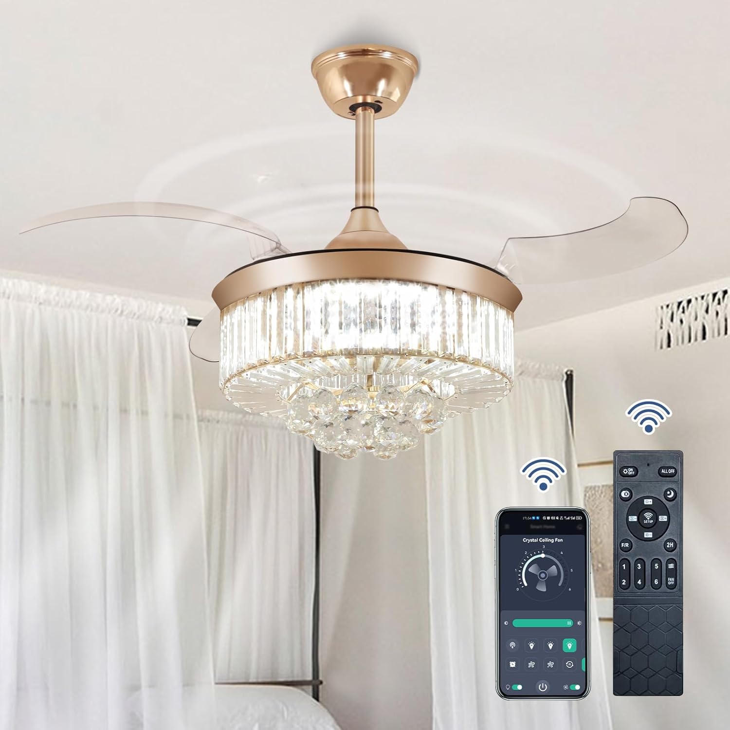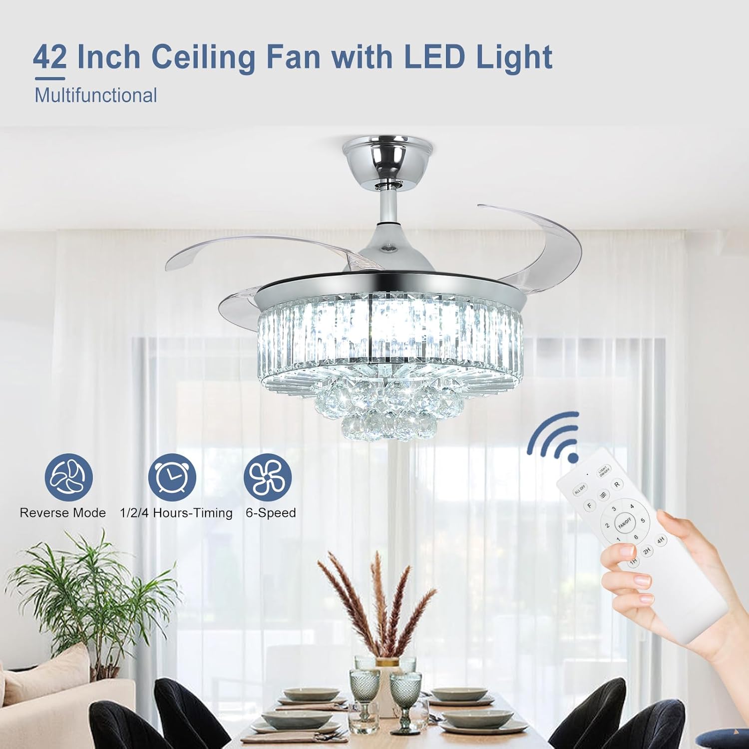 RETRACTABLE FAN BLADES: The retractable fan blades, made of high-temperature resistant and lightweight ABS material, are the perfect solution for maintaining the elegant shape of the crystal fandalier when not in use. The large volume of air driven by the fan blade is perfect for summer and also facilitates indoor hot air circulation in winter without direct blowing to you.