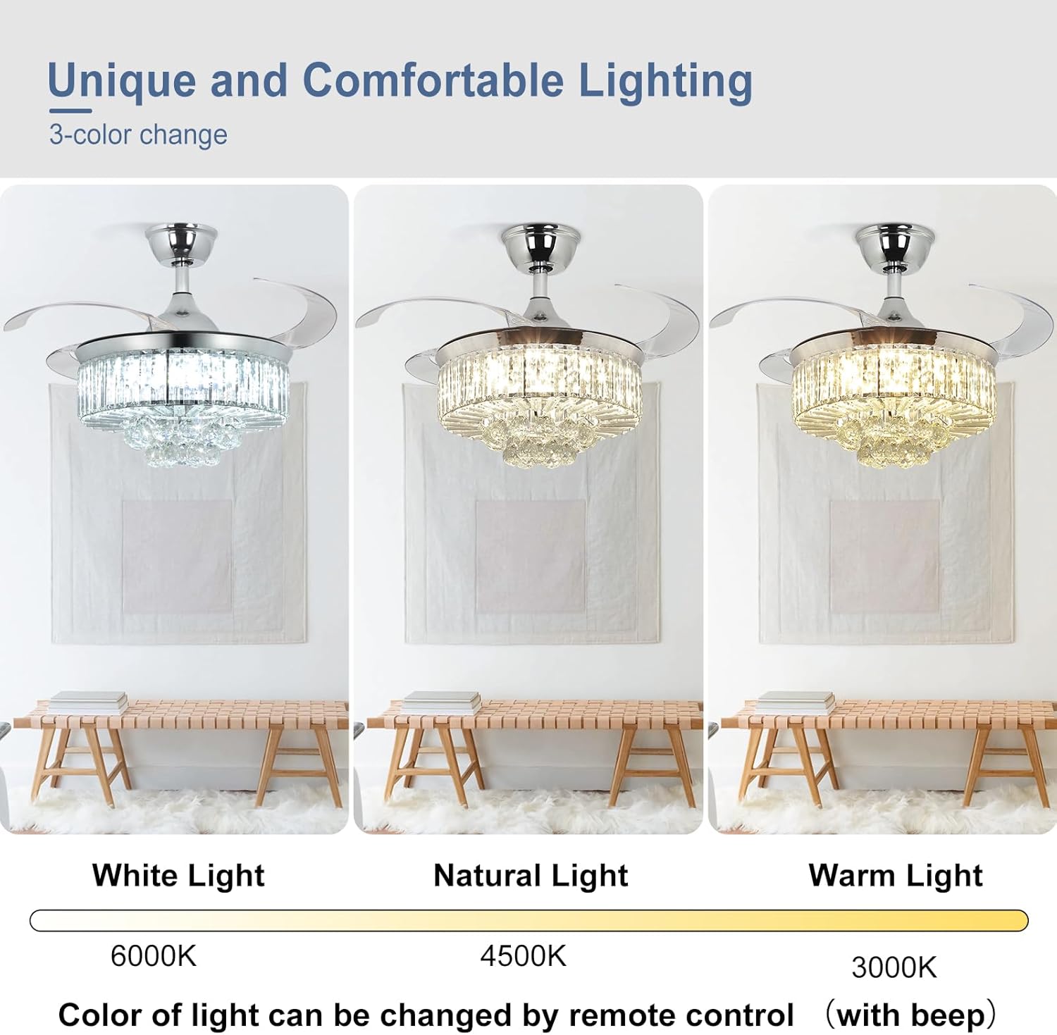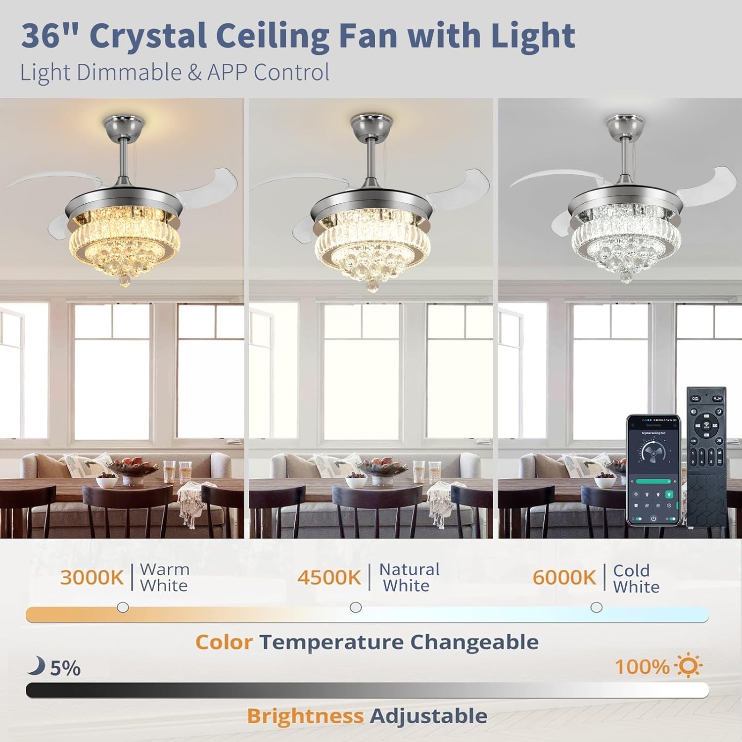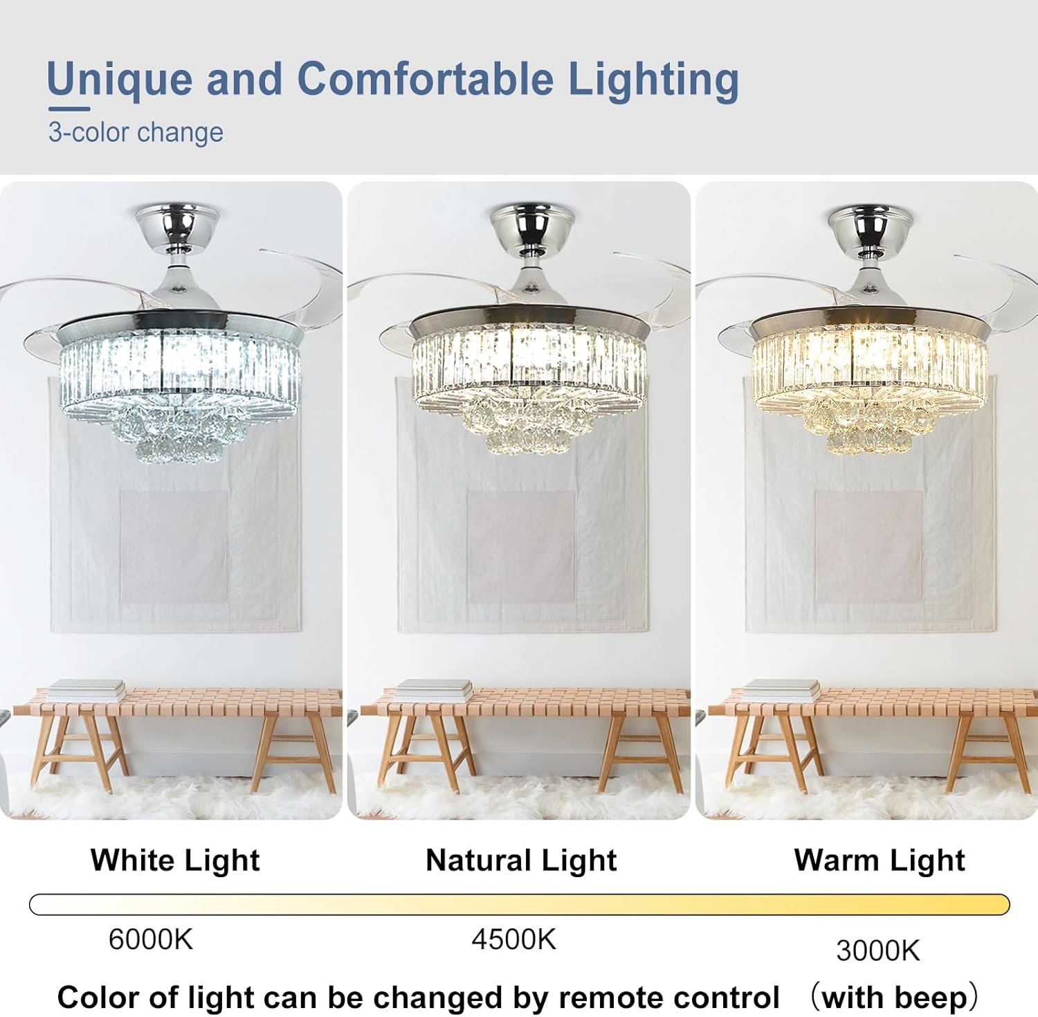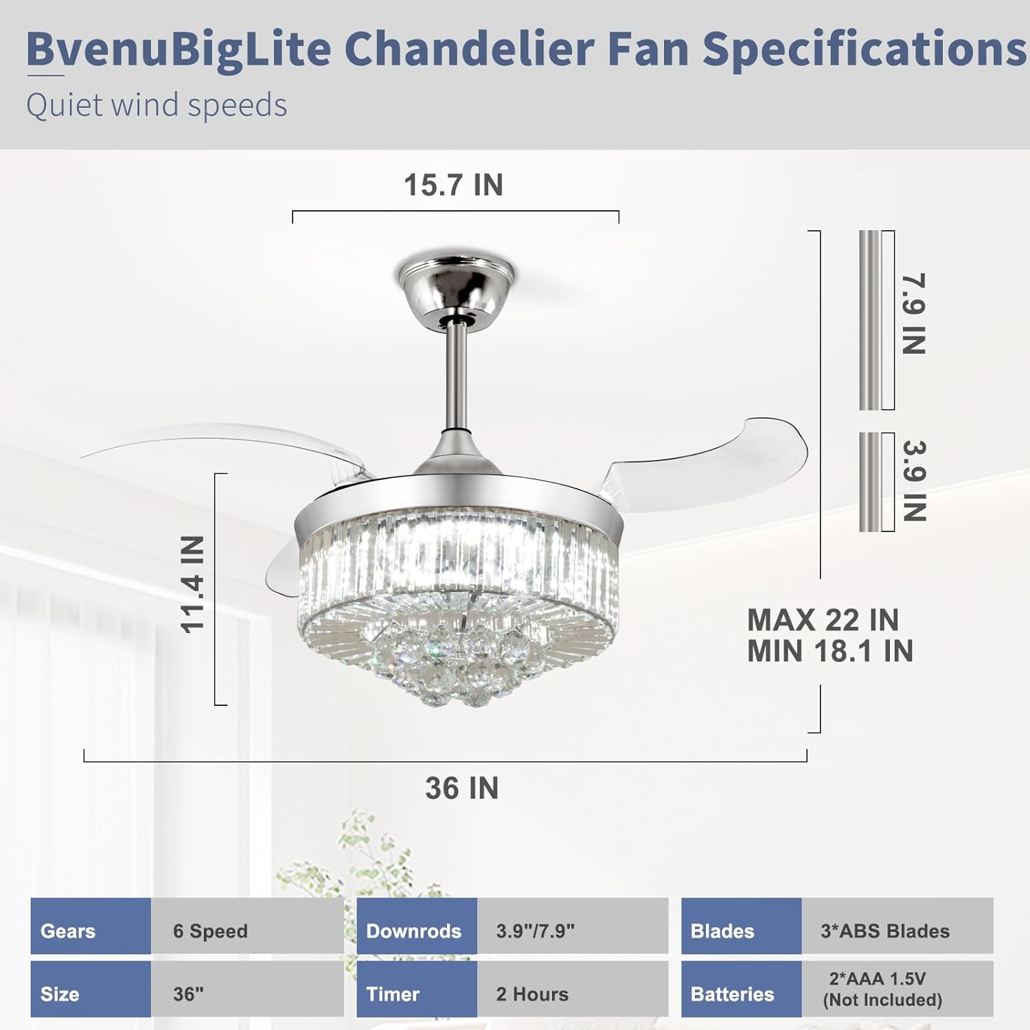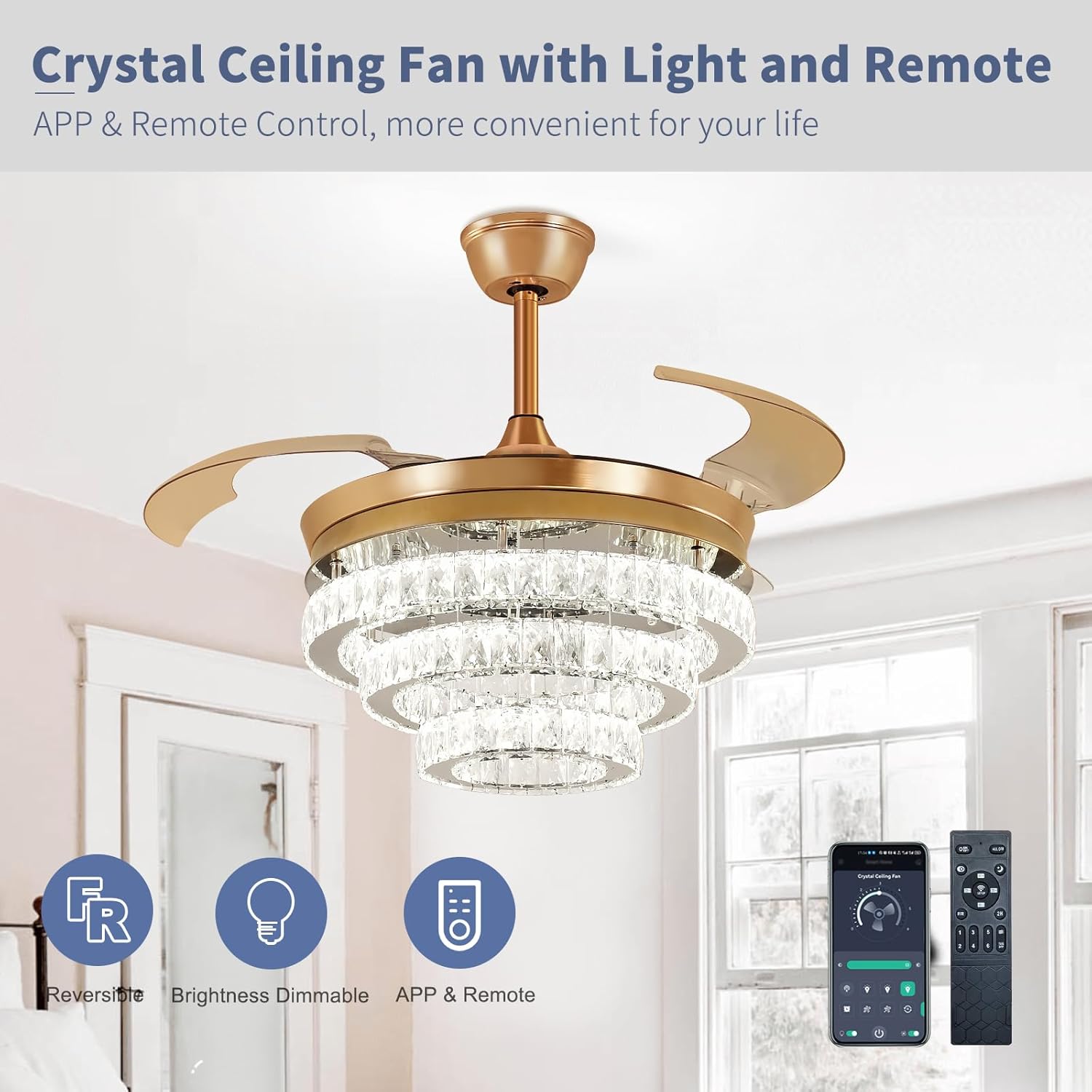 RETRACTABLE FAN BLADES: The retractable fan blades, made of high-temperature resistant and lightweight ABS material, are the perfect solution for maintaining the elegant shape of the crystal fandalier when not in use. The large volume of air driven by the fan blade is perfect for summer and also facilitates indoor hot air circulation in winter without direct blowing to you.
