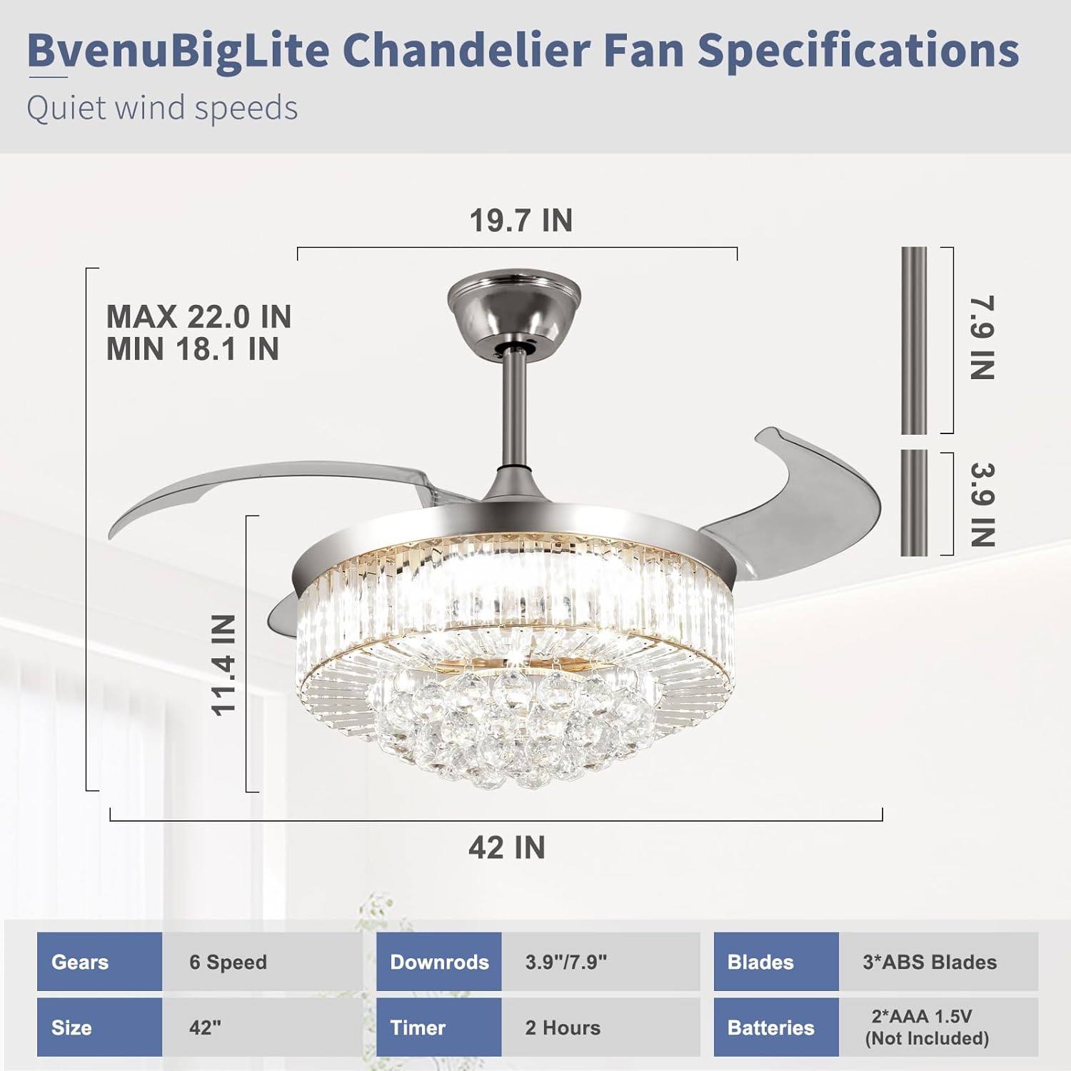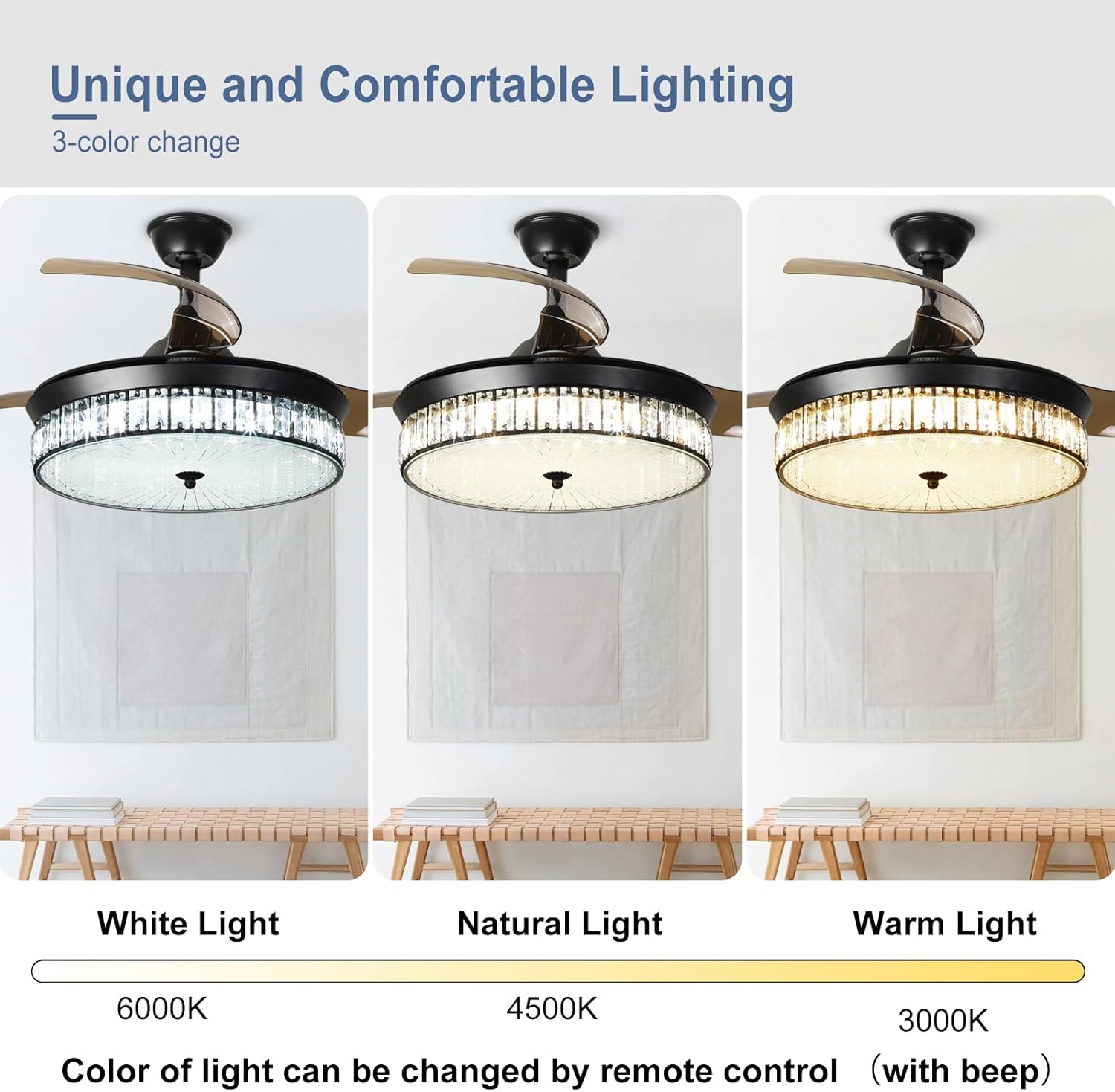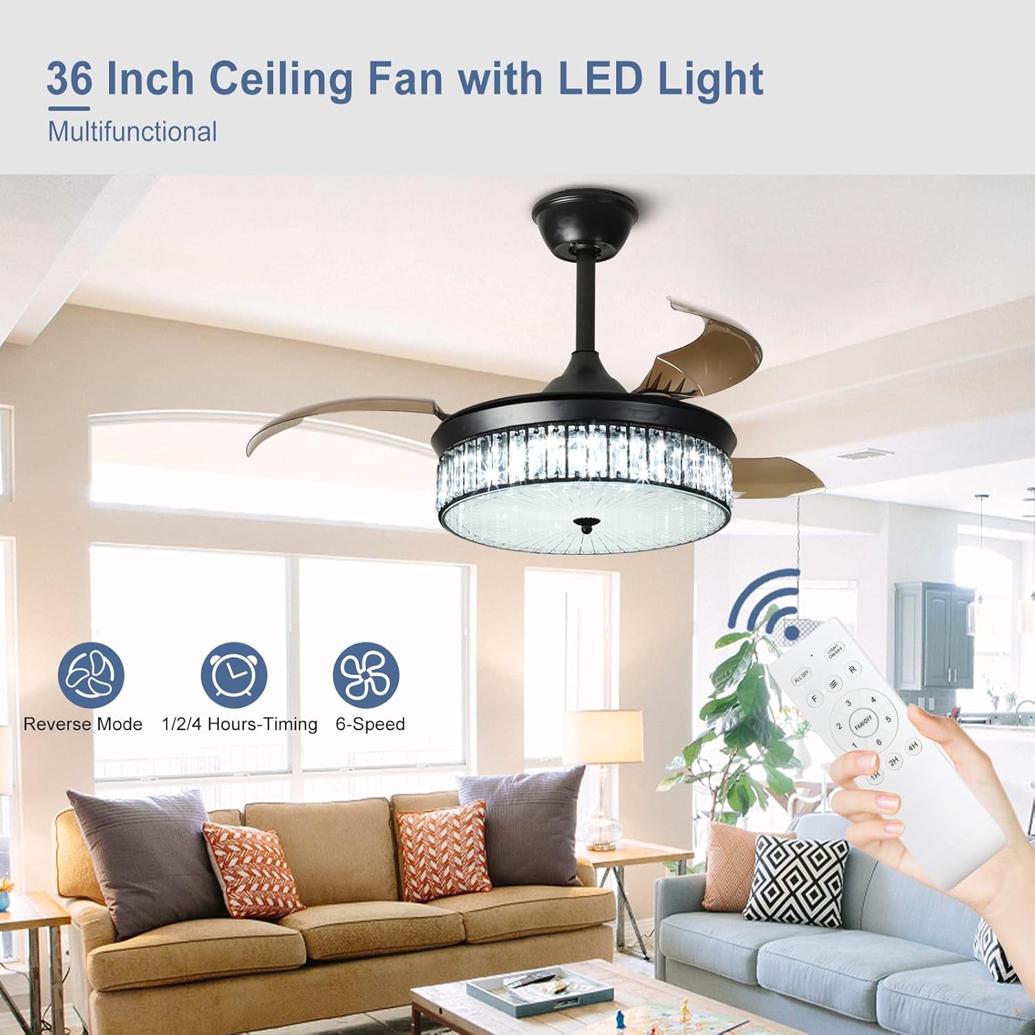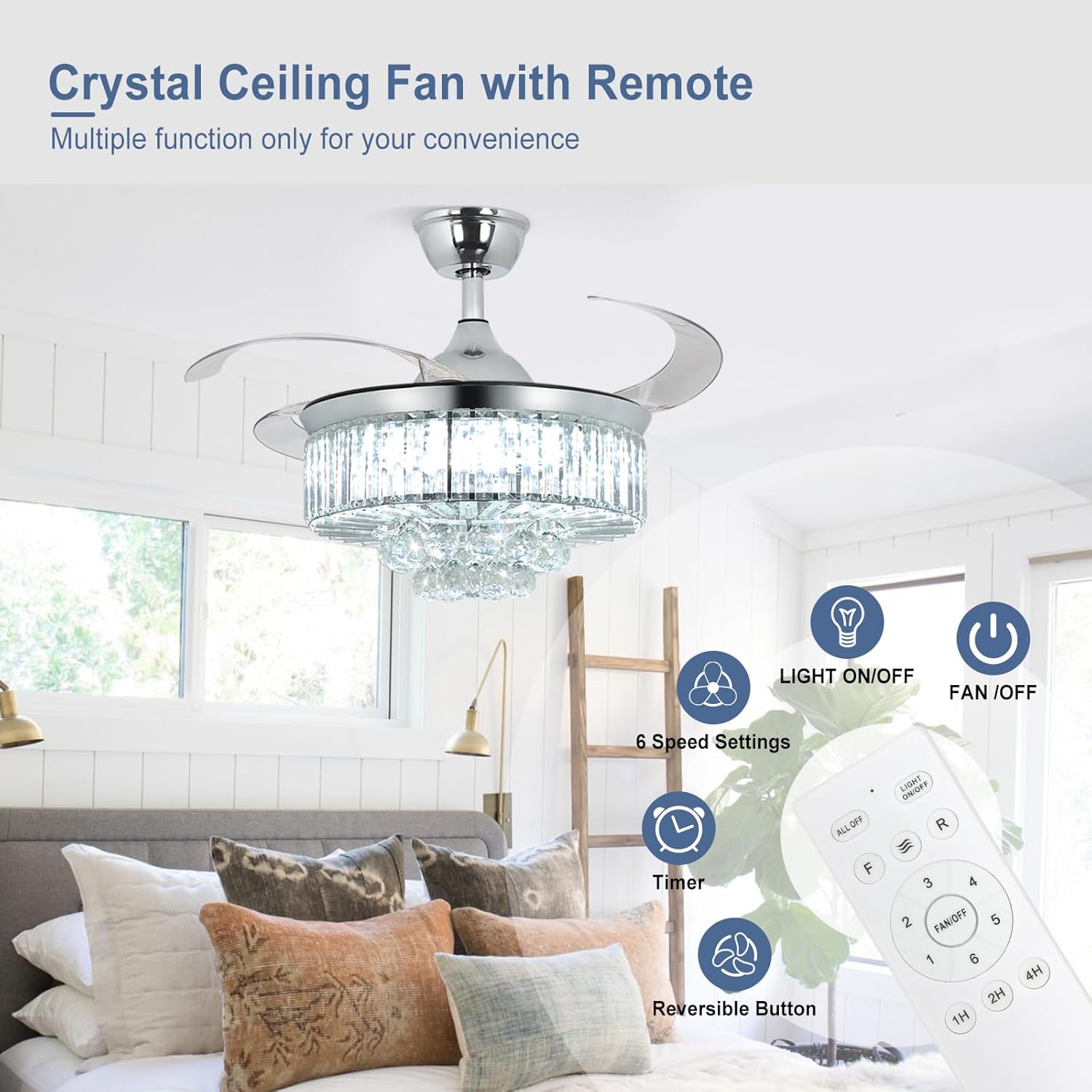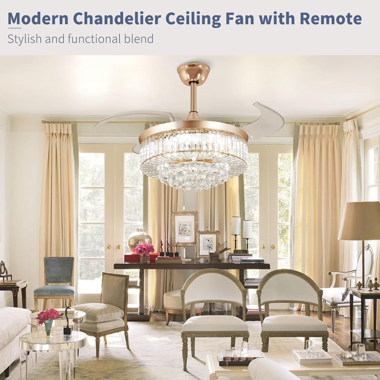 RETRACTABLE FAN BLADES: The retractable fan blades, made of high-temperature resistant and lightweight ABS material, are the perfect solution for maintaining the elegant shape of the crystal fandalier when not in use. The large volume of air driven by the fan blade is perfect for summer and also facilitates indoor hot air circulation in winter without direct blowing to you.