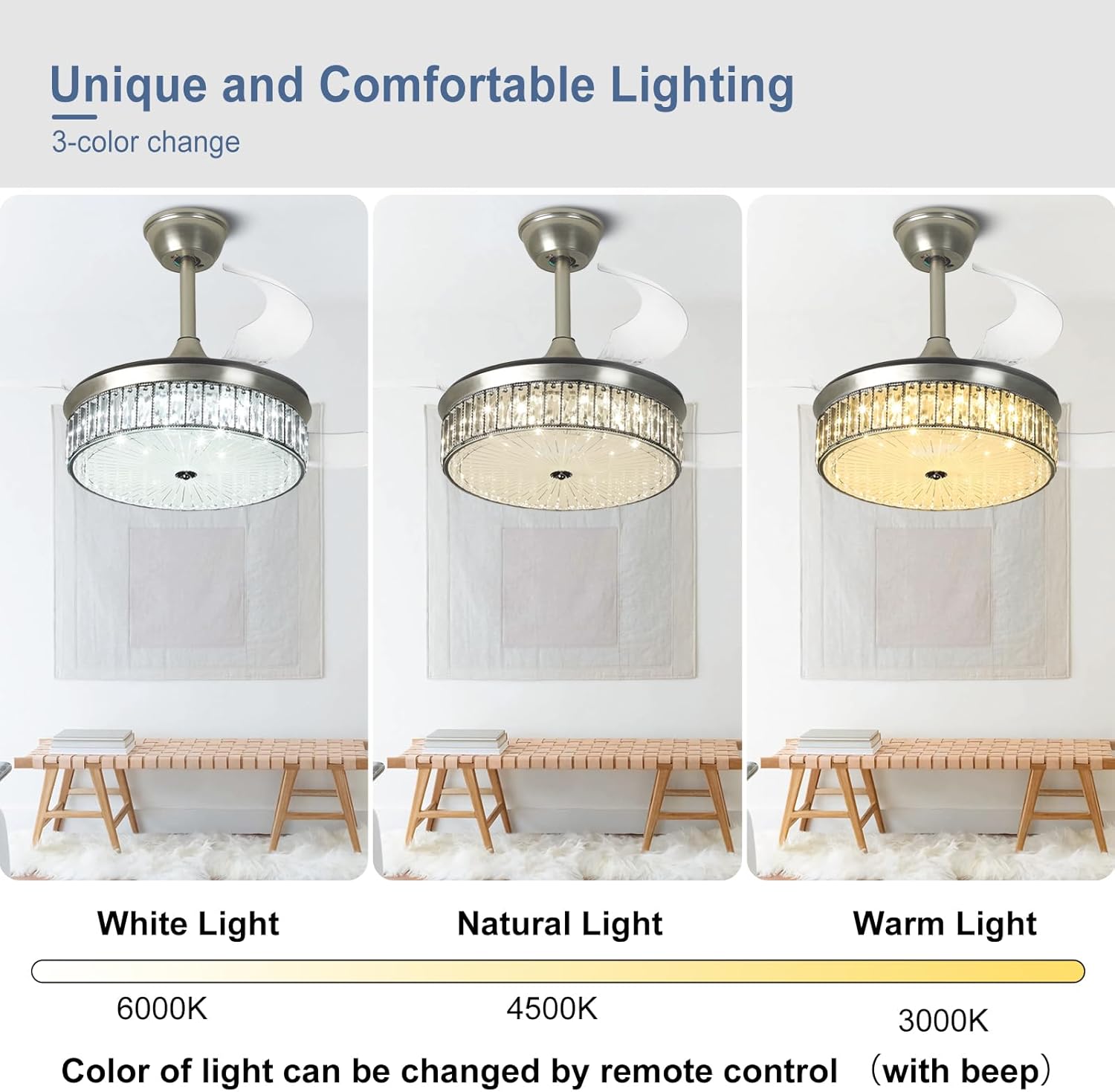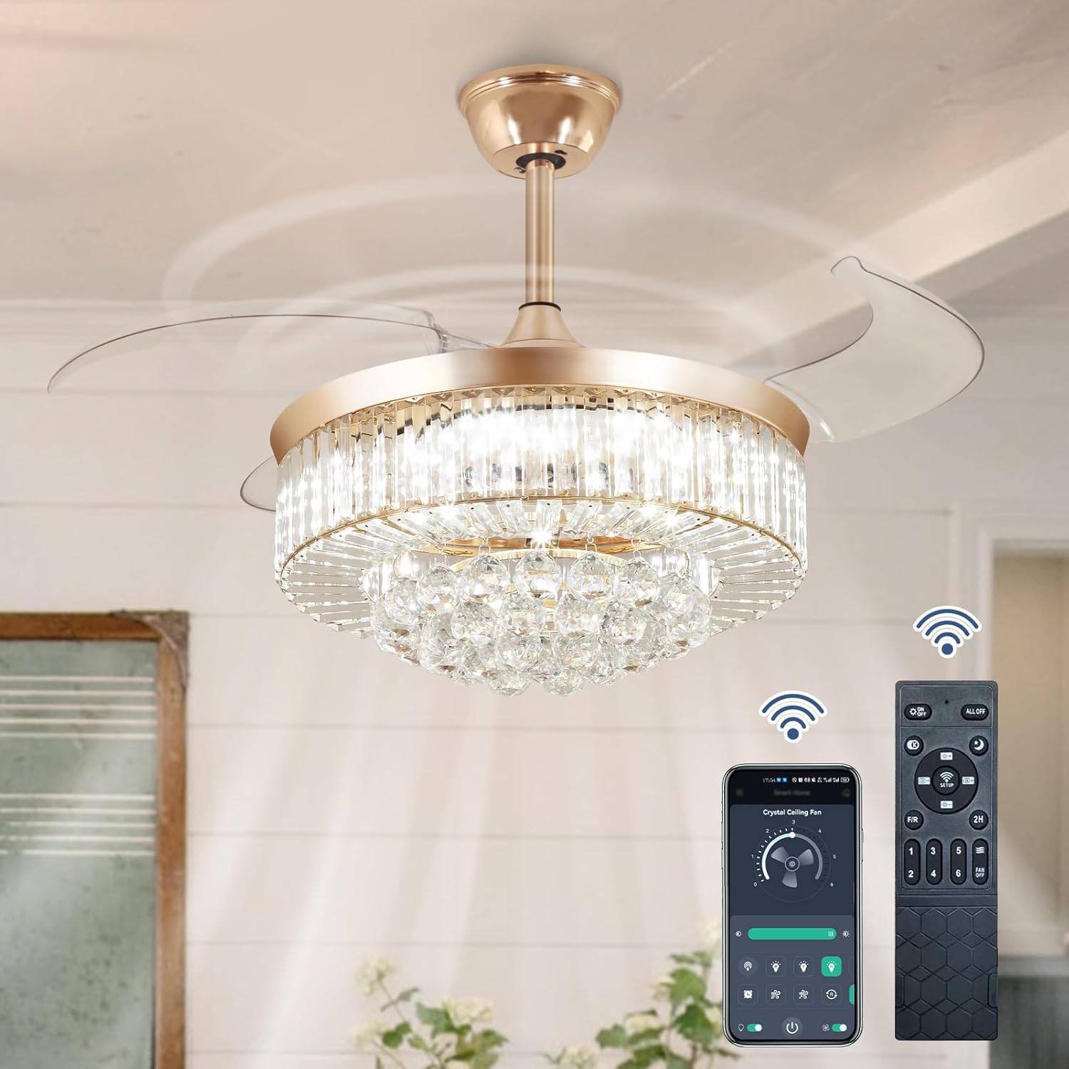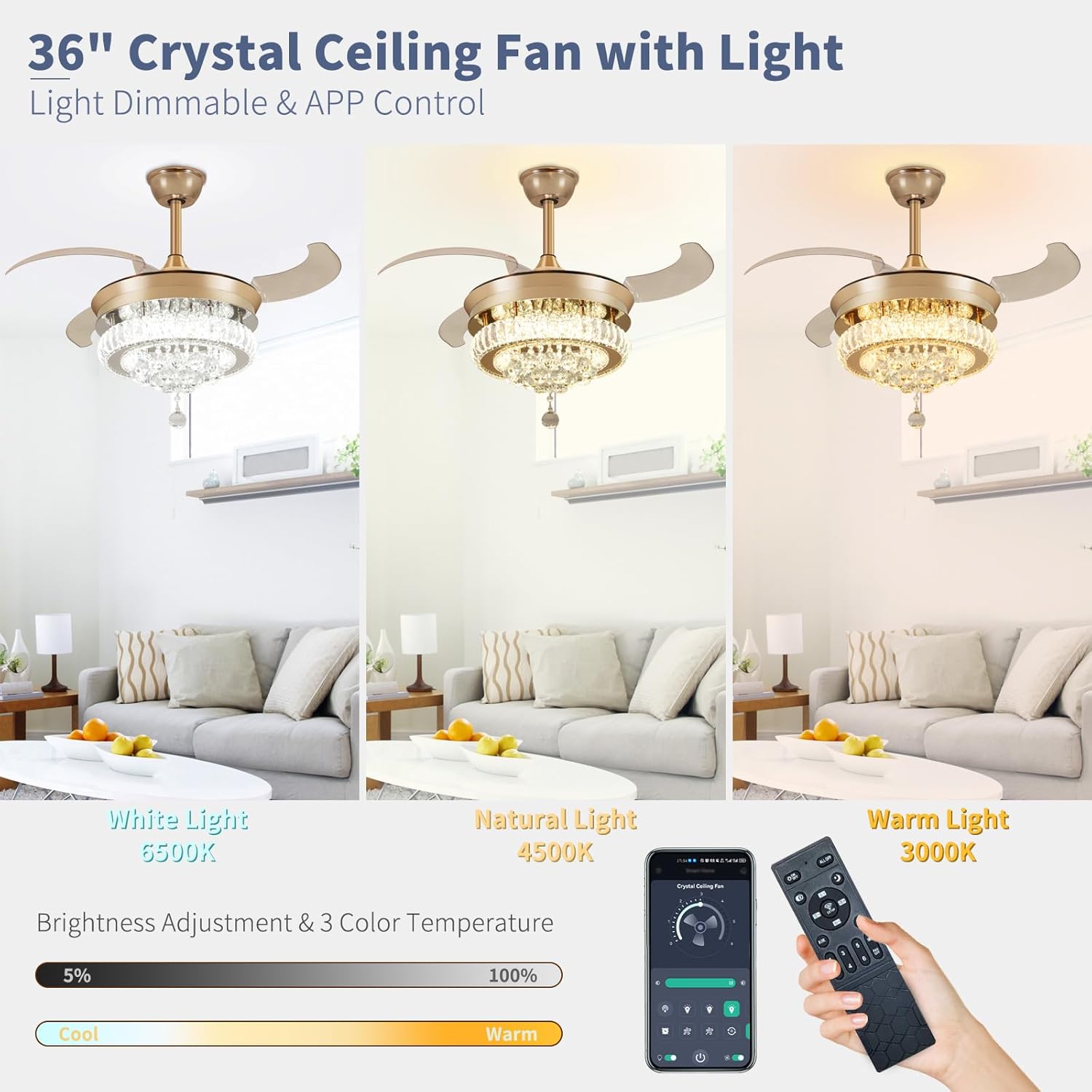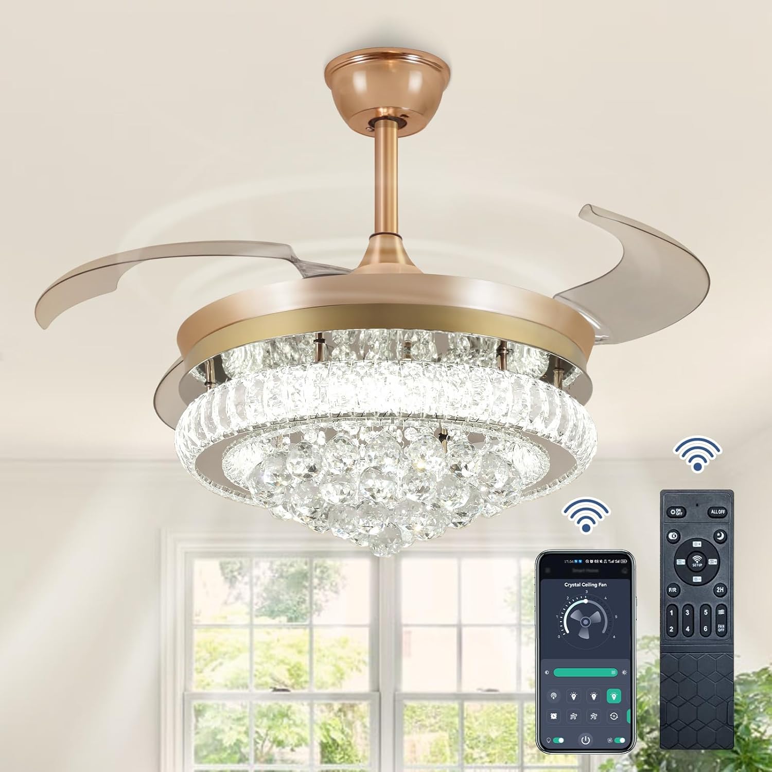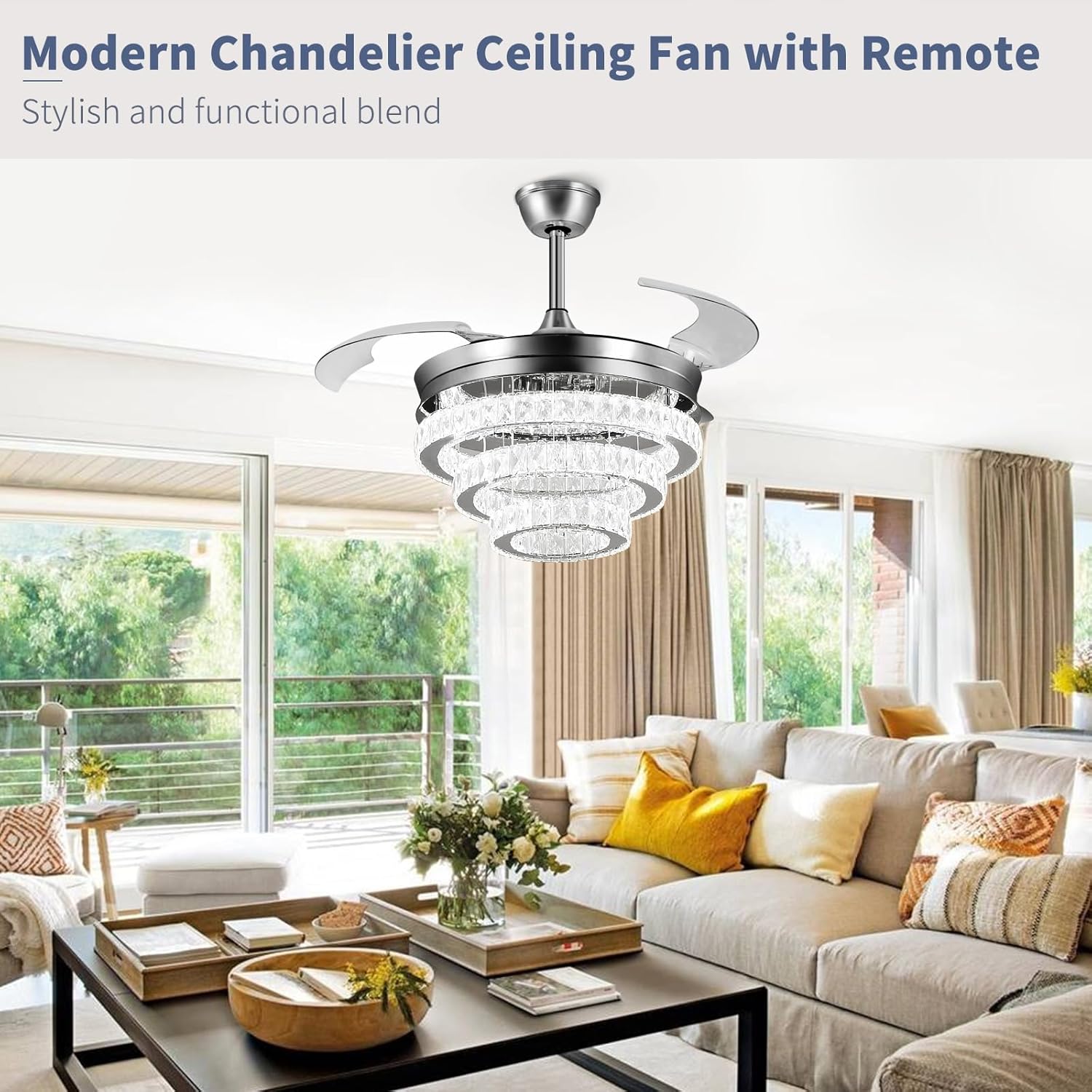 RETRACTABLE FAN BLADES: The retractable fan blades, made of high-temperature resistant and lightweight ABS material, are the perfect solution for maintaining the elegant shape of the crystal fandalier when not in use. The large volume of air driven by the fan blade is perfect for summer and also facilitates indoor hot air circulation in winter without direct blowing to you.
