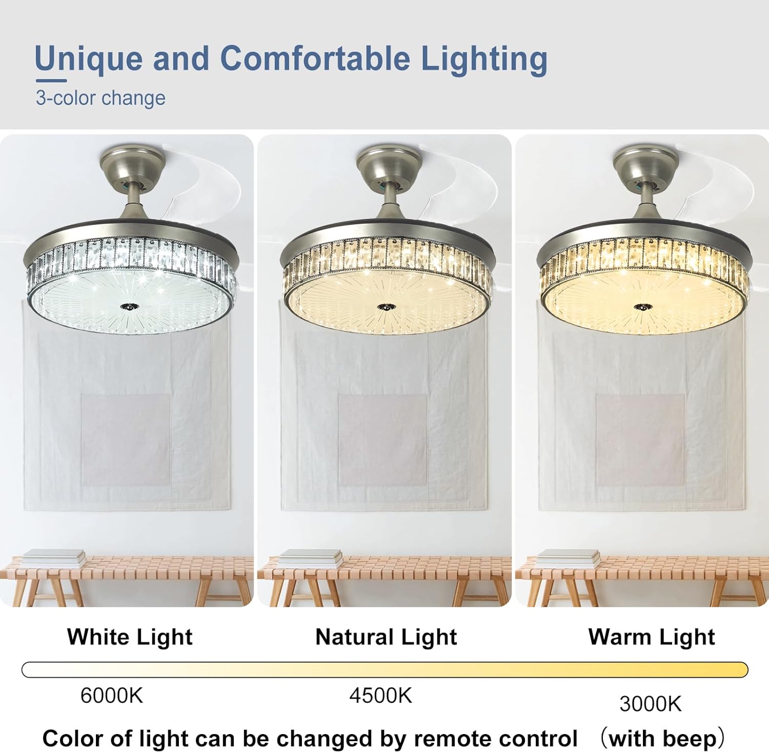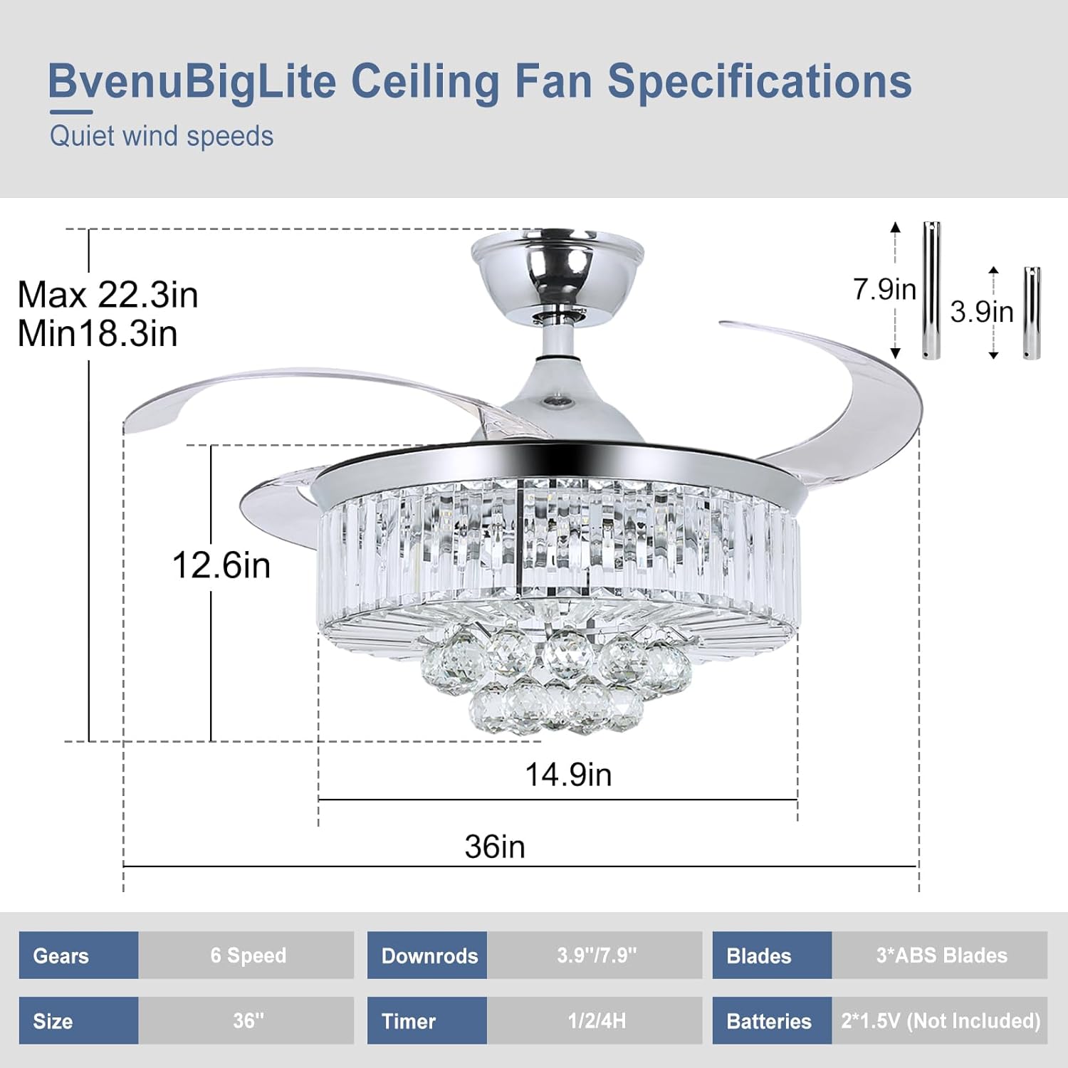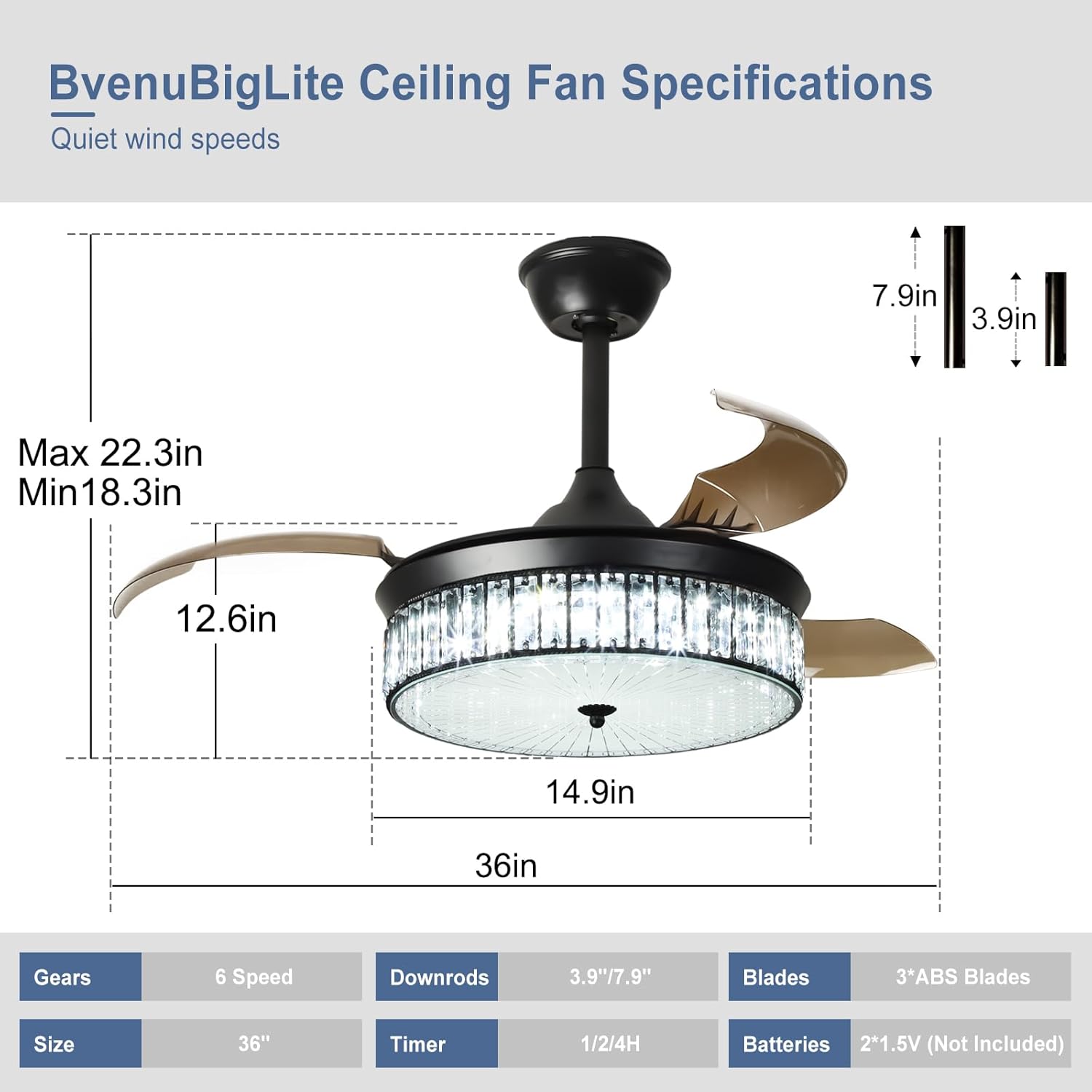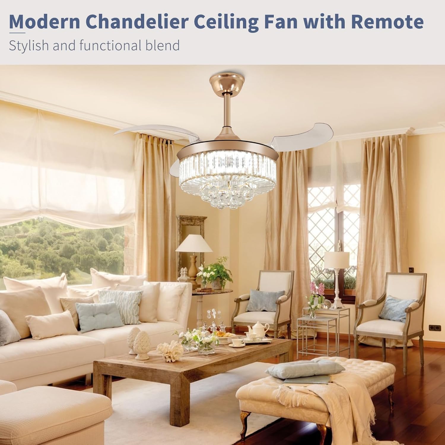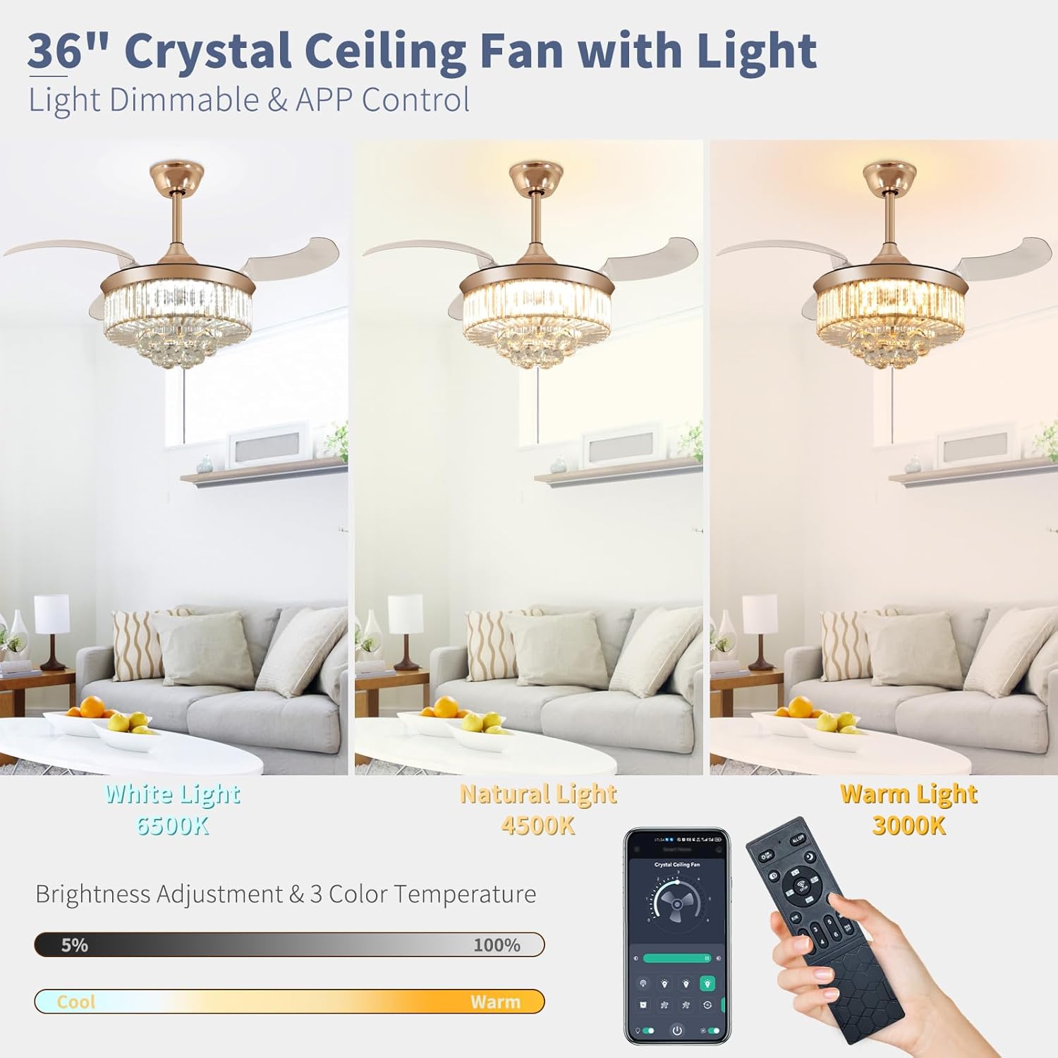 RETRACTABLE FAN BLADES: The retractable fan blades, made of high-temperature resistant and lightweight ABS material, are the perfect solution for maintaining the elegant shape of the crystal fandalier when not in use. The large volume of air driven by the fan blade is perfect for summer and also facilitates indoor hot air circulation in winter without direct blowing to you.