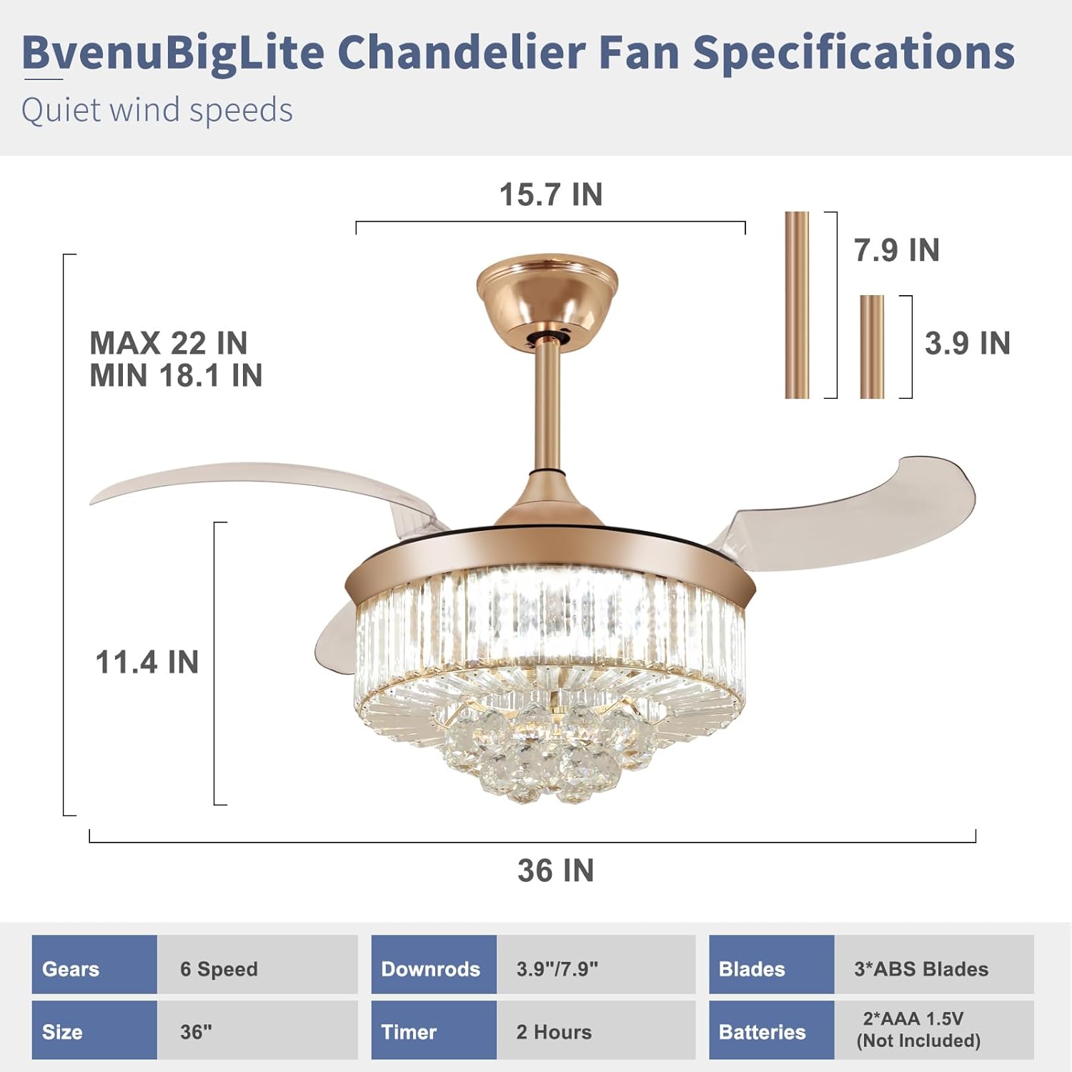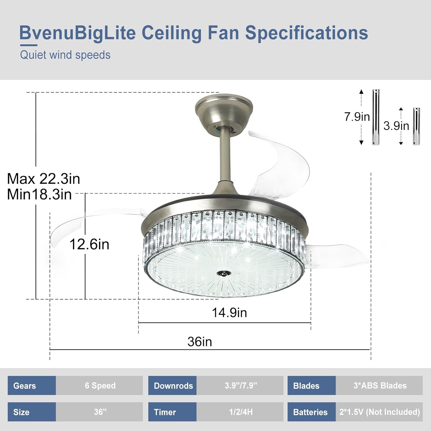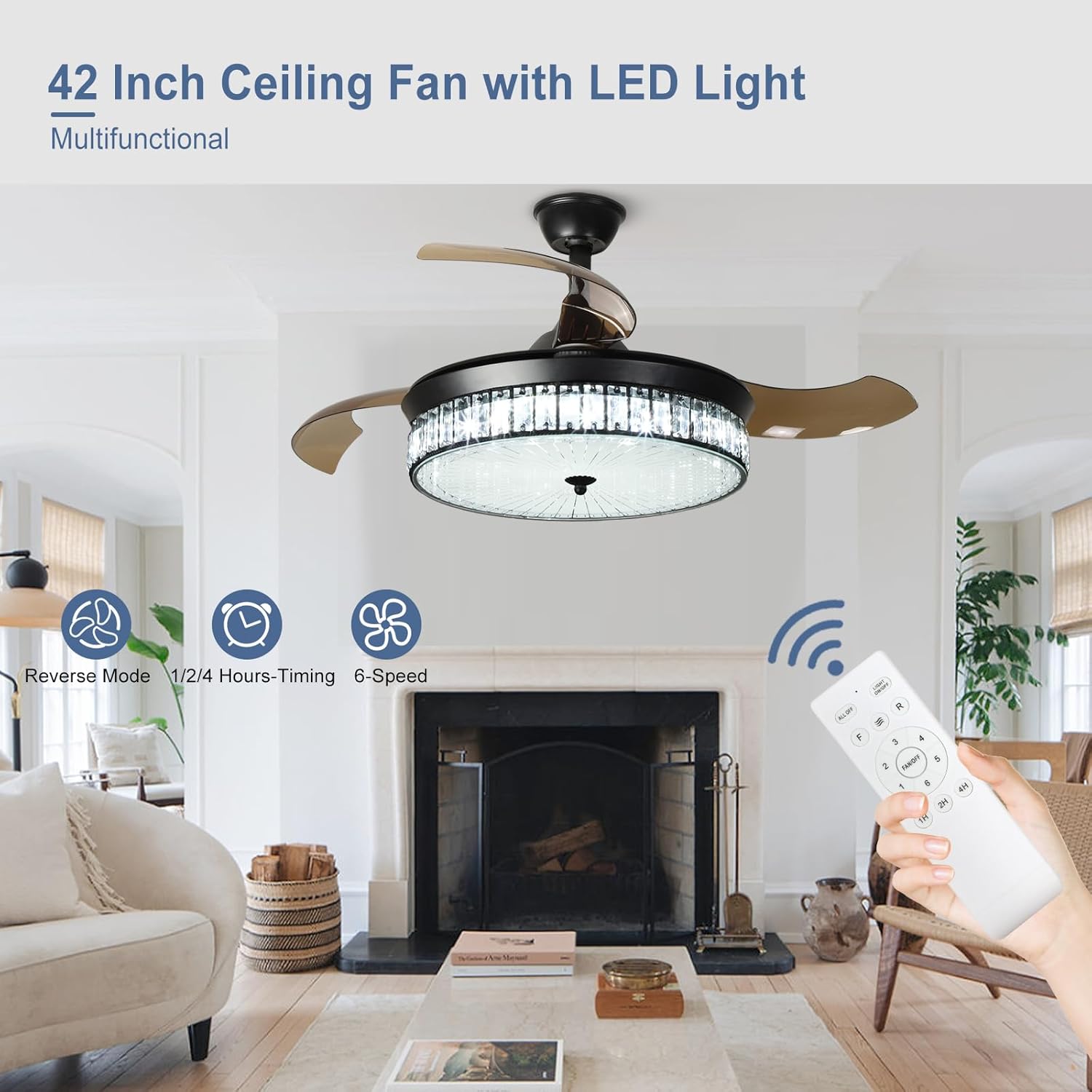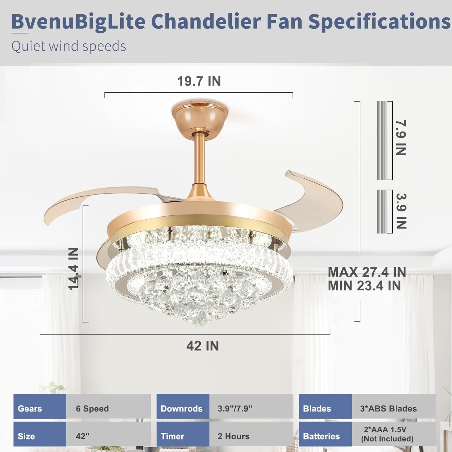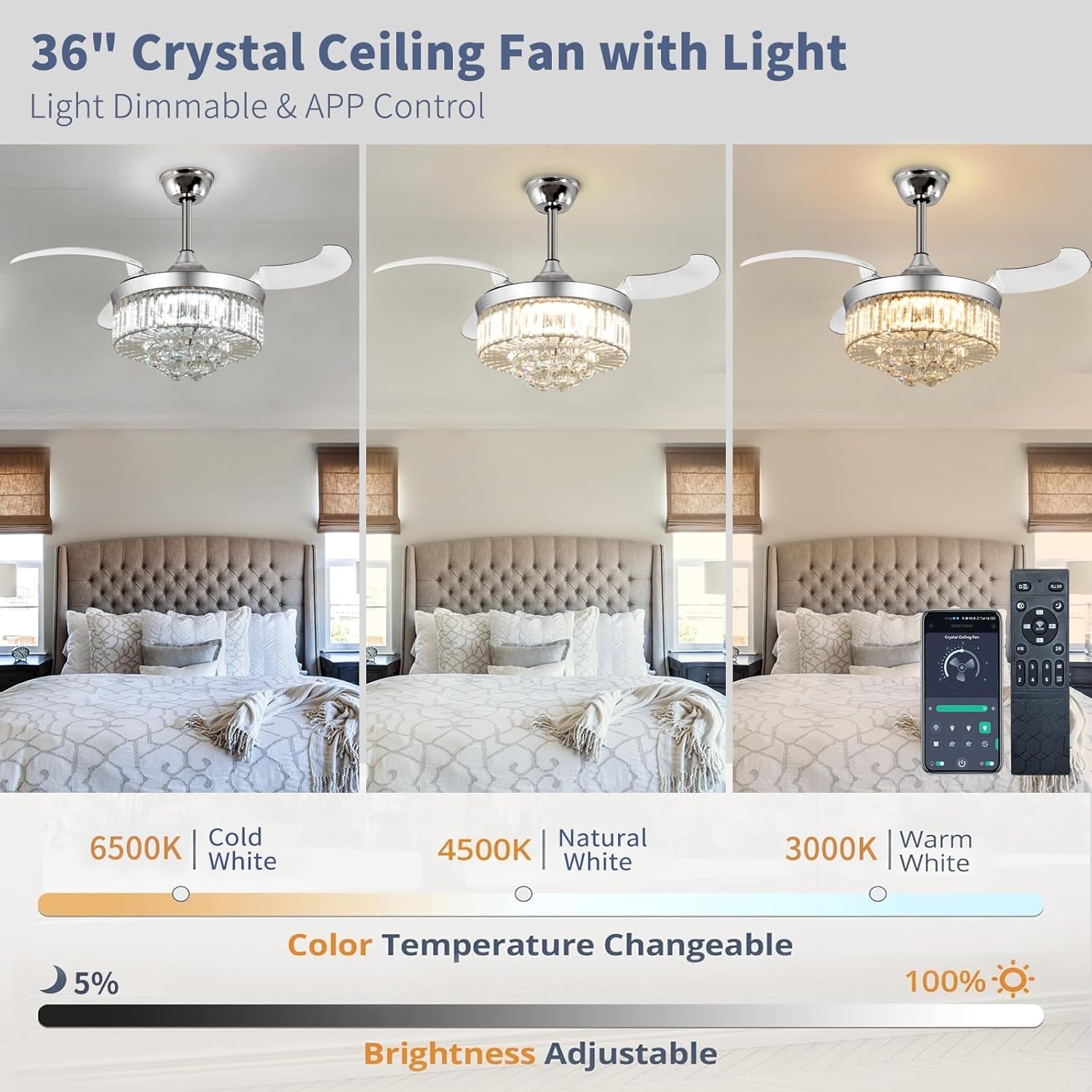 RETRACTABLE FAN BLADES: The retractable fan blades, made of high-temperature resistant and lightweight ABS material, are the perfect solution for maintaining the elegant shape of the crystal fandalier when not in use. The large volume of air driven by the fan blade is perfect for summer and also facilitates indoor hot air circulation in winter without direct blowing to you.
