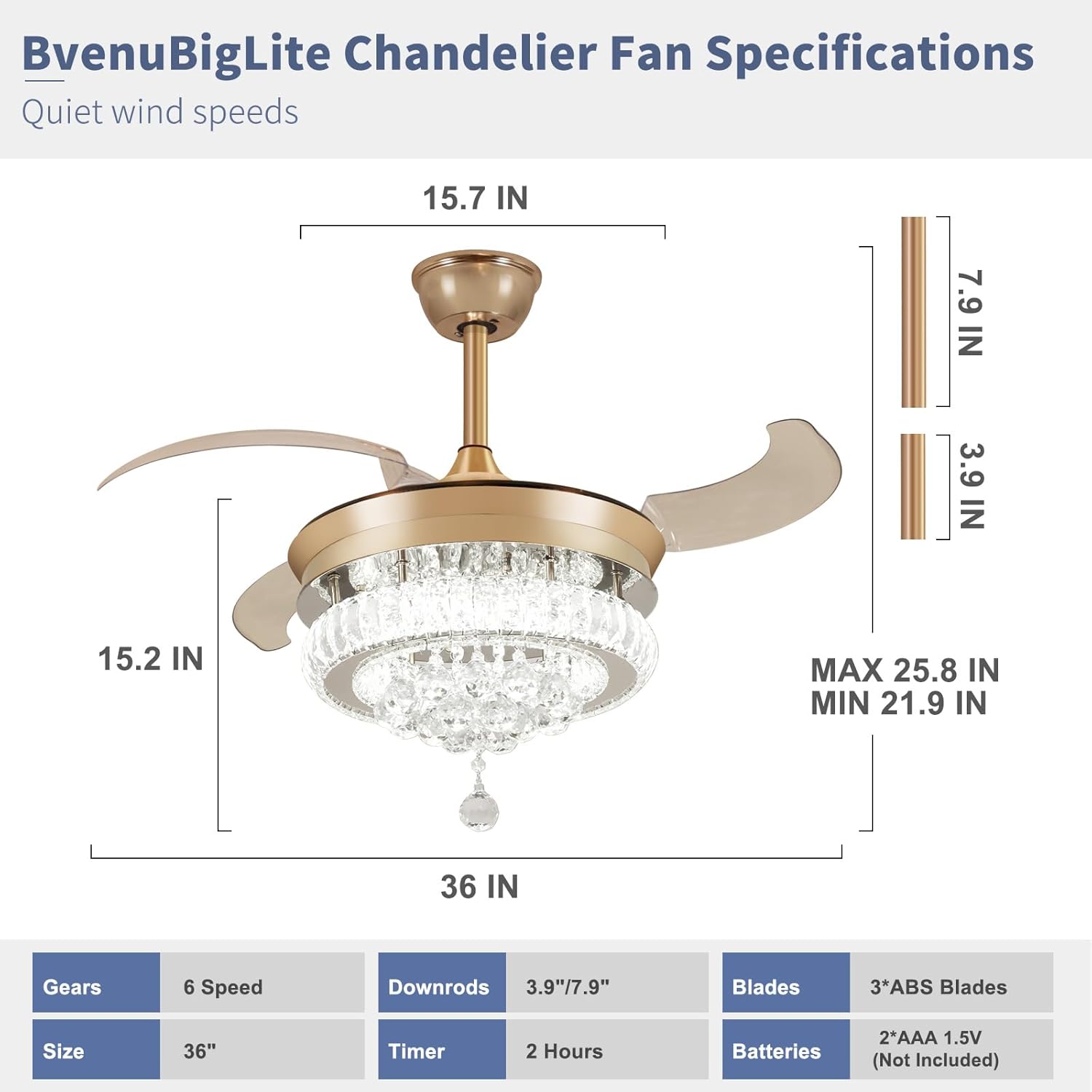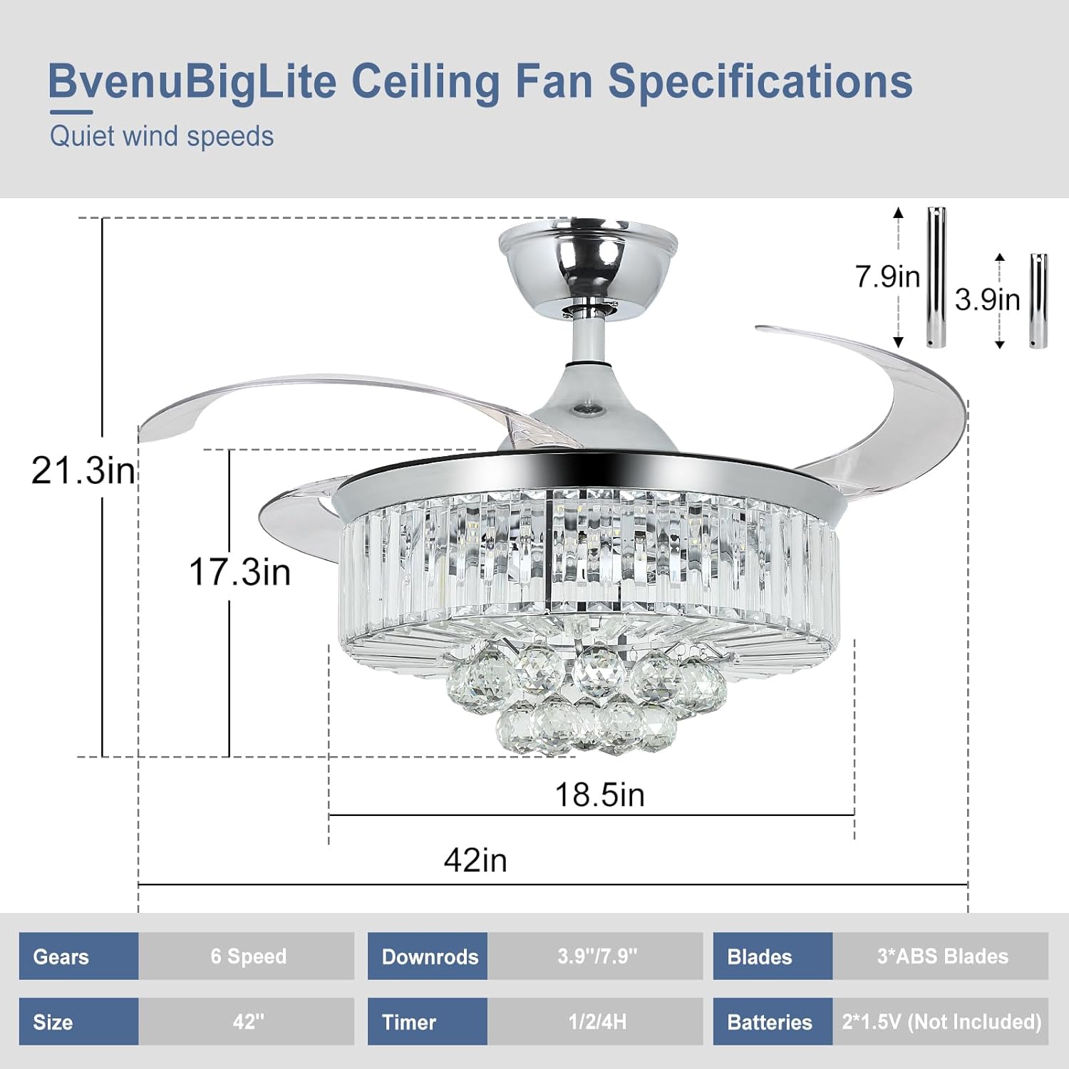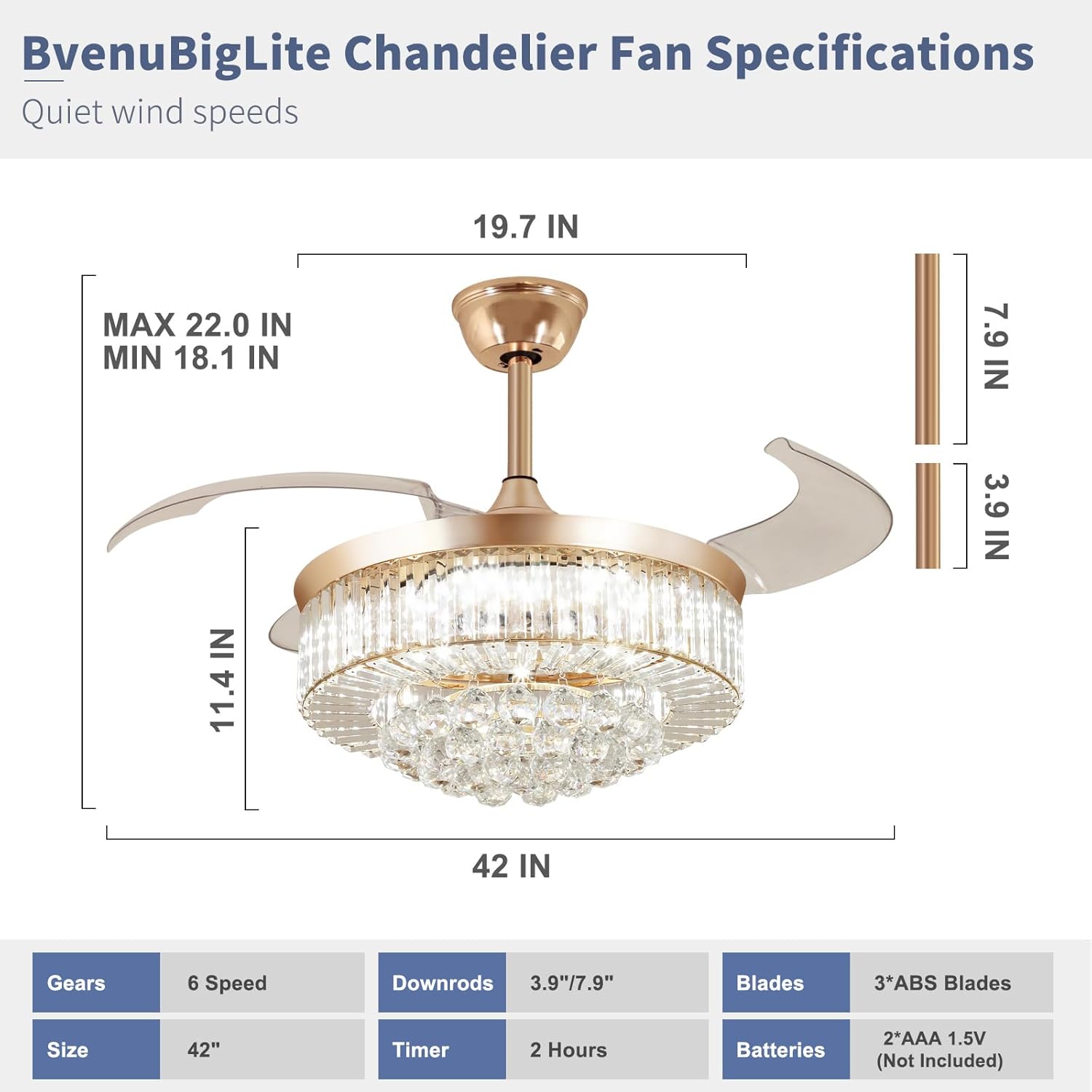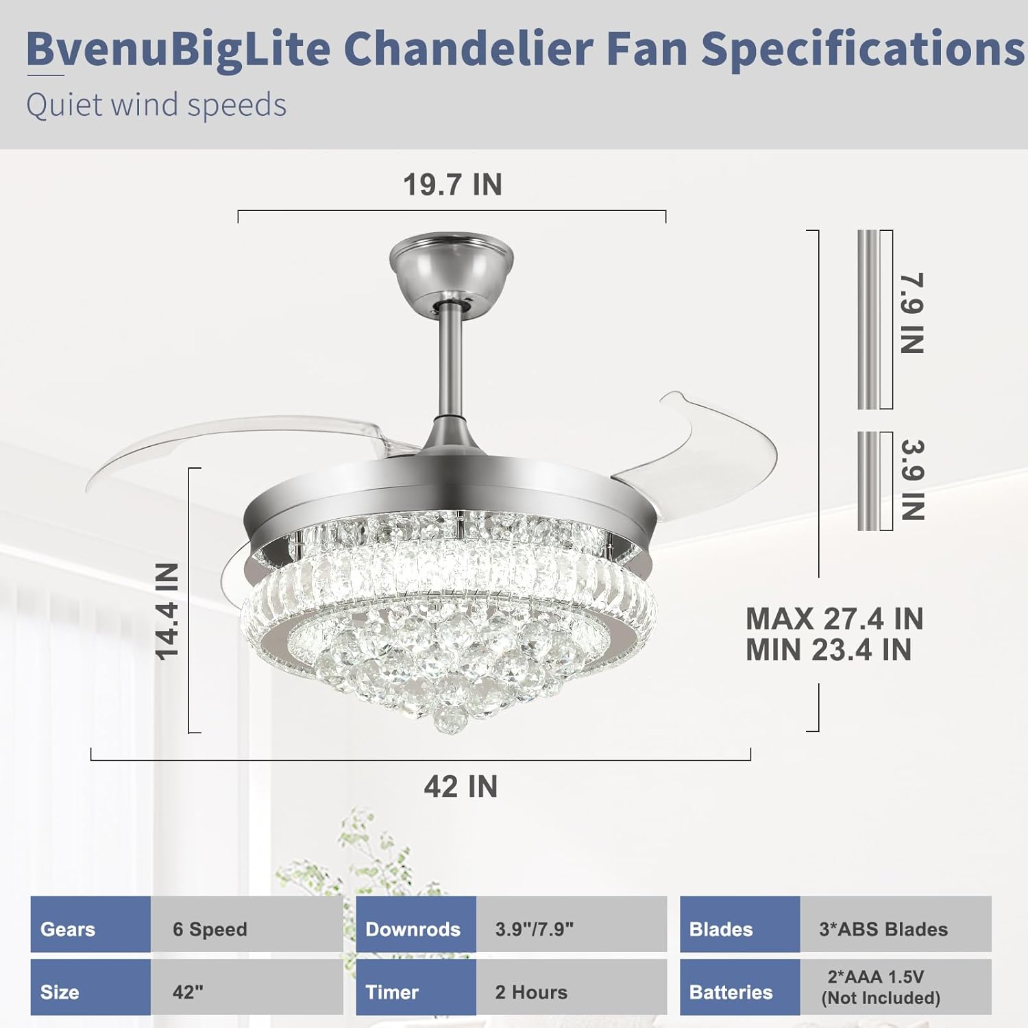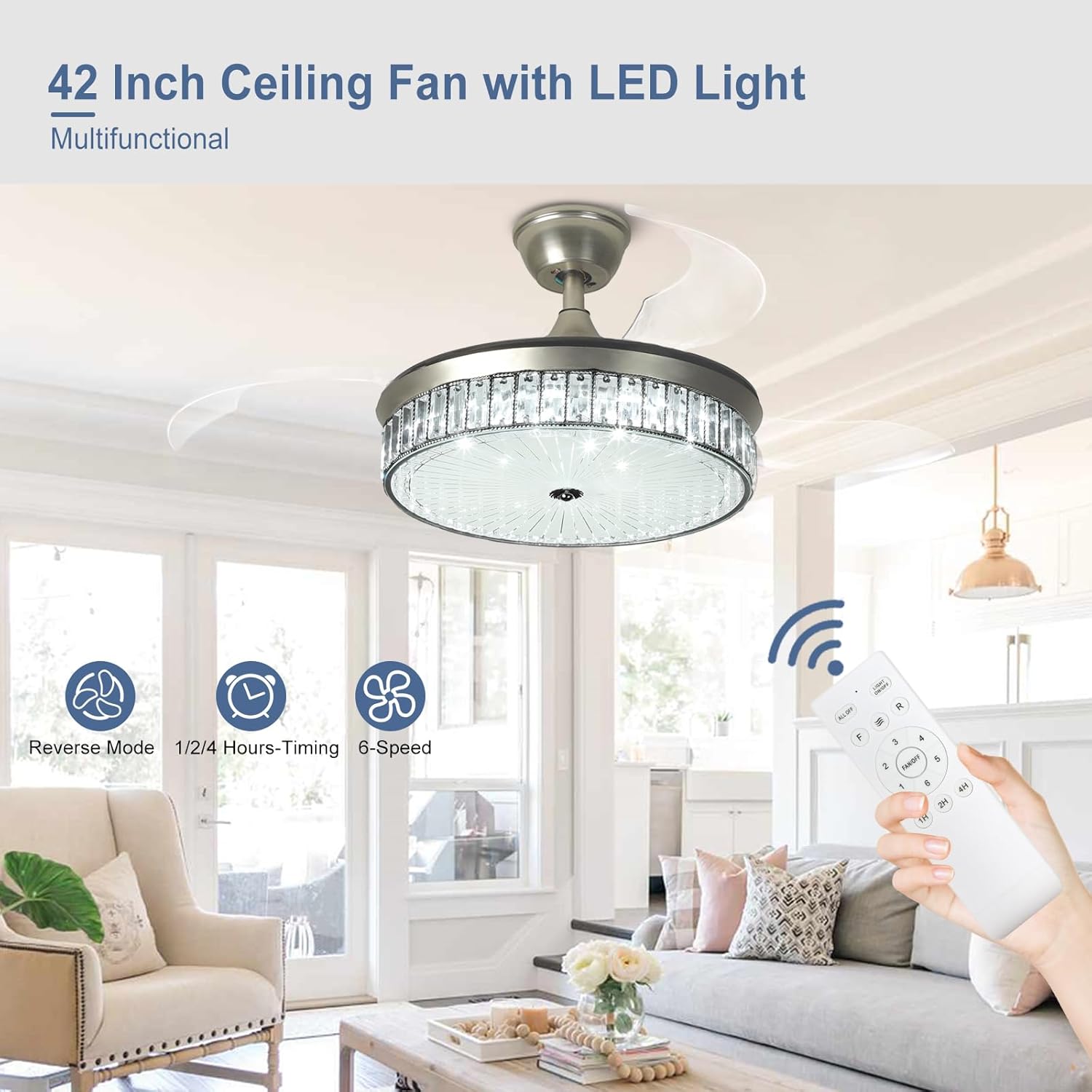 RETRACTABLE FAN BLADES: The retractable fan blades, made of high-temperature resistant and lightweight ABS material, are the perfect solution for maintaining the elegant shape of the crystal fandalier when not in use. The large volume of air driven by the fan blade is perfect for summer and also facilitates indoor hot air circulation in winter without direct blowing to you.