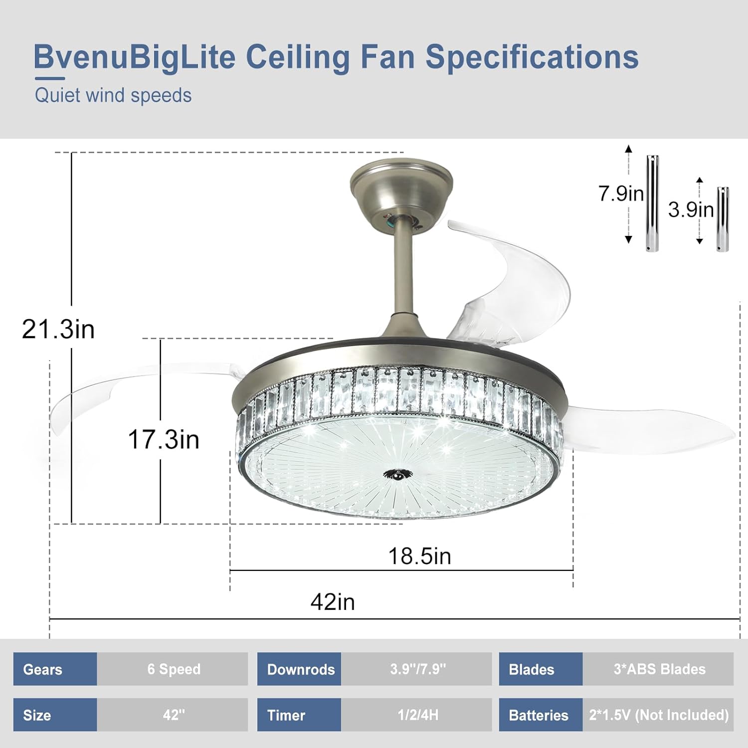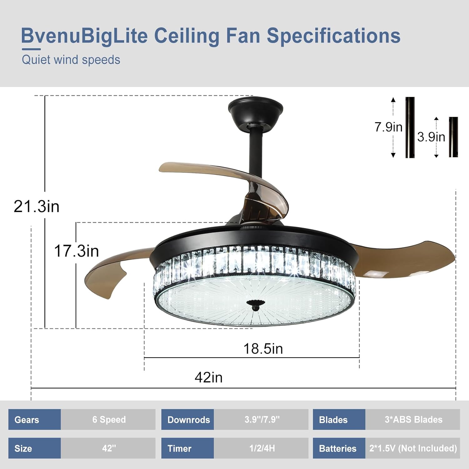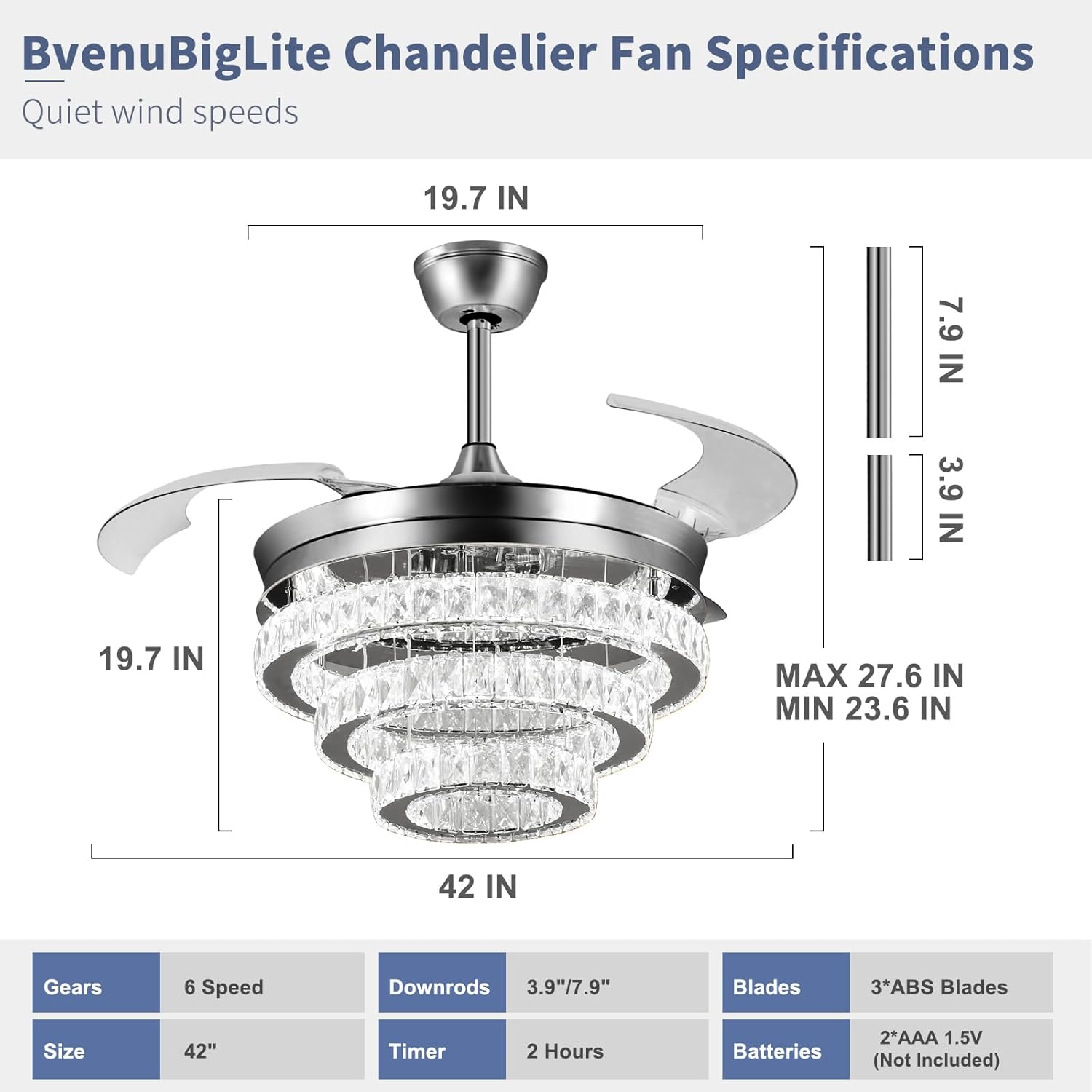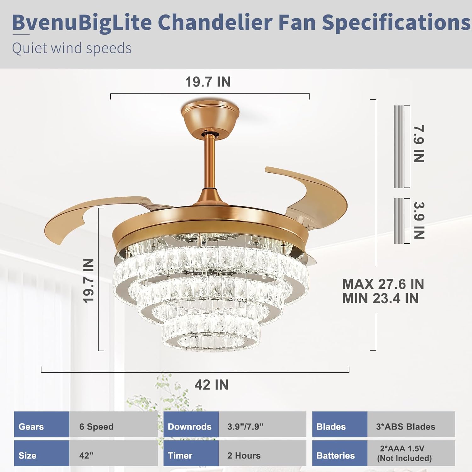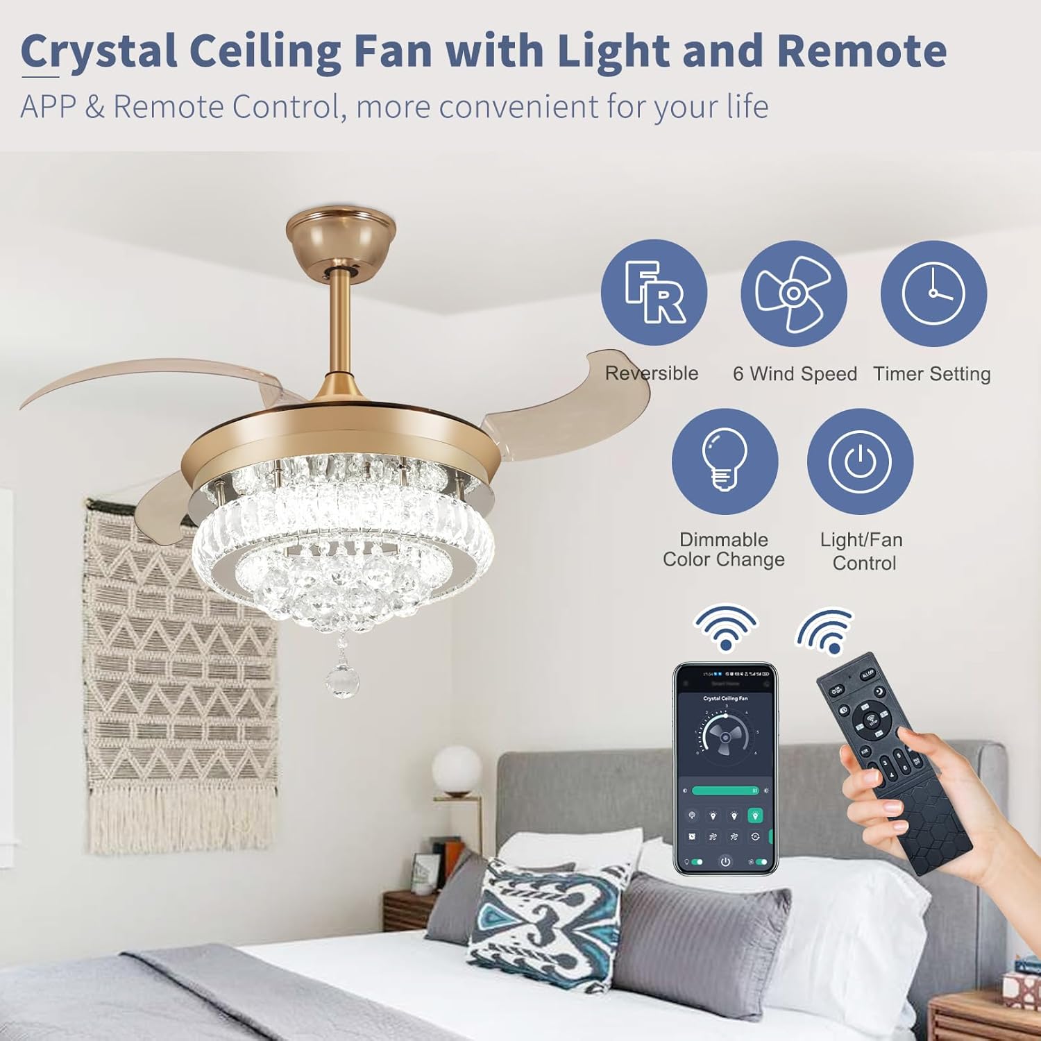 RETRACTABLE FAN BLADES: The retractable fan blades, made of high-temperature resistant and lightweight ABS material, are the perfect solution for maintaining the elegant shape of the crystal fandalier when not in use. The large volume of air driven by the fan blade is perfect for summer and also facilitates indoor hot air circulation in winter without direct blowing to you.