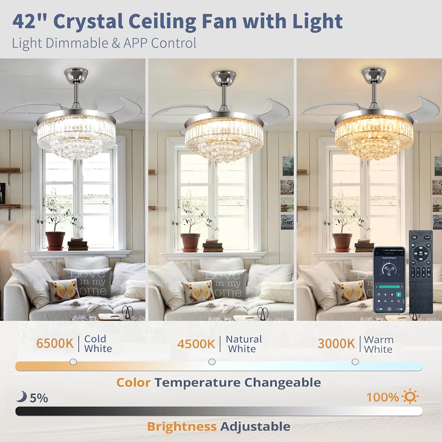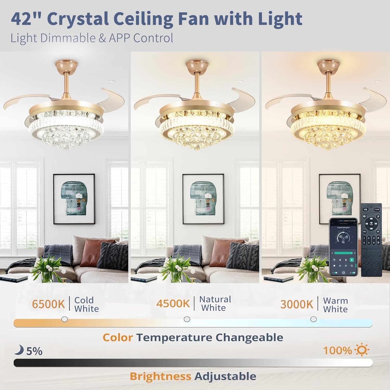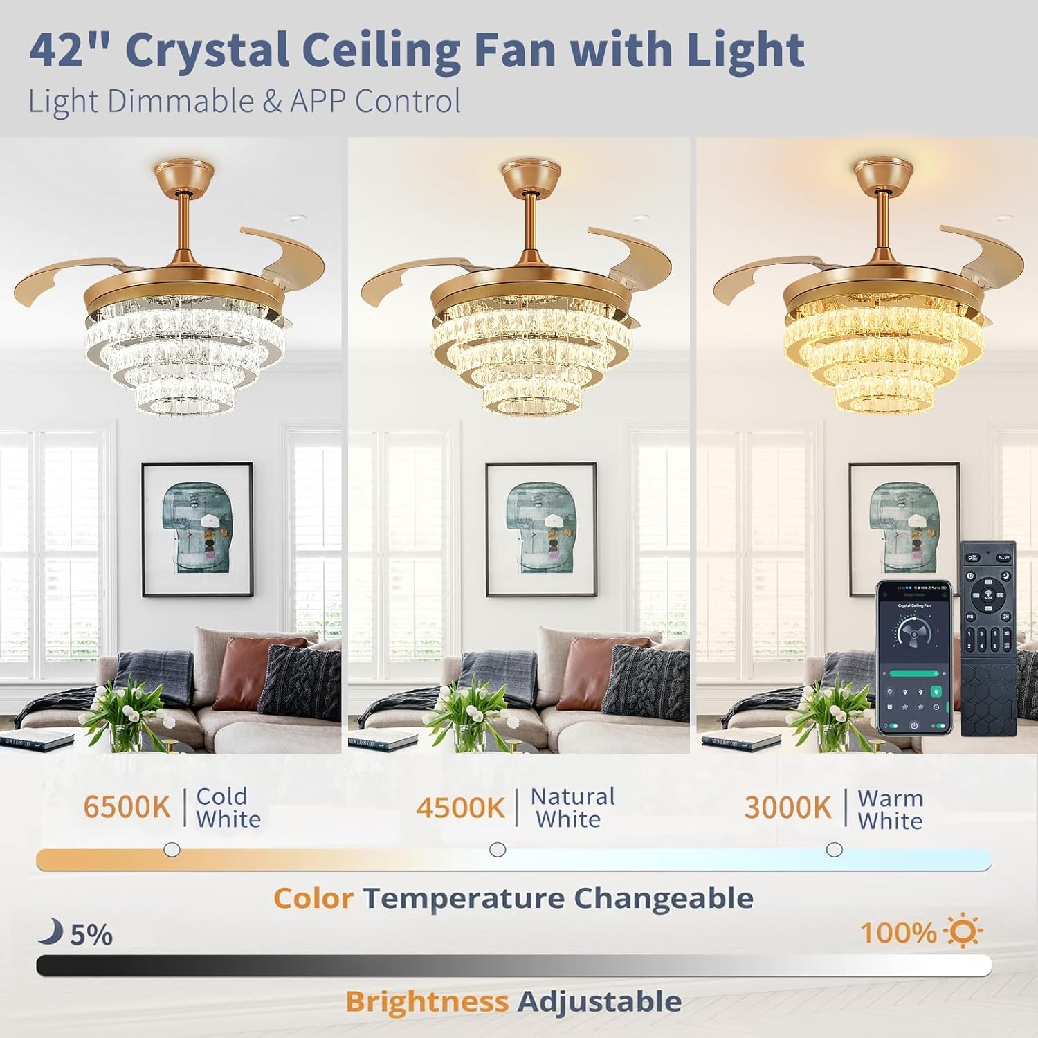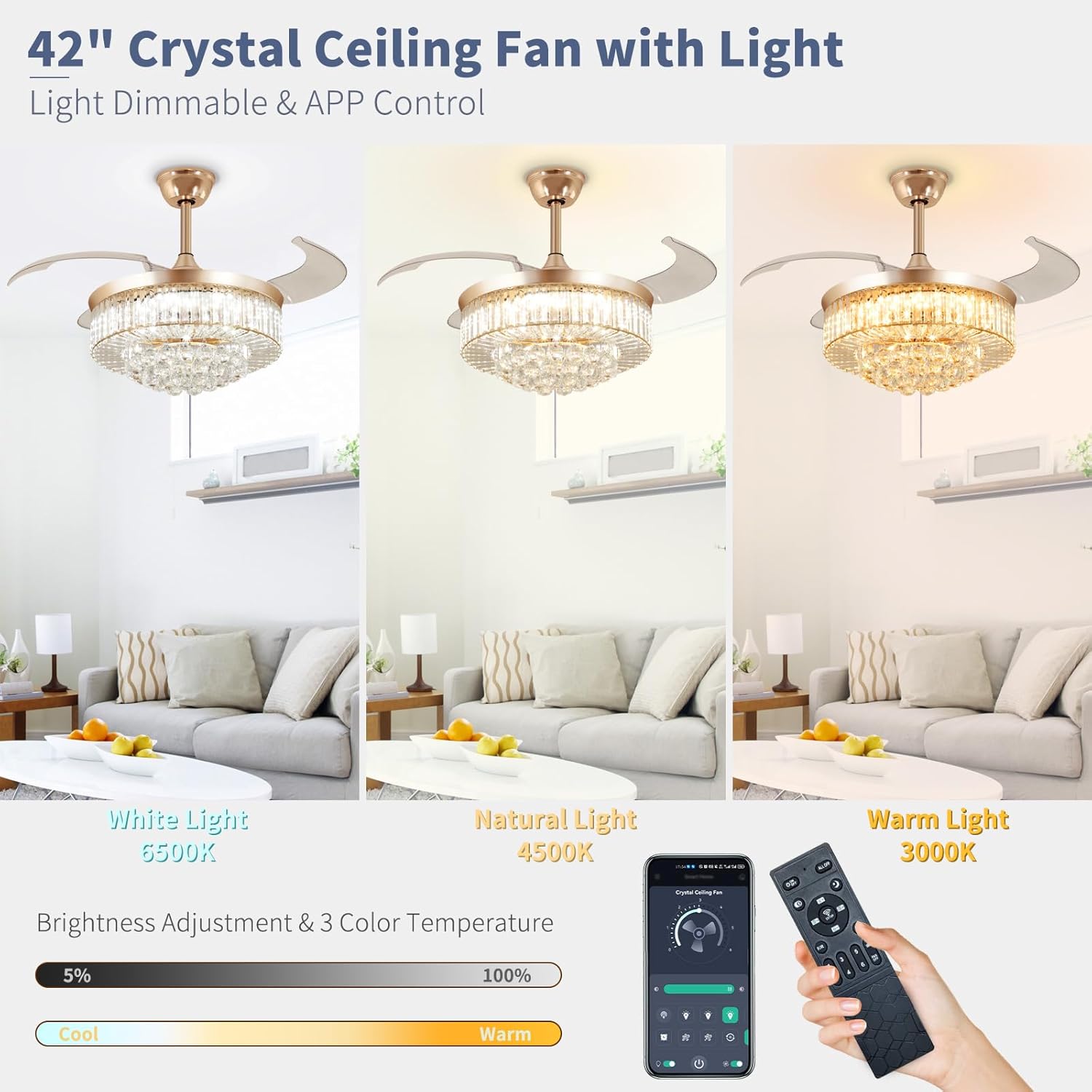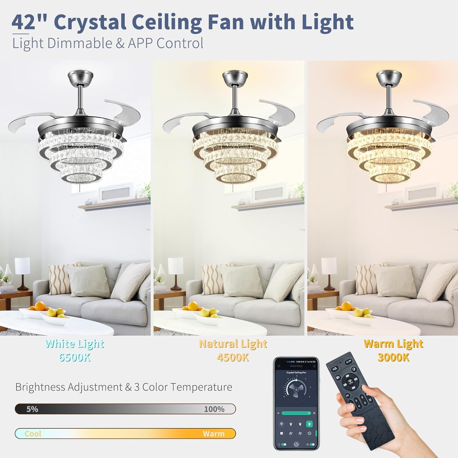 APP & REMOTE CONTROLS: The 42 inch retractable ceiling fan with light can be conveniently controlled via remote & app. Features include: timer, 6 wind speeds, natural wind, color temperature adjustment cool to warm, brightness 10%-100%, and separate fan/light control. It’s worth noting that if you install several our APP control fan lights, you can realize managing multiple devices through one app to build your smart home system!